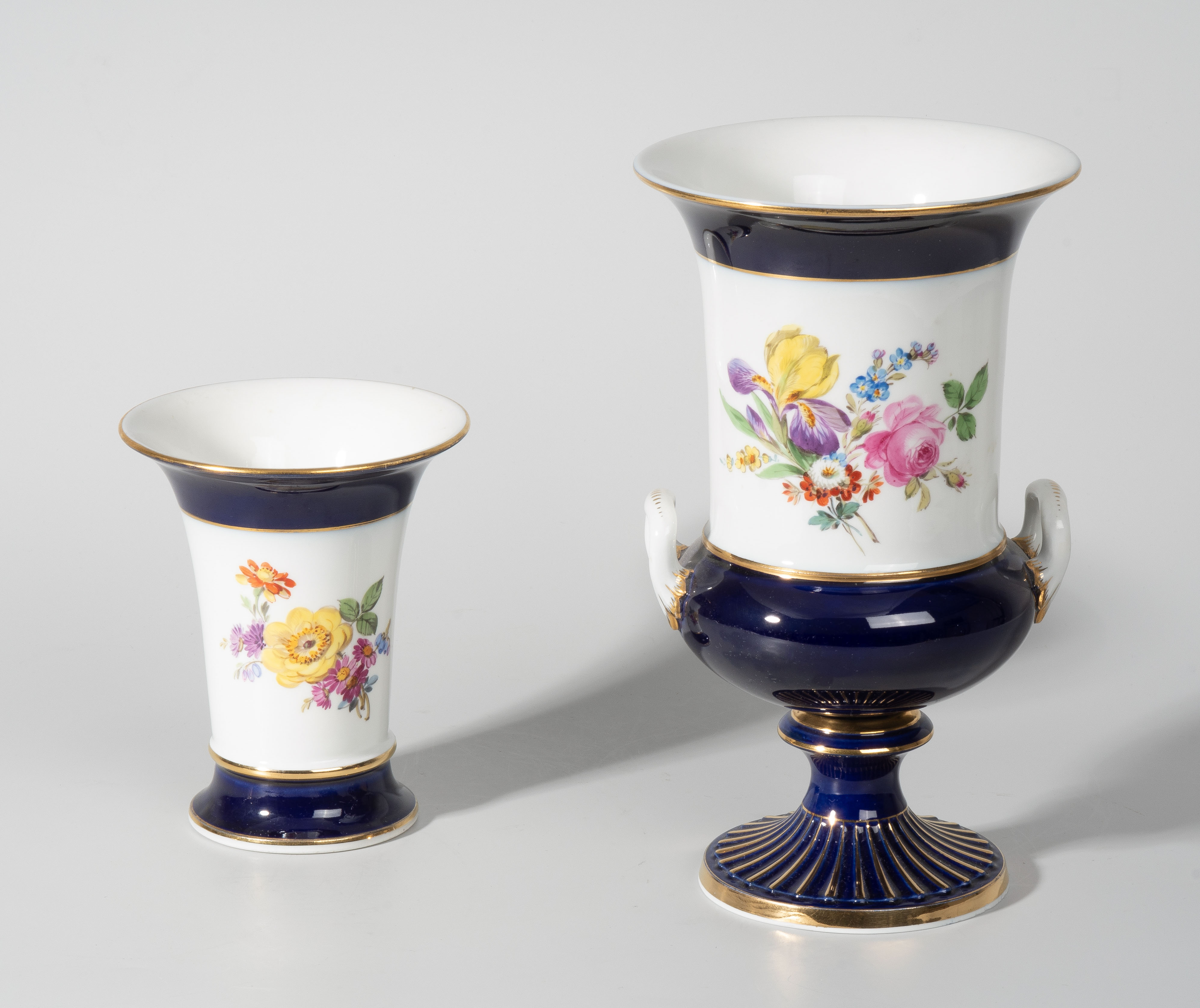 Um/nach 1900. Unterglasurblaue Schwertermarke. Polychrome Blumenmalerei. Kobaltblauer Fond. Goldstaffierung. Diverse Formen. H 14 und 24 cm.
