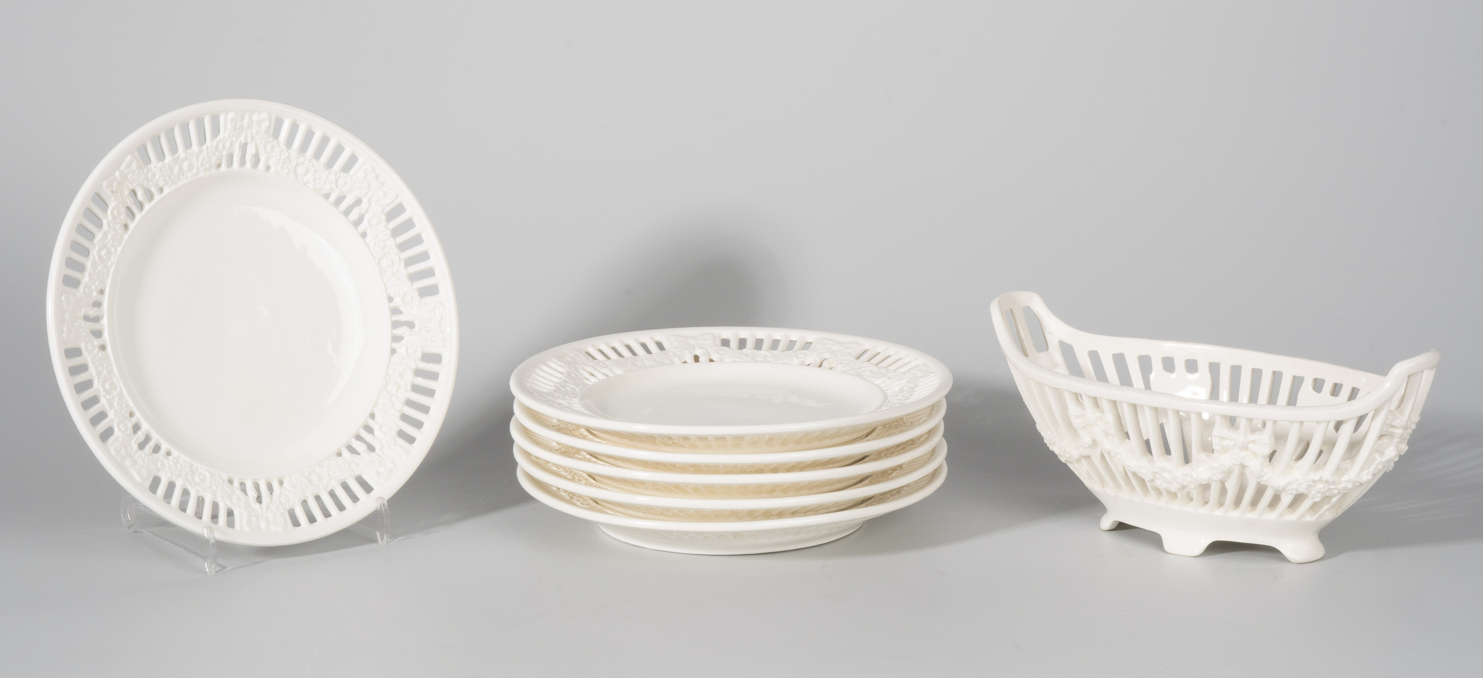 Um 1900. Steingut, weiss glasiert. Durchbruchdekor mit Blumengirlanden. D (Teller) 18,5 bzw. L (Korb) 21 cm.