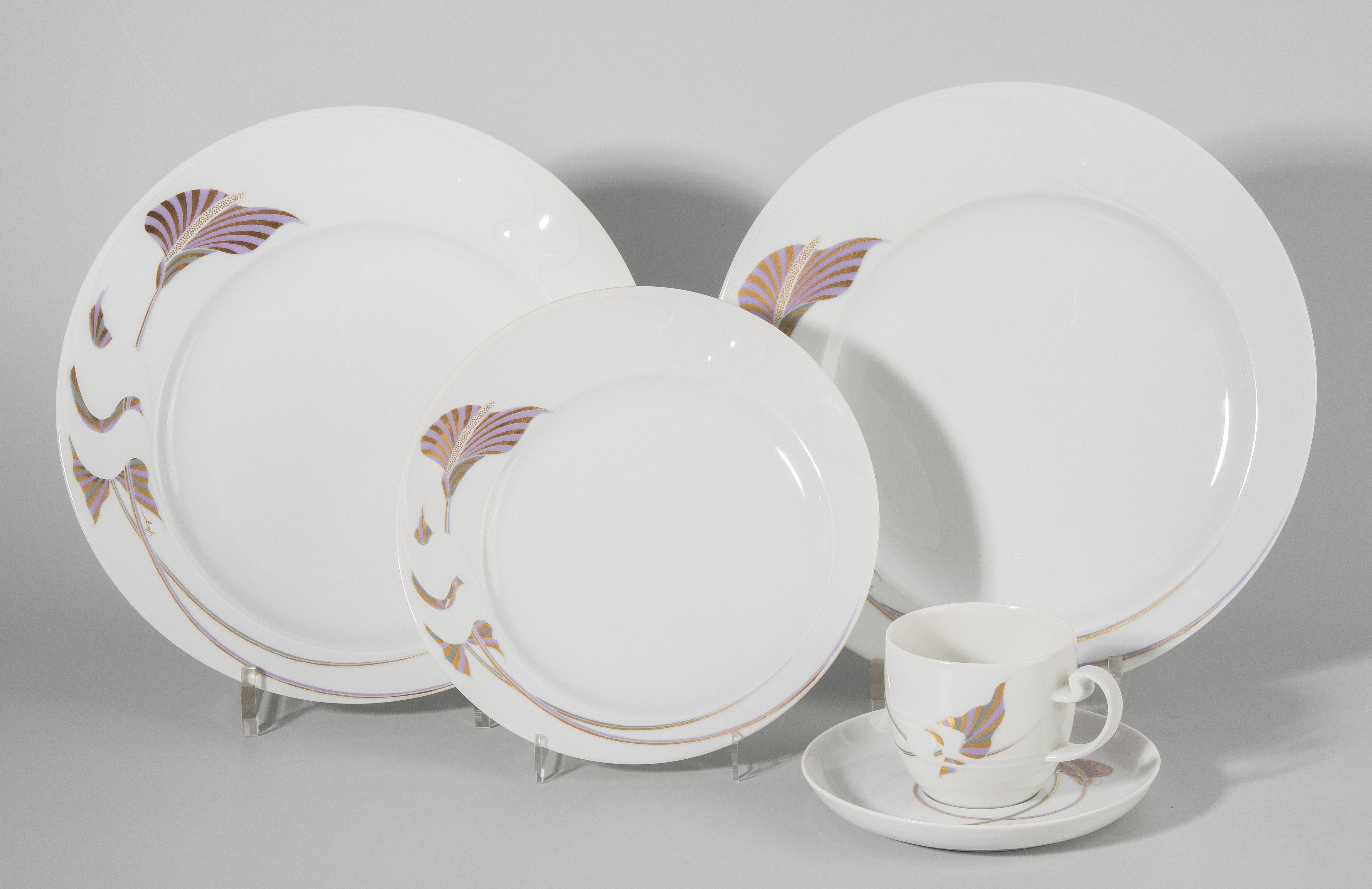2.Hälfte 20.Jh. Porzellan, Golddekor. Form "Assimetria", Dekor "Goldblume" und "Weissgold". Bestand: 4 Fleischteller (D 26 cm), 2 Suppentassen, 3 Suppenteller, 6 flache Teller, 6 Dessertteller (D 20 cm) und Tasse mit Untertasse.