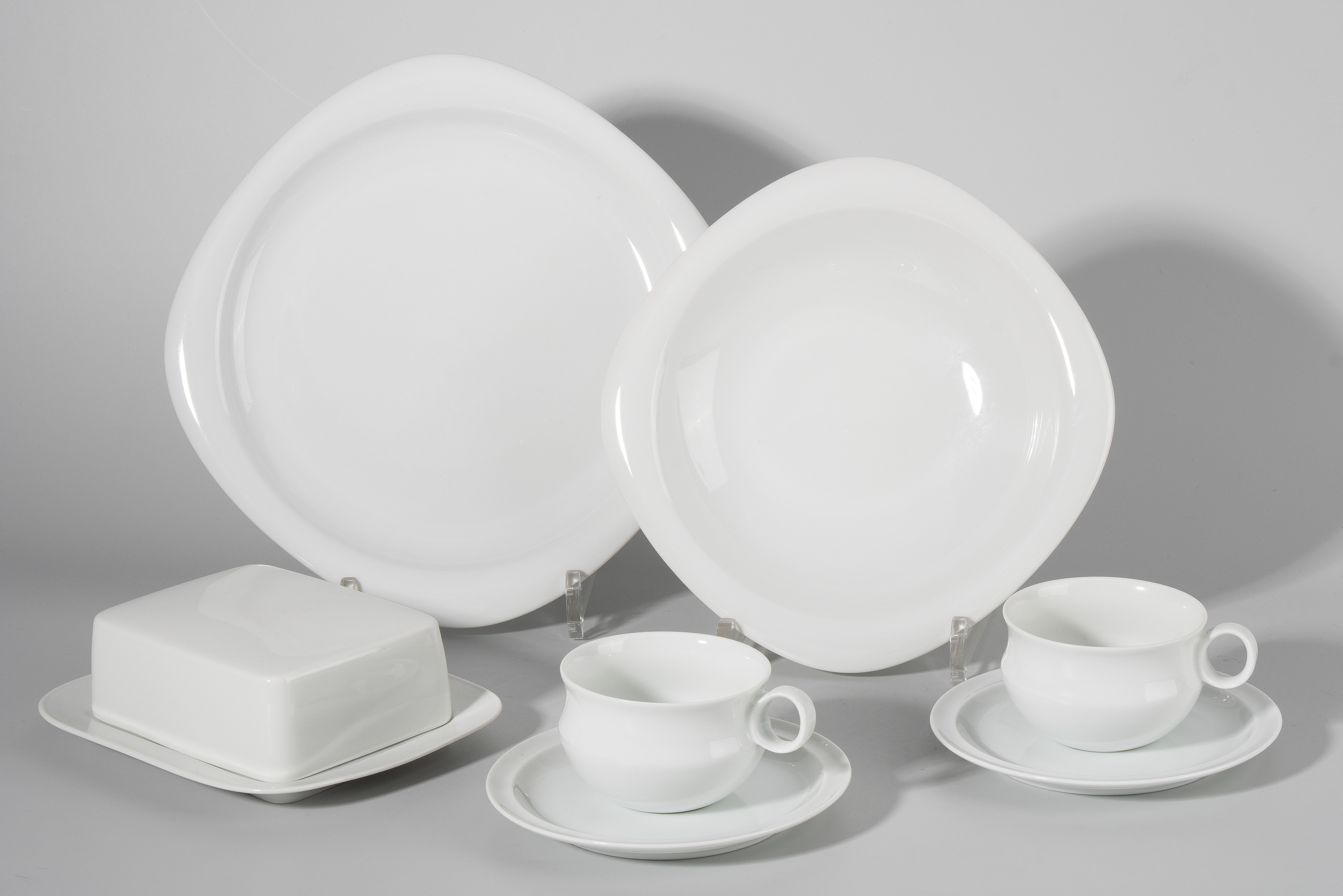 2.Hälfte 20.Jh. Porzellan weiss. Form "Suomi". Bestand: 6 Tassen mit Untertassen, Butterdose, 5 Suppenteller und 12 gemuldete Teller (D 18 cm).