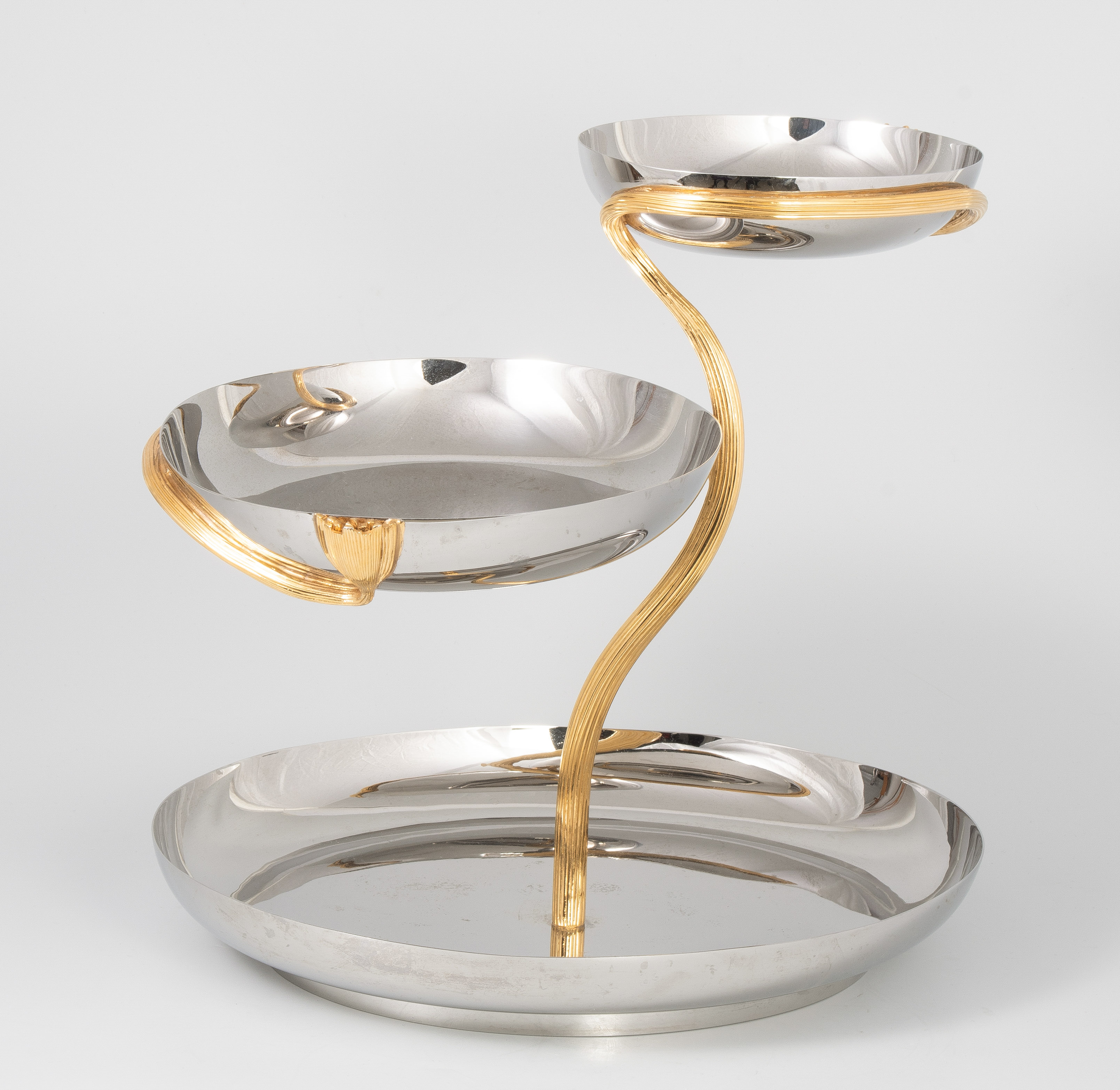 Edelstahl und Vergoldung. Aus der Serie "Deco Leaves". In der Mitte grosse Schale mit einem Schaft in Form von stilisierten Blättern, 2 ovale Schalen tragend. H 30 cm.