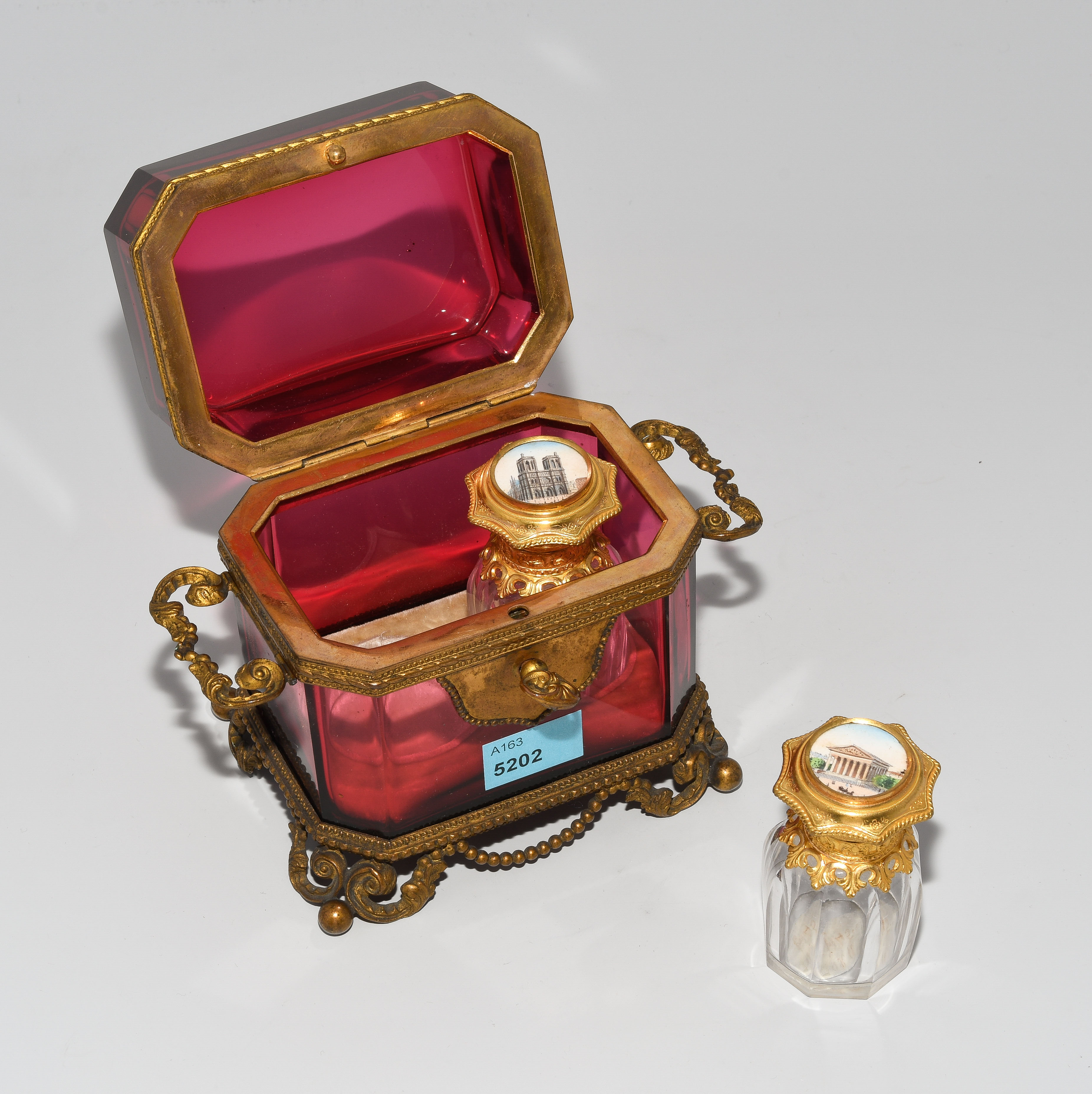 Frankreich, Ende 19.Jh. Rechteckige Dose aus Rubinglas mit Messingmontierung. Darin zwei Flakons aus farblosem Glas mit Messingmontur, in den Deckeln eingelegte Miniaturmalereien. H 11,5 u. 6,5 cm.