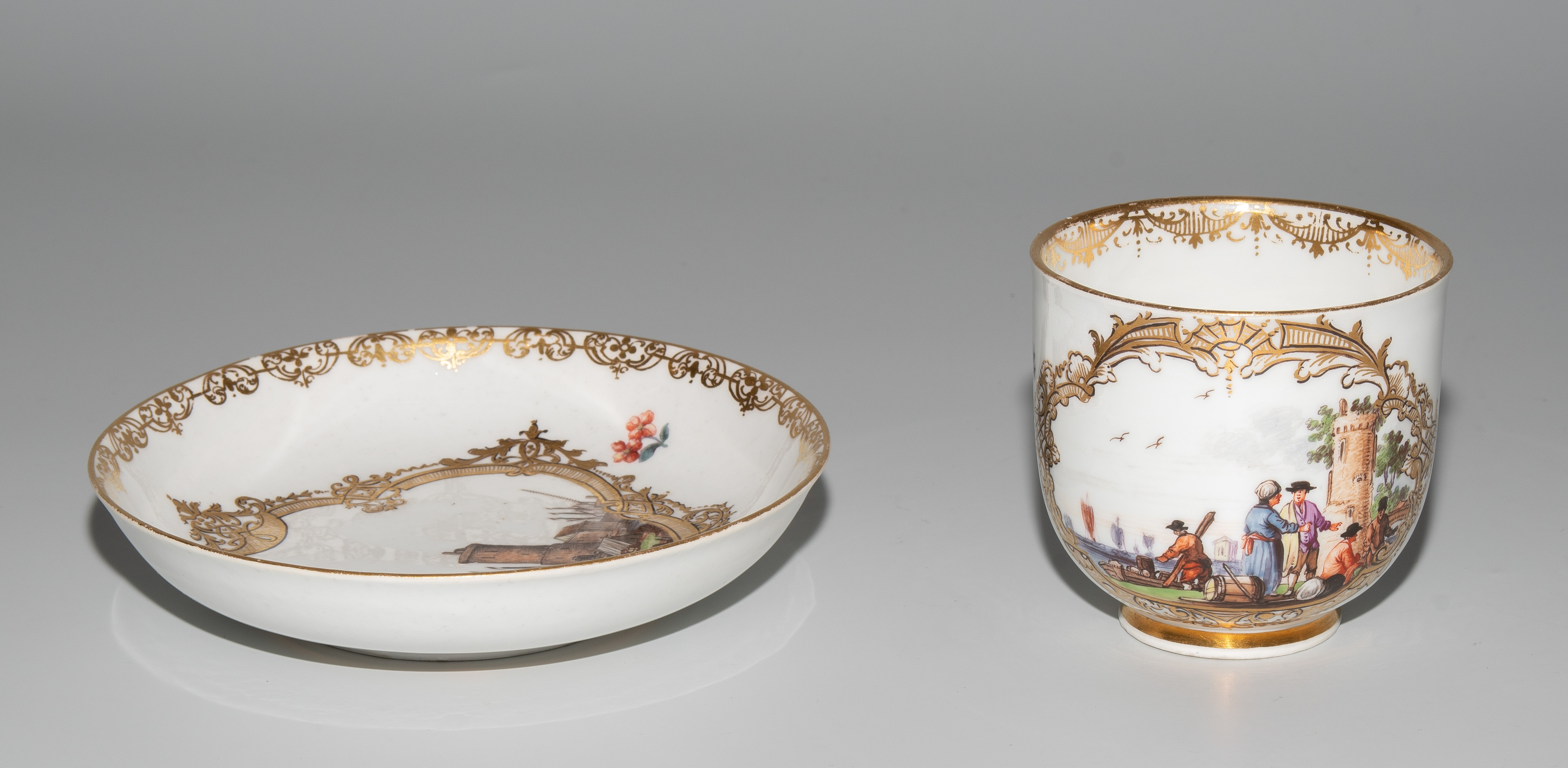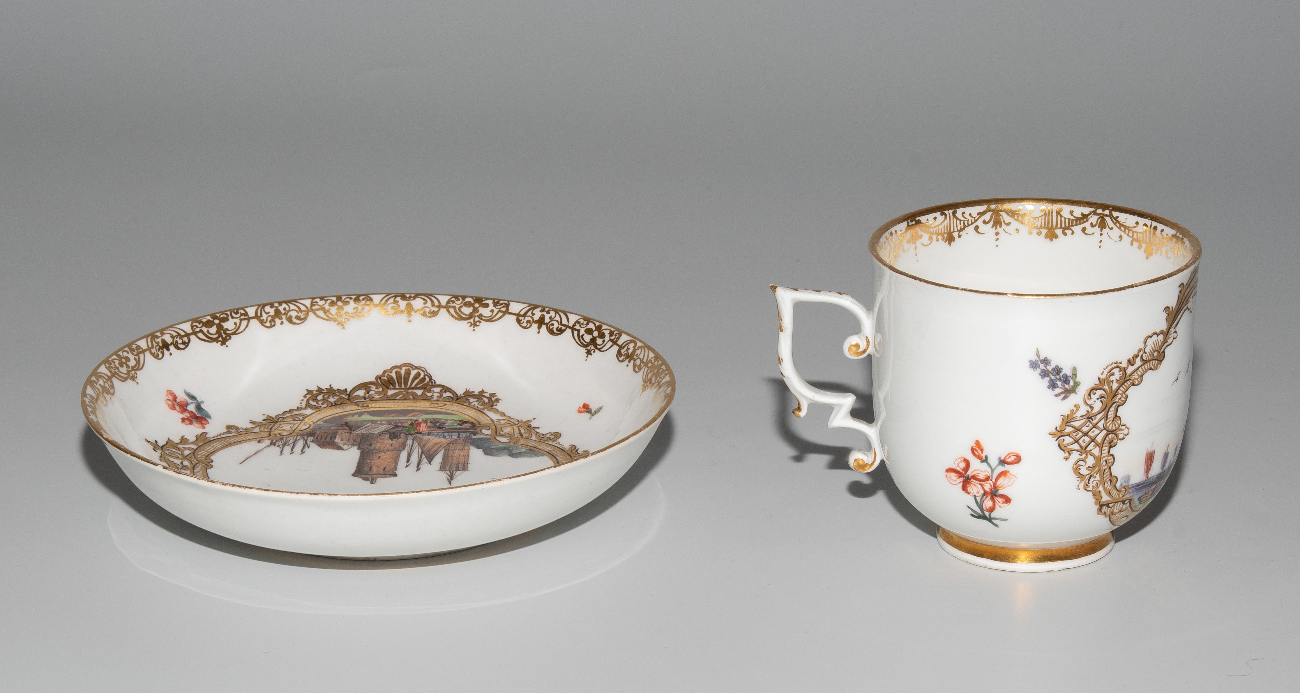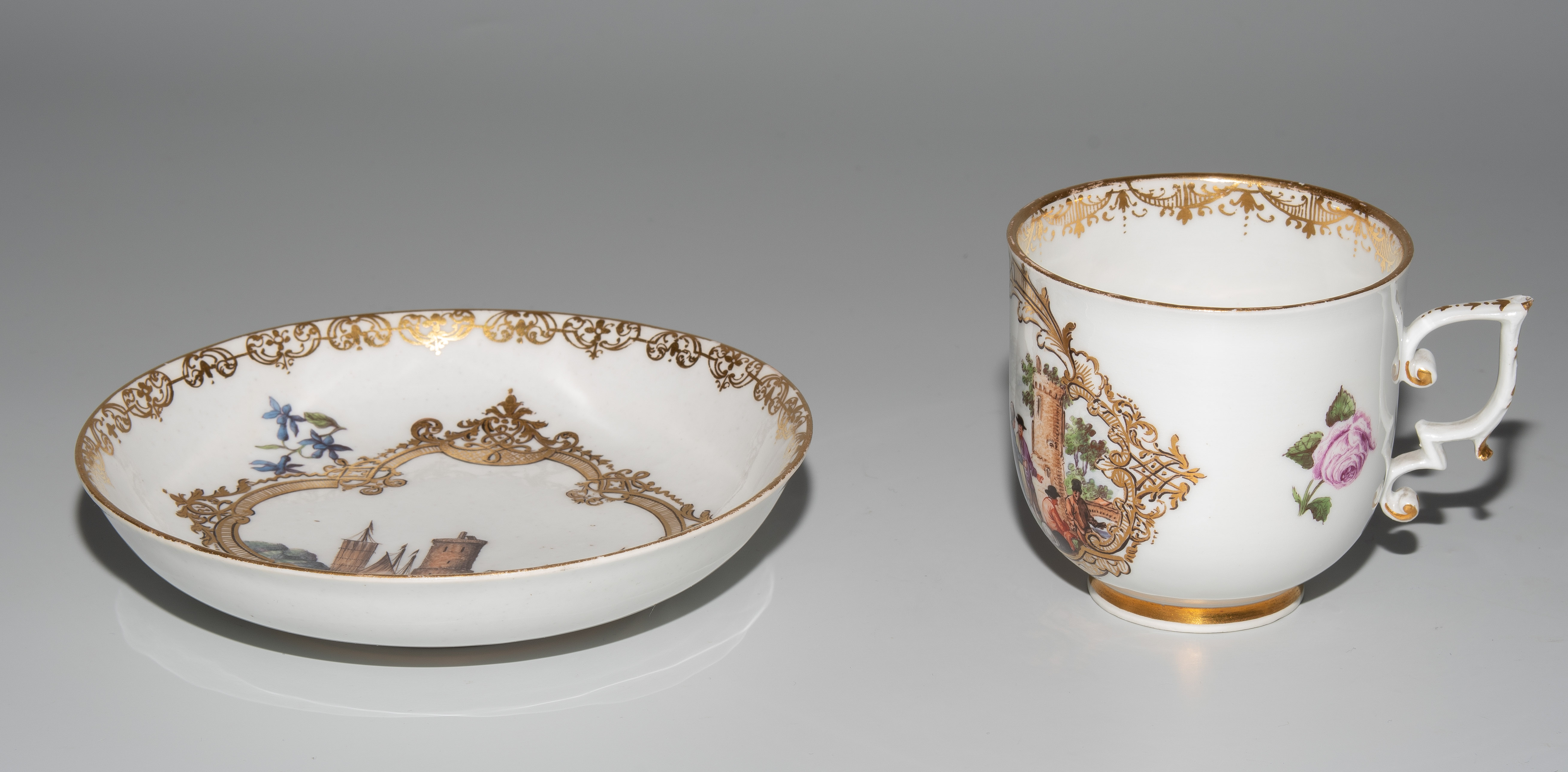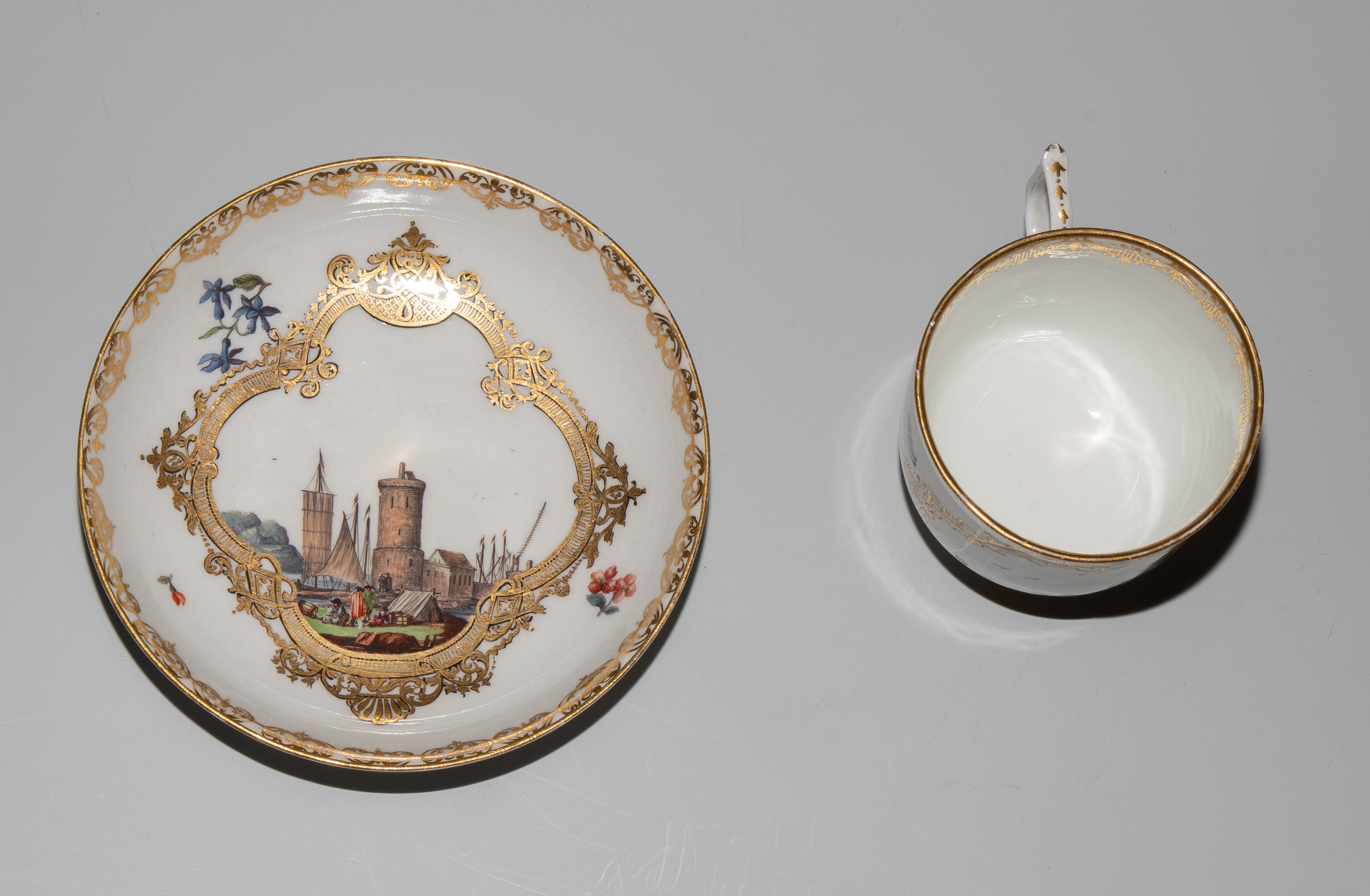 Um 1745/50. Porzellan. Unterglasurblaue Schwertermarke, Pressnummer 6 (Tasse), Vergolderzeichen A (Tasse) bzw. 82 (U'tasse). Standringe vergoldet, Henkel teilvergoldet. Farbige Kauffahrteiszenen in vierpassigen Goldkartuschen mit Braunkontur, umgeben von Streublumen. Goldspitzenmordüren. H 6,8 cm, D 13,2 cm.