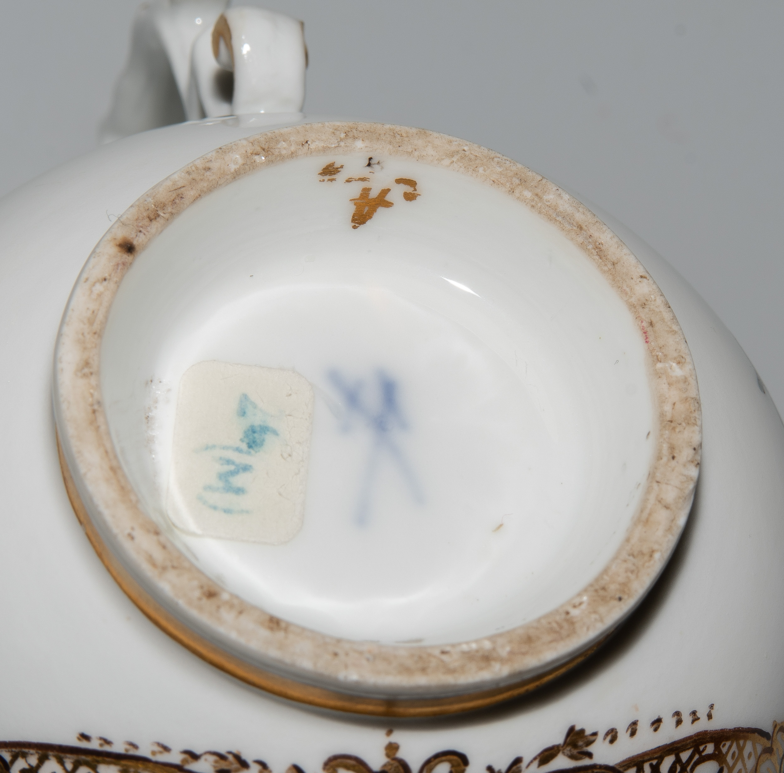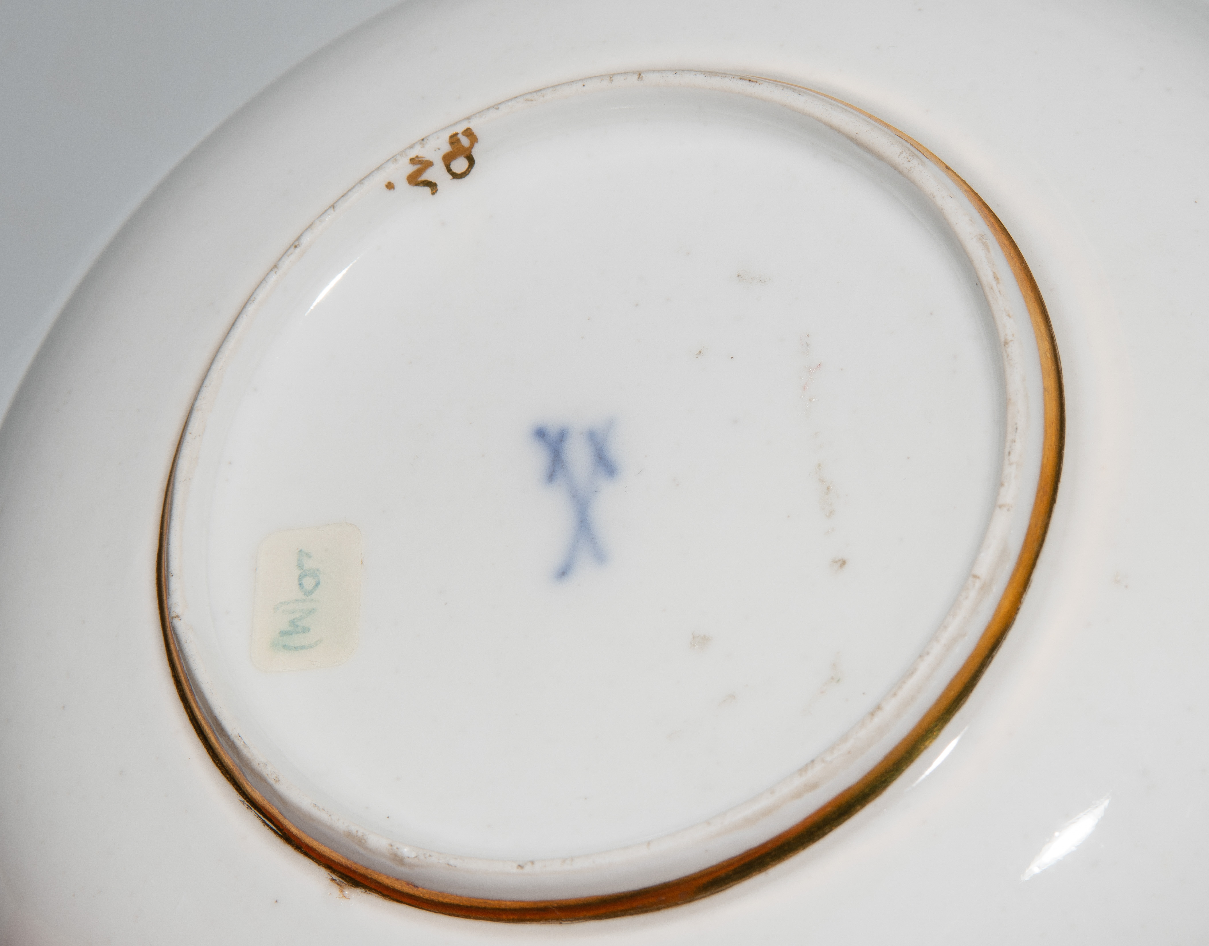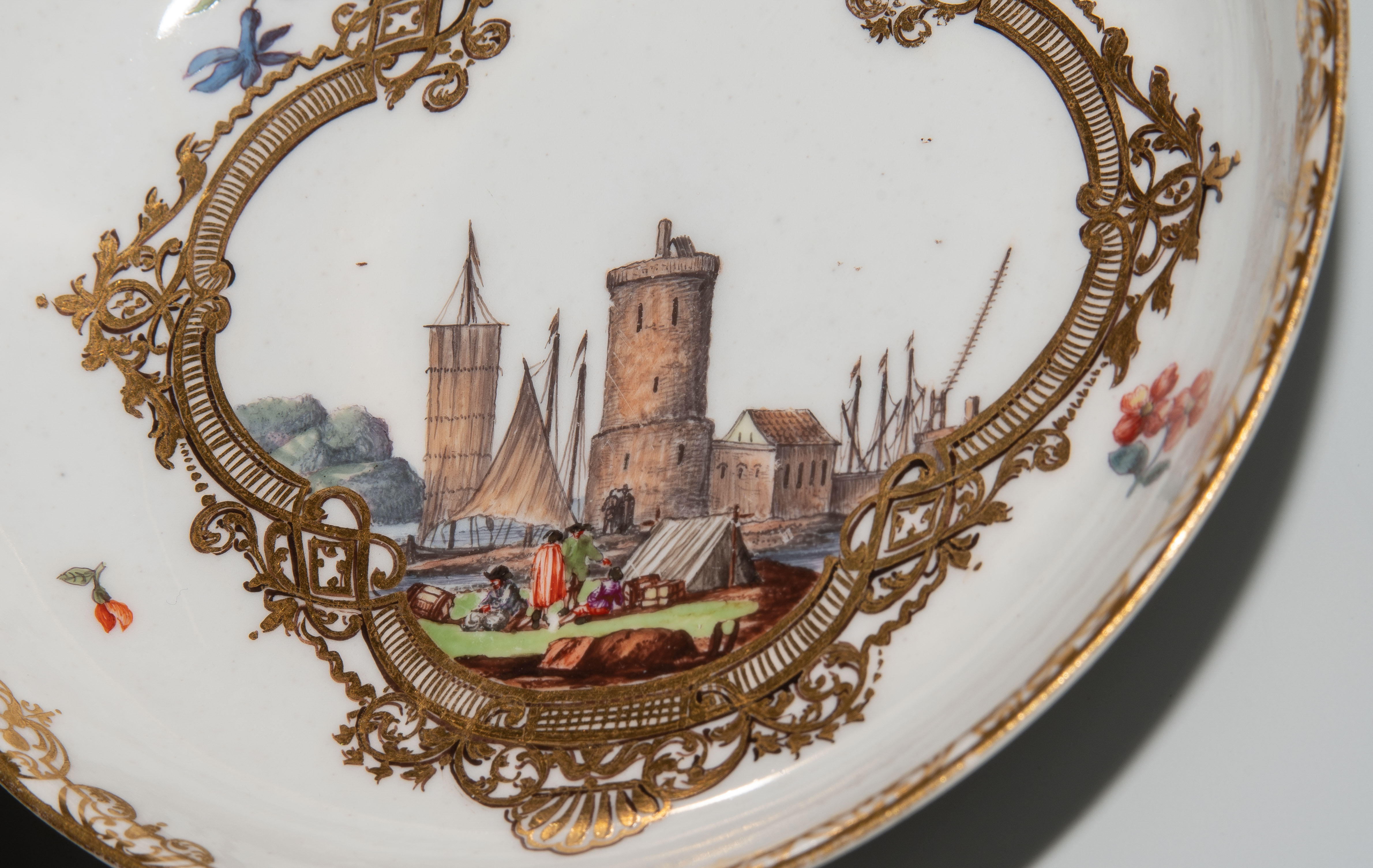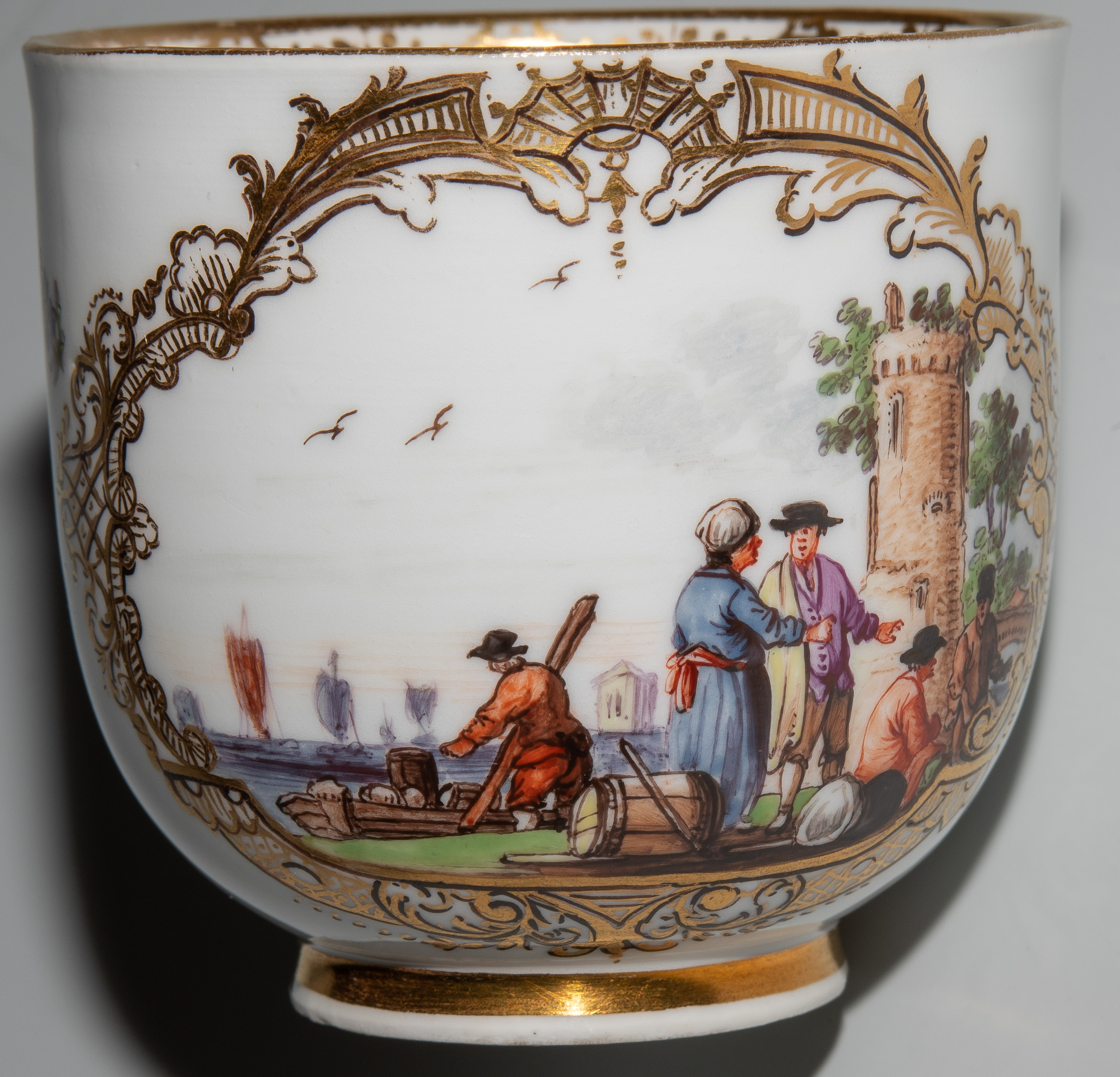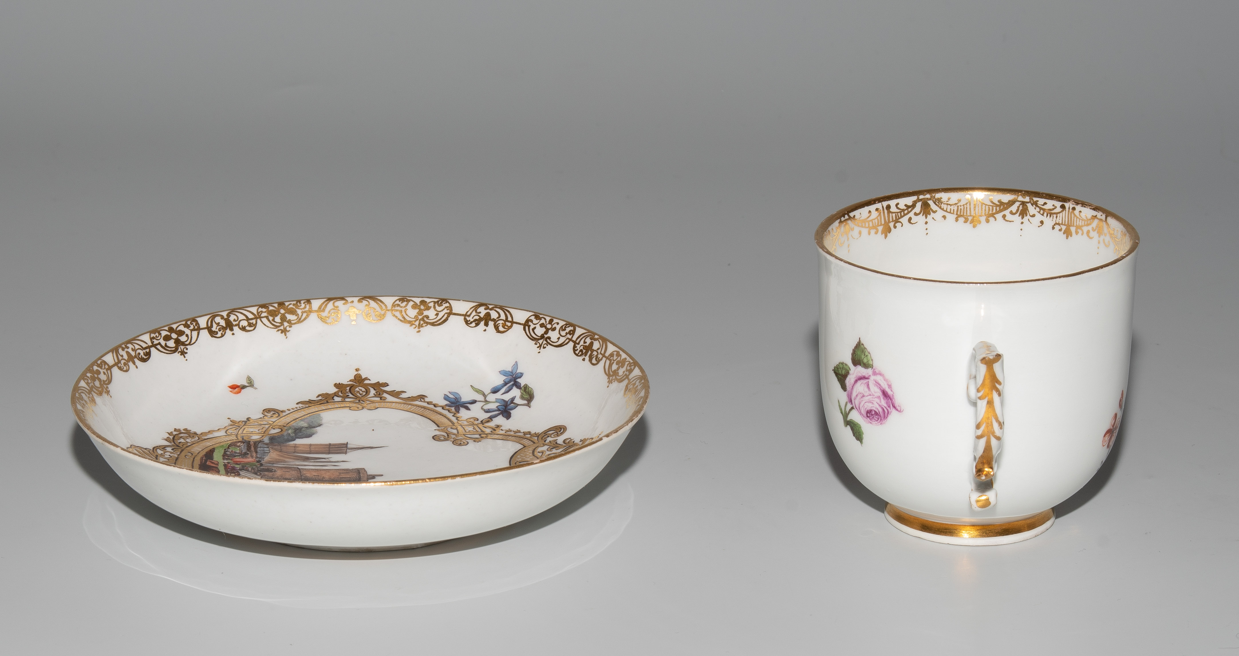 Um 1745/50. Porzellan. Unterglasurblaue Schwertermarke, Pressnummer 6 (Tasse), Vergolderzeichen A (Tasse) bzw. 82 (U'tasse). Standringe vergoldet, Henkel teilvergoldet. Farbige Kauffahrteiszenen in vierpassigen Goldkartuschen mit Braunkontur, umgeben von Streublumen. Goldspitzenmordüren. H 6,8 cm, D 13,2 cm.