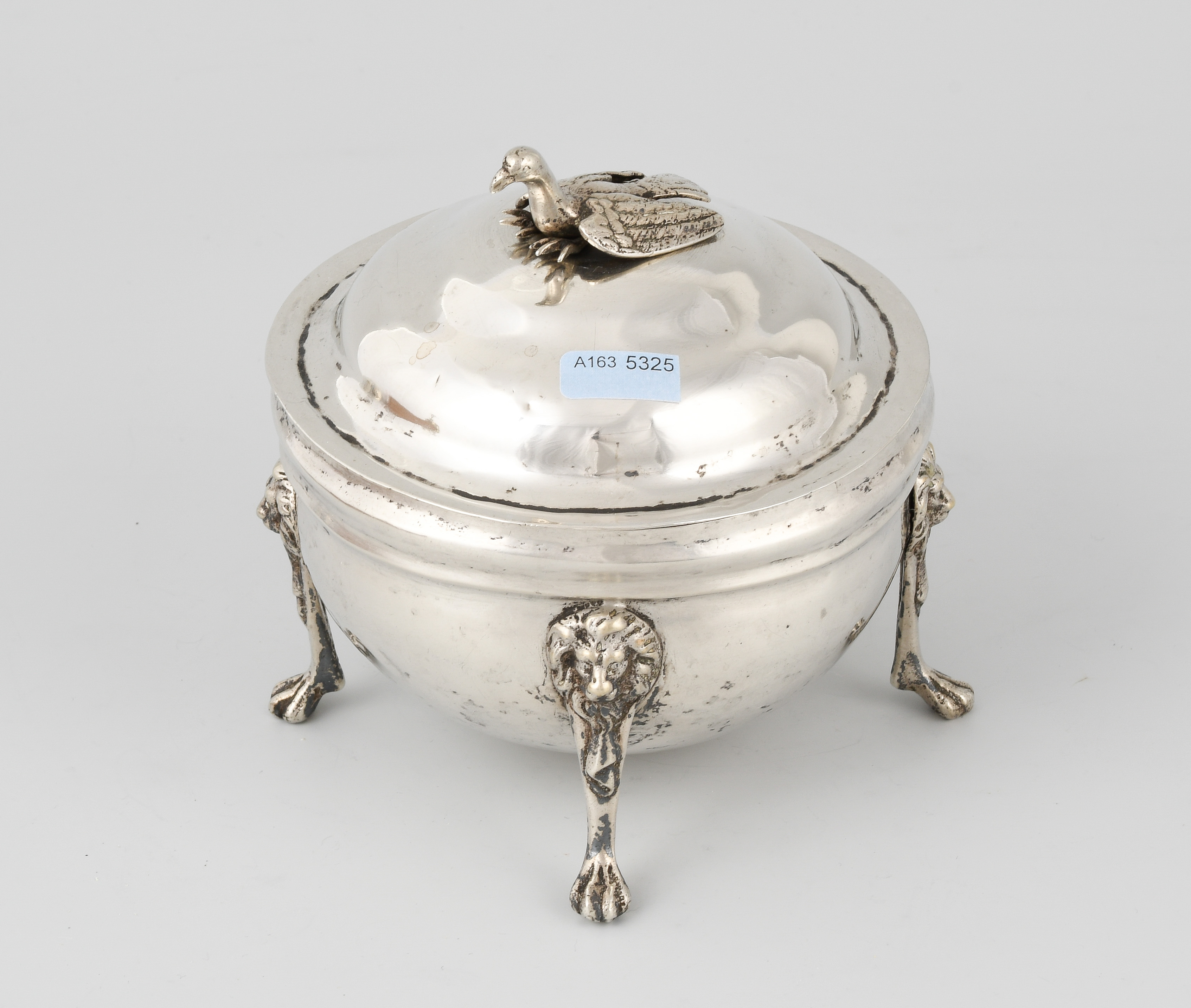 Italien, um 1800. Silber. Meistermarke F.M. Blanke Rundform auf hohen Tatzenfüssen mit Löwendekor. Deckelknauf in Form einer Taube. D 10 cm, ca. 212 g.