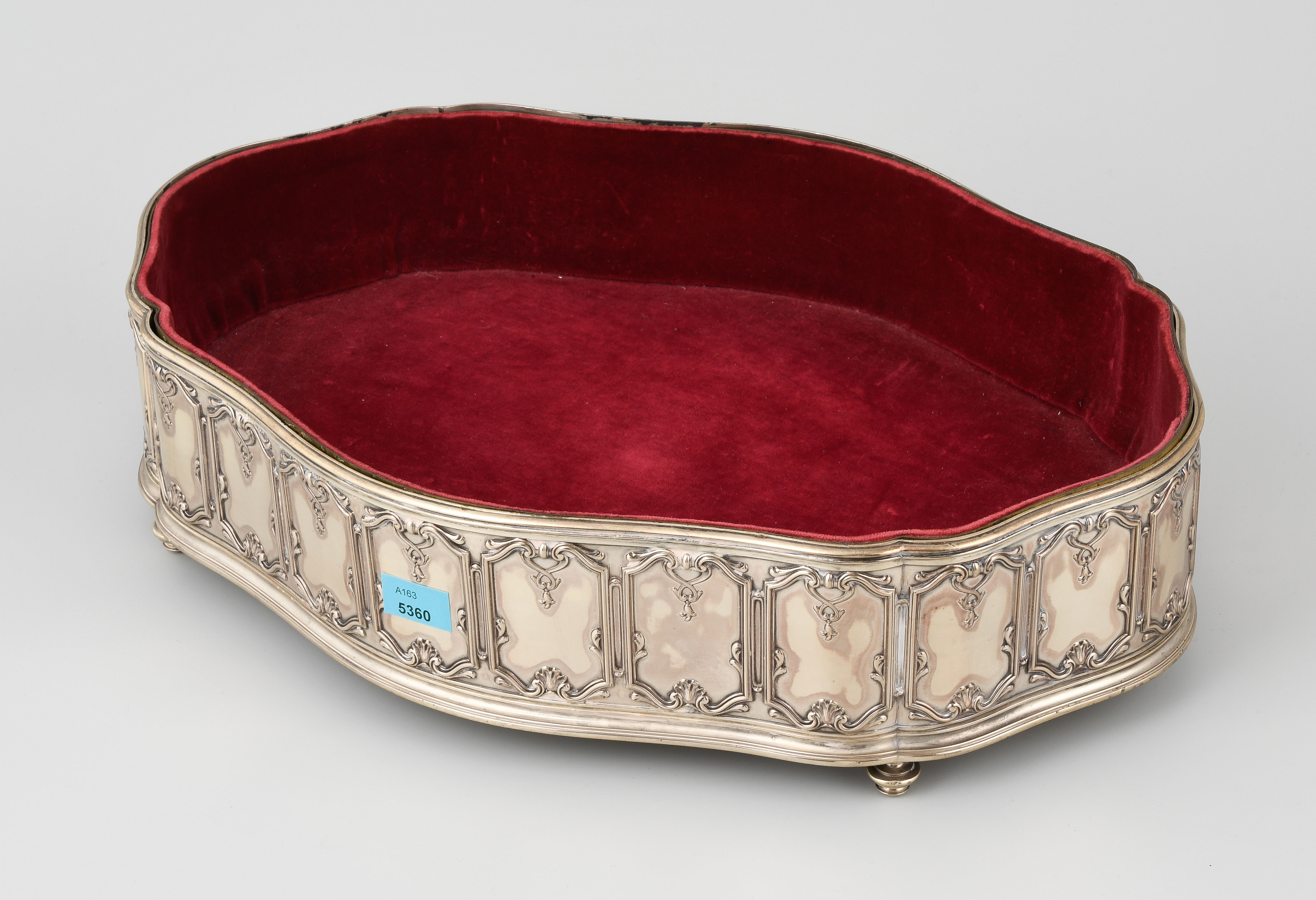 Paris, um 1900. Silber (Kupfereinlage). Meistermarke Piault-Linzeler. Fassonierte Form auf Scheibenfüssen. Gerade Wandung mit umlaufendem Volutendekor zwischen profilierten Abschlüssen. Garantie-, Meistermarke. Inwendig mit rotem Samt ausstaffiert. 39x28,5 cm.