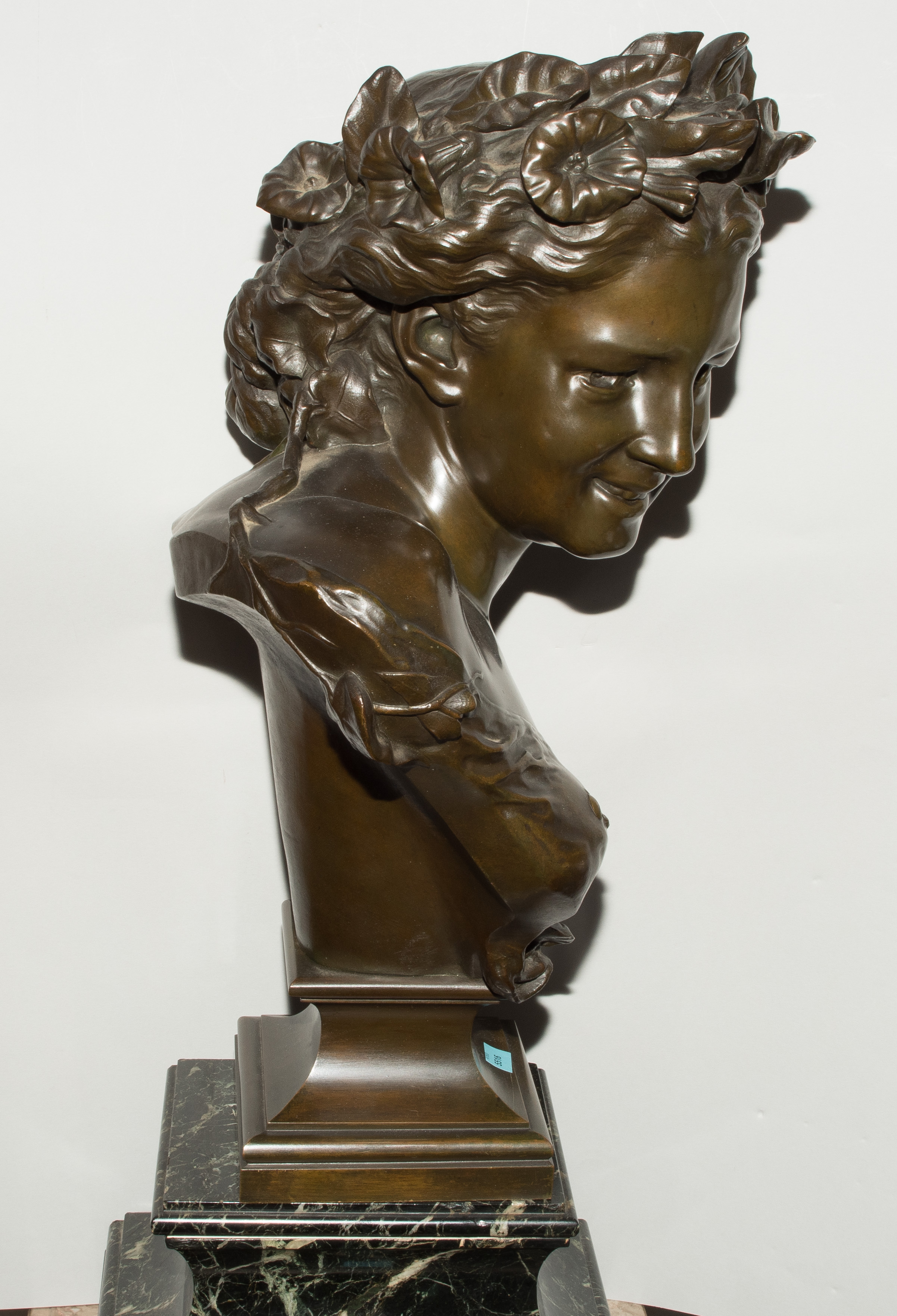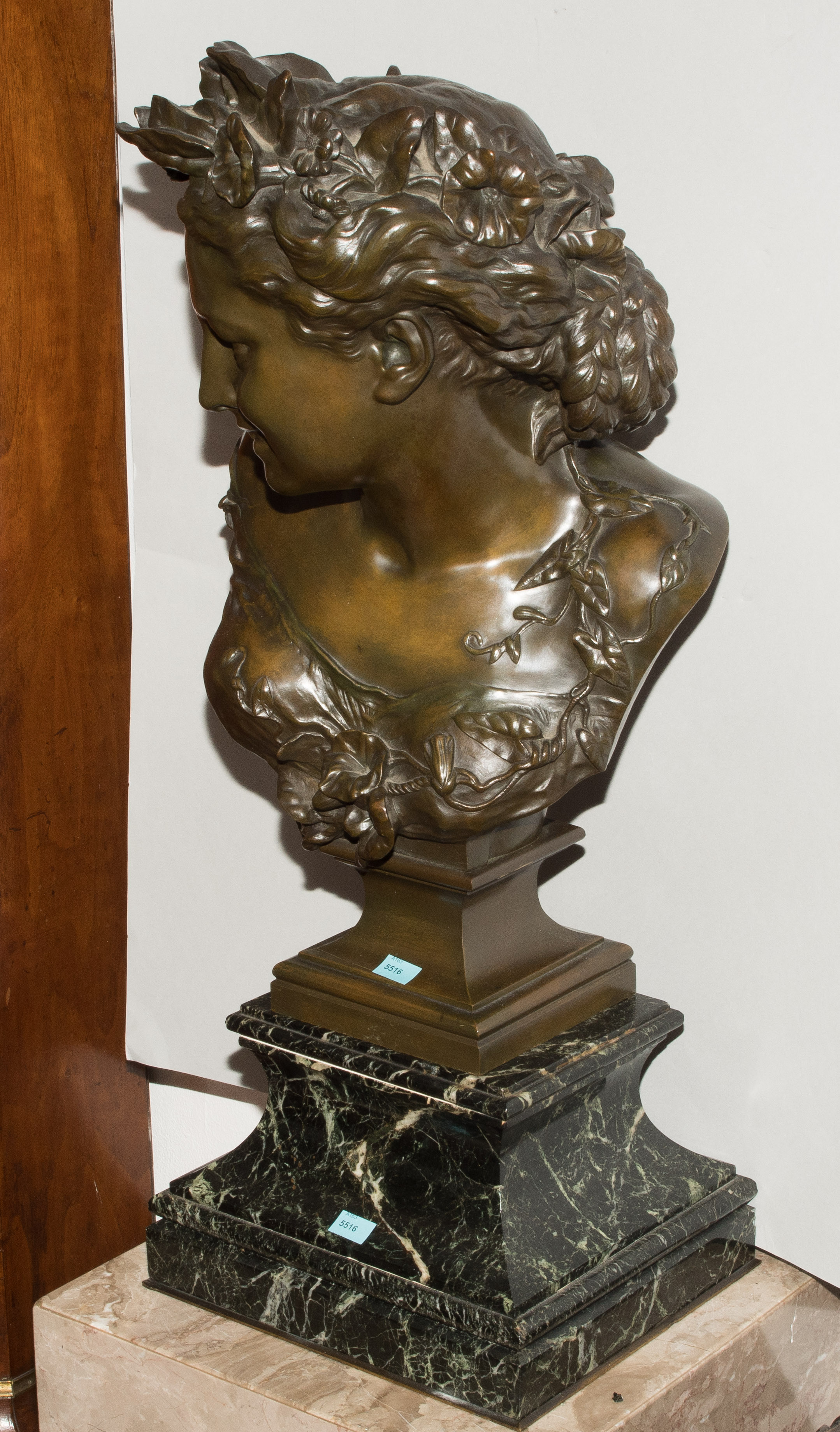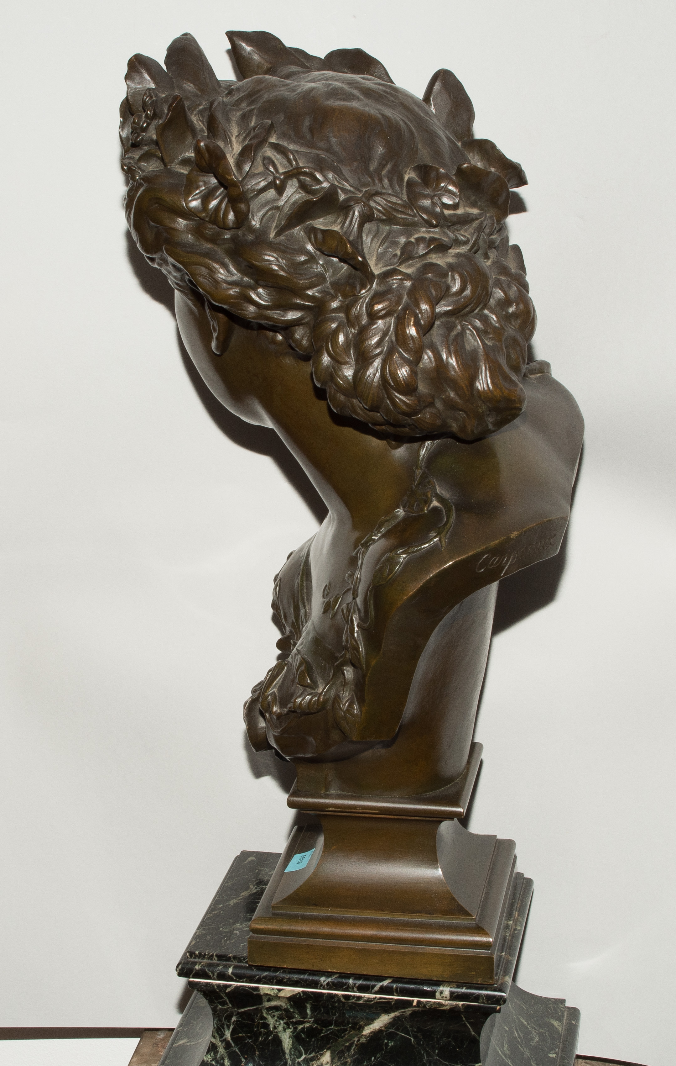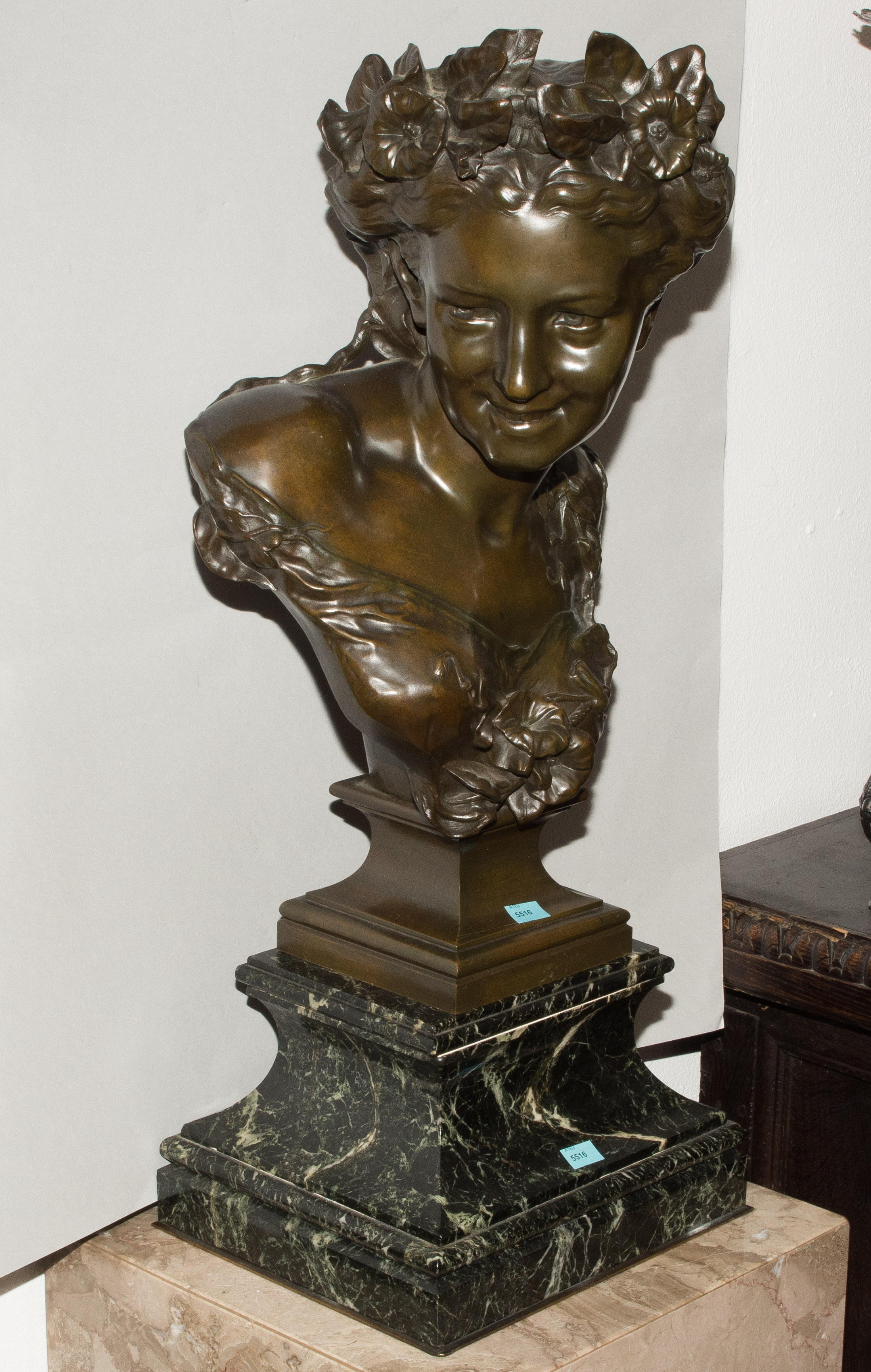 19/20. Jh. Bronze, Marmor. Frauenbüste aus Bronze patiniert, nach der Motiv "Allegorie des Printemps". Signatur Jean Baptiste Carpeaux und Giessereistempel. Figur auf gemusterte und getreppten Marmorsockel H 17 cm. aufgestellt. Bronzefigur H 51 cm.
