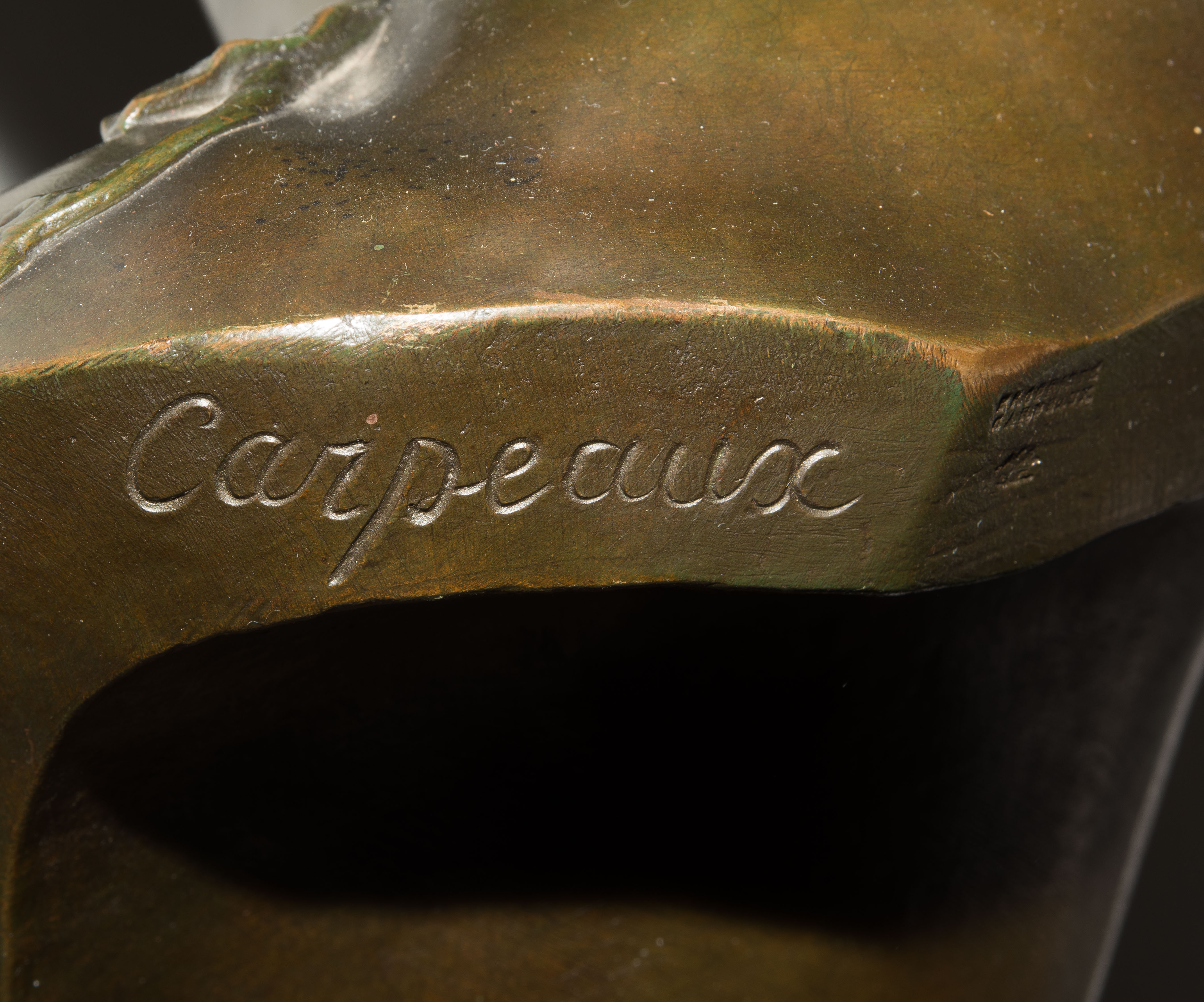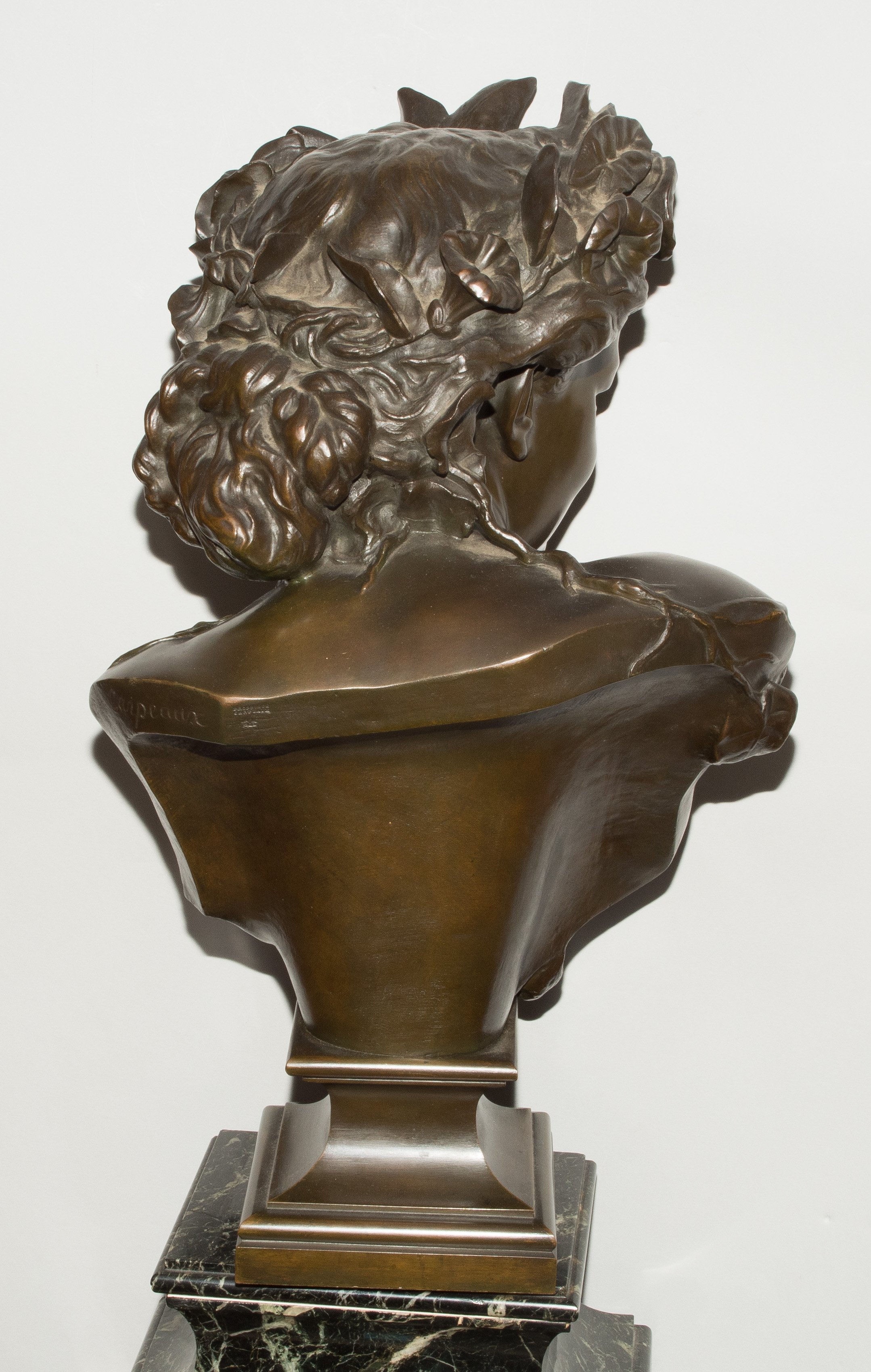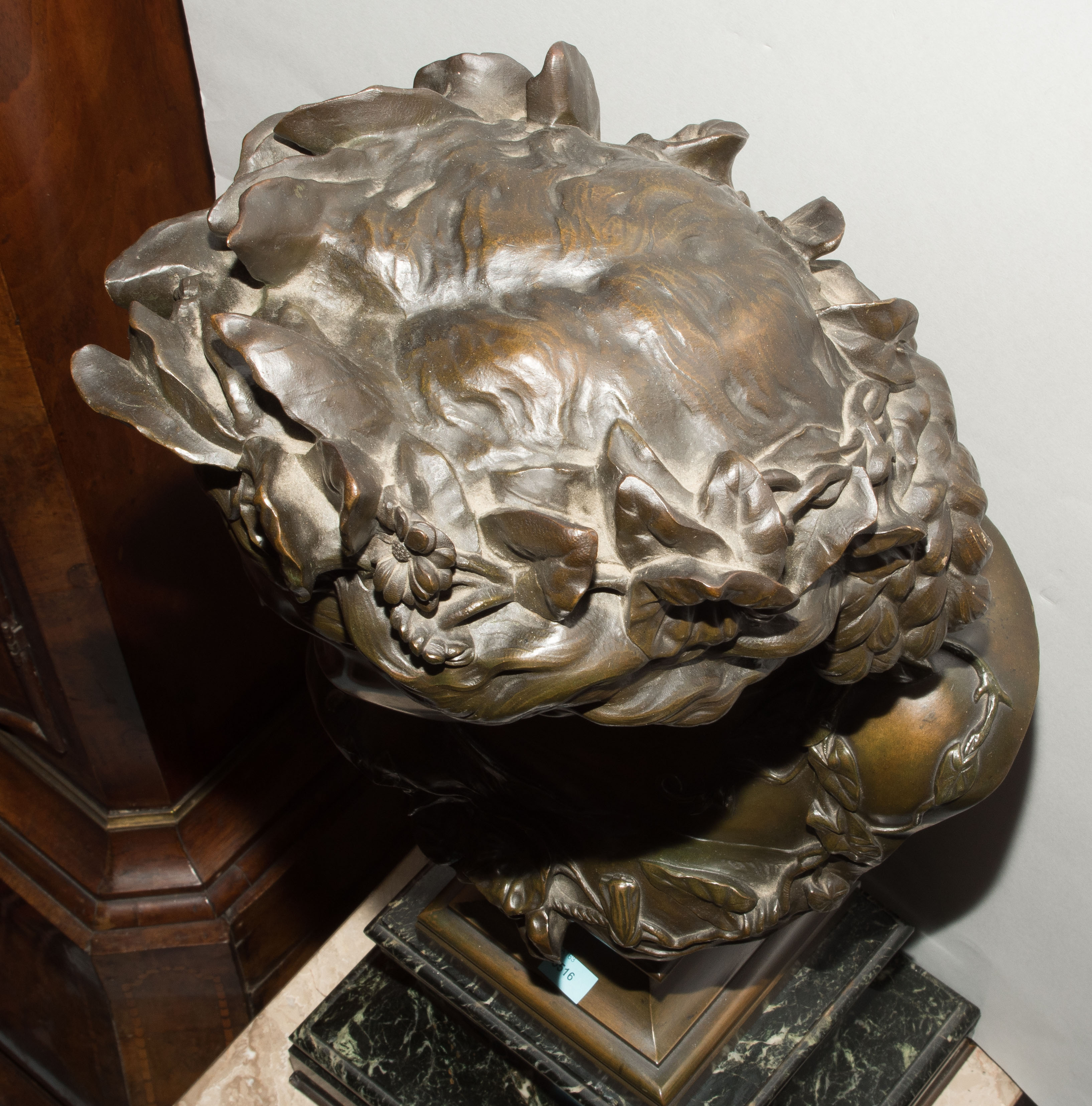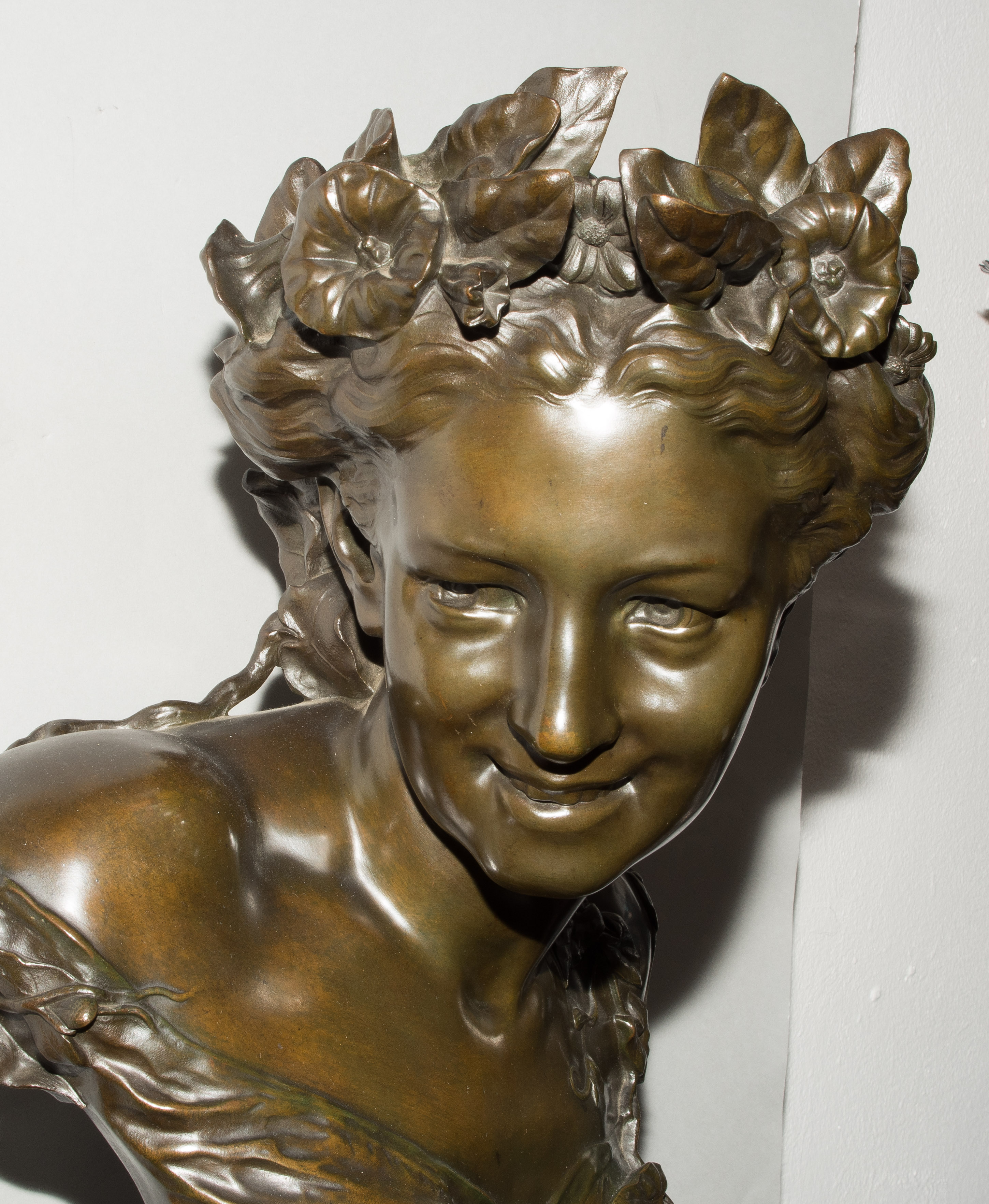 19/20. Jh. Bronze, Marmor. Frauenbüste aus Bronze patiniert, nach der Motiv "Allegorie des Printemps". Signatur Jean Baptiste Carpeaux und Giessereistempel. Figur auf gemusterte und getreppten Marmorsockel H 17 cm. aufgestellt. Bronzefigur H 51 cm.