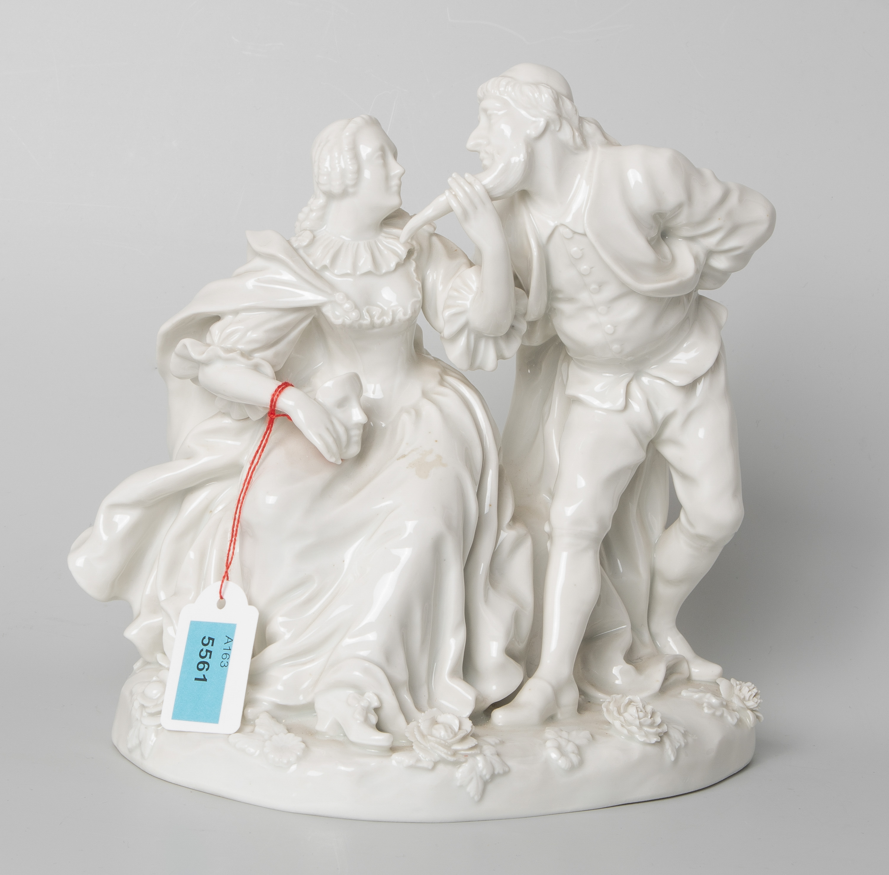Deutschland. 20.Jh. Porzellan weiss. Unterglasurblauer Bindenschild. Zwei Figuren auf Terrainsockel nach Commedia dell’arte. H 18,5 cm.