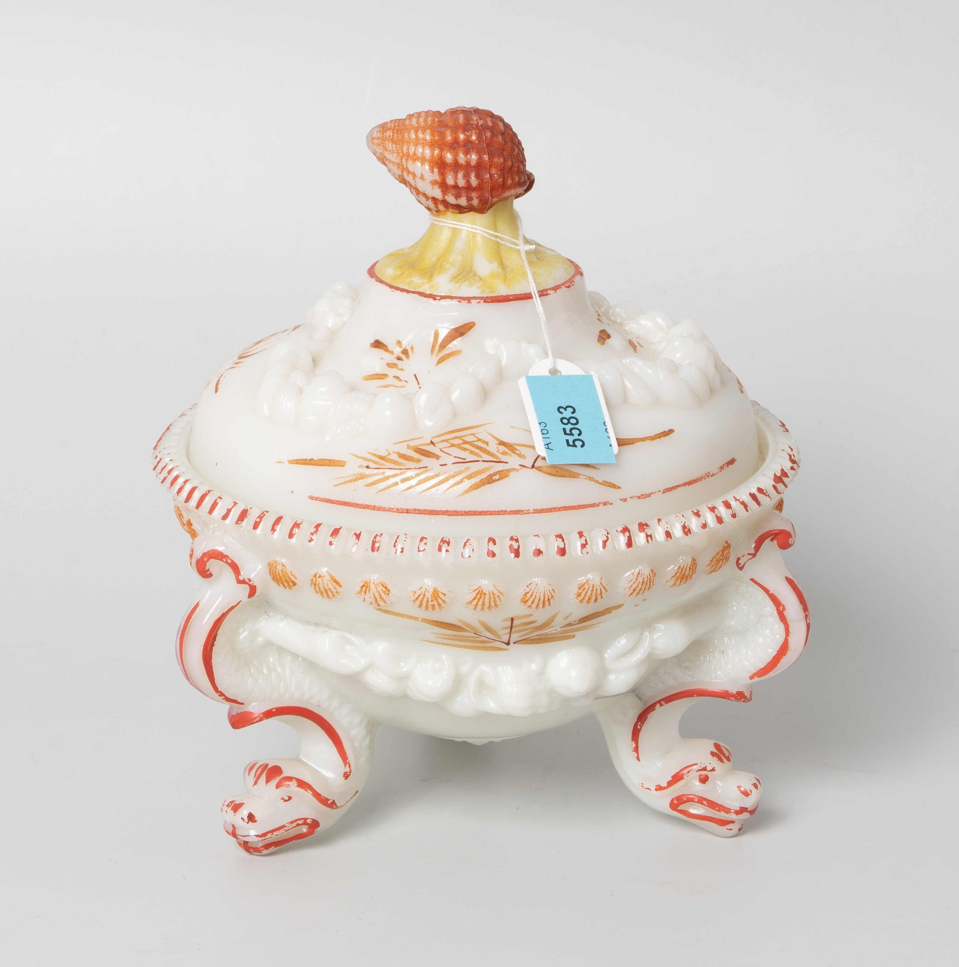 19.Jh. Frankreich. Opalinglas. Passige Form mit ornamentalem Muscheldekor im Relief. Drei Füsse in Form eines Fisches. Polychrome Bemalung. H 16,5 cm.