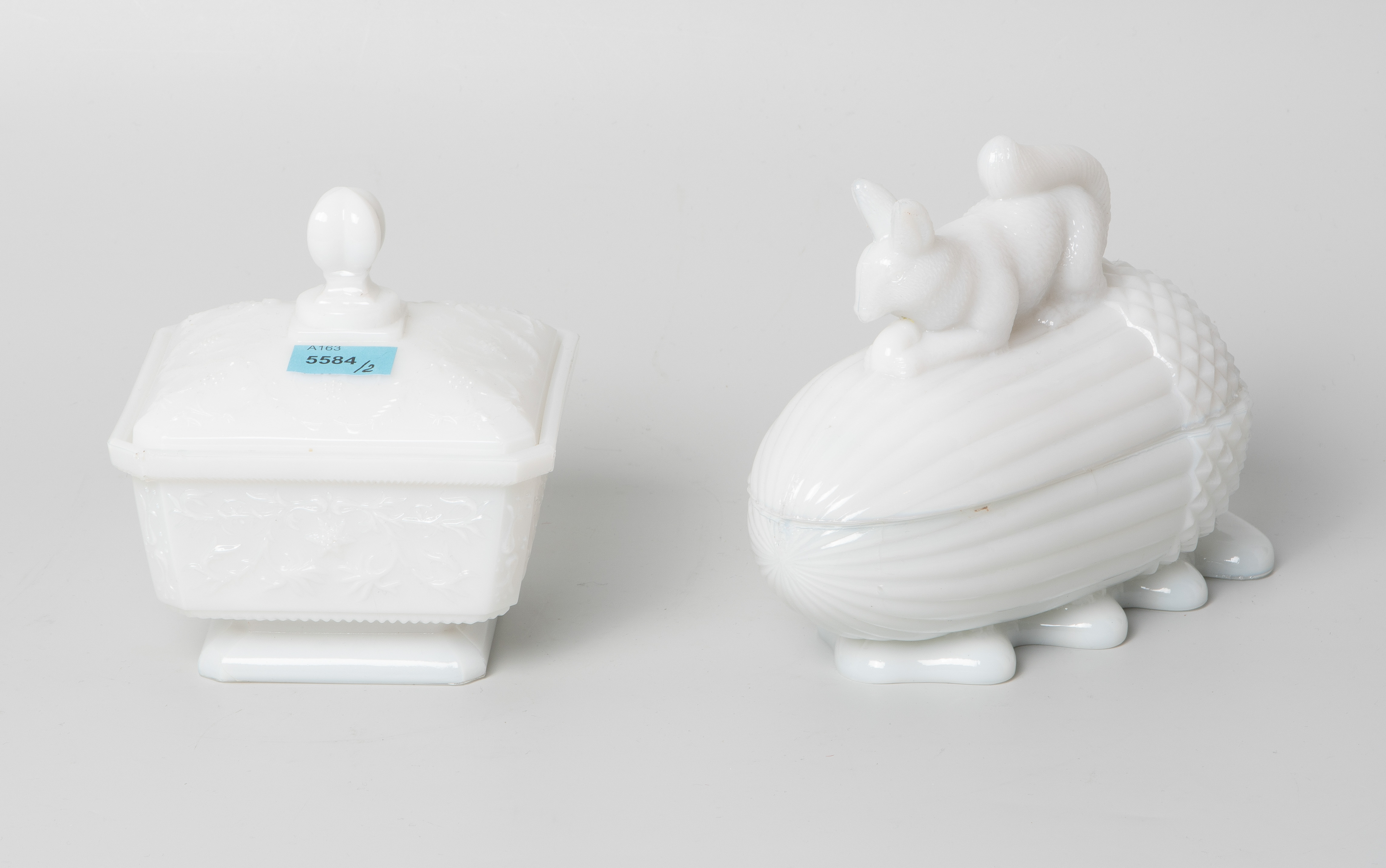 19.Jh. Frankreich. Opalinglas. (1) Deckeldose in Form einer Eichel mit Eichhörnchen als Knauf. L 18 cm. (2) Viereckige Deckeldose mit ornamentalem Dekor im Relief. H 11,5 cm.