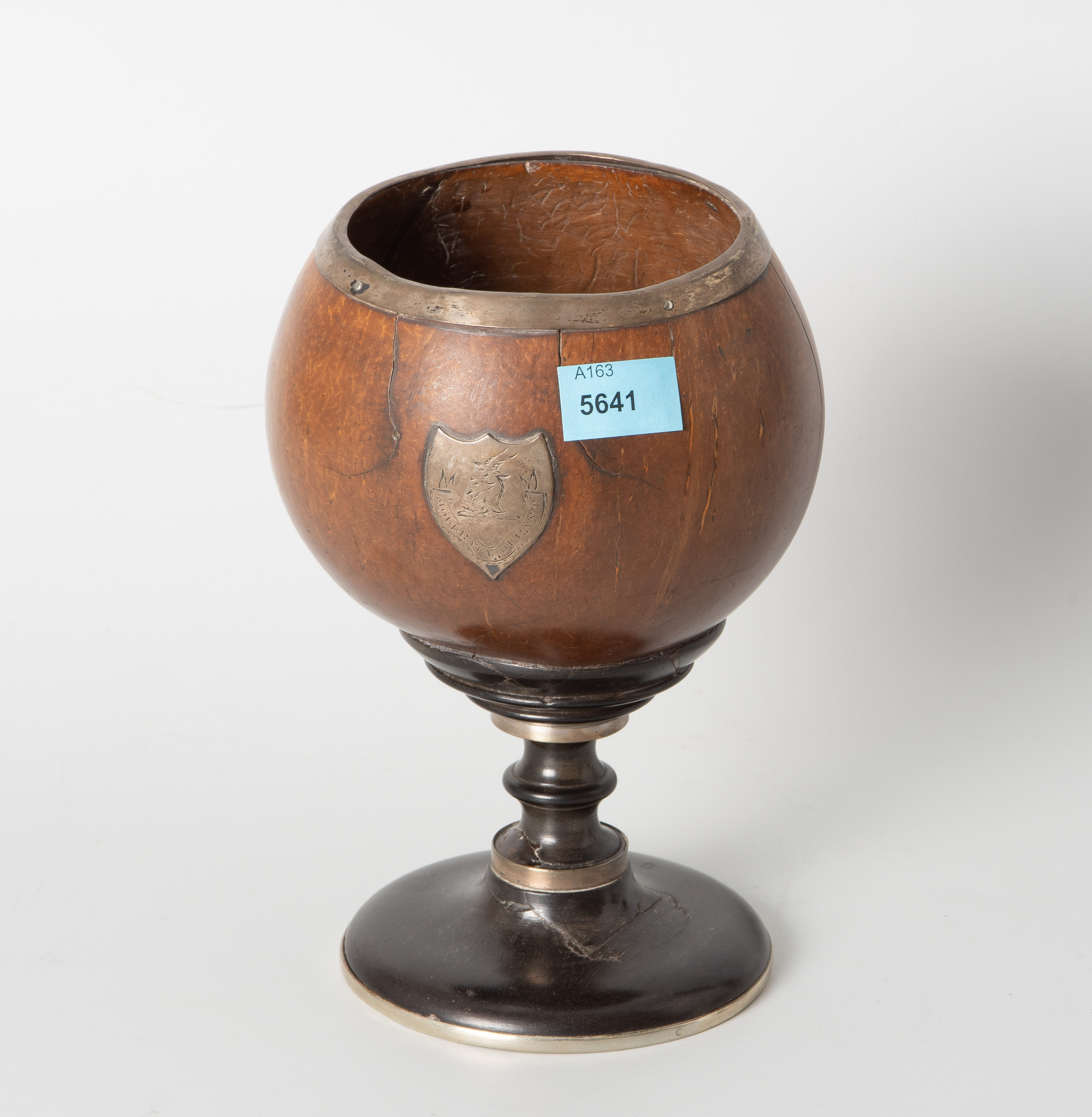 19.Jh. Fuss aus Holz, gedrechselt und ebonisiert. Cuppa mit versilberter Metallfassung aus Kokoksnuss. H 18 cm.