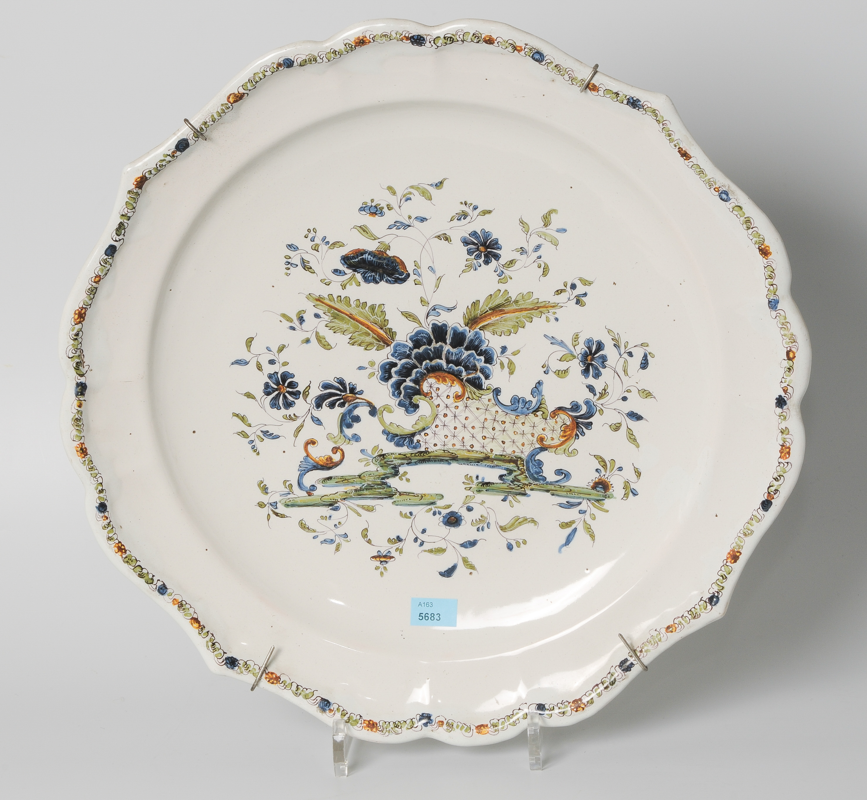 Ende 18.Jh. Weiss glasierte Fayence mit passigem Rand. Polychrome Blumen- und Rocaillenmalerei. Ungemarkt. D 39 cm.
