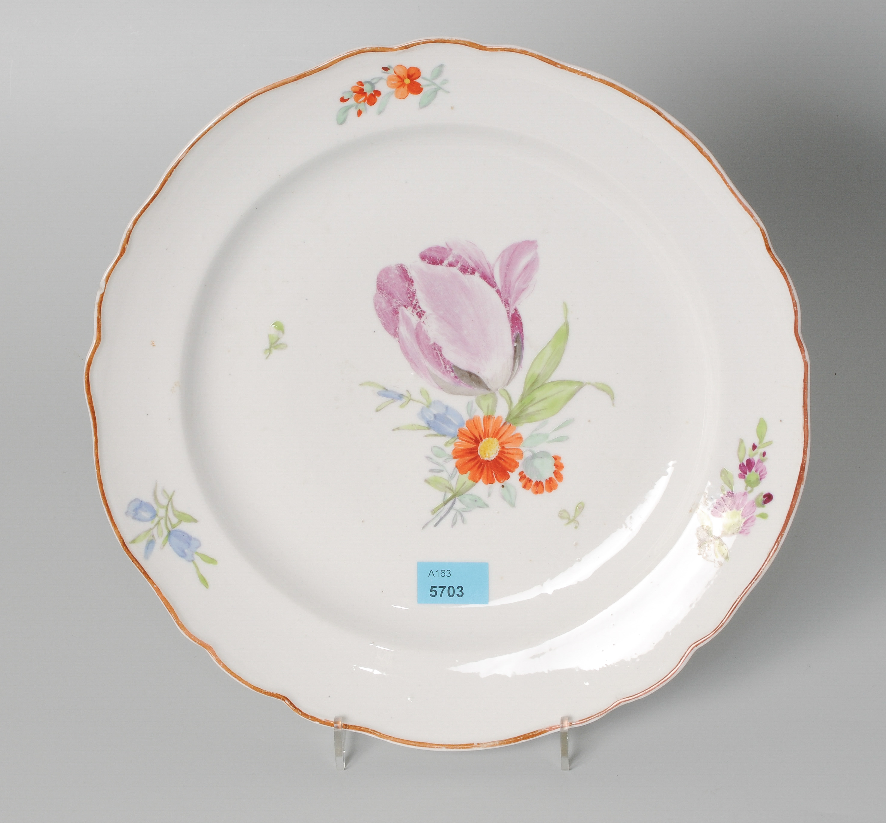 Um 1762–1796. Porzellan. Unterglasurblaue "E II"-Marke, Press- und Ritzzeichen. Geschweifter Rand. Farbige Blumenmalerei. Rotbrauner Rand. D 24,5 cm.
