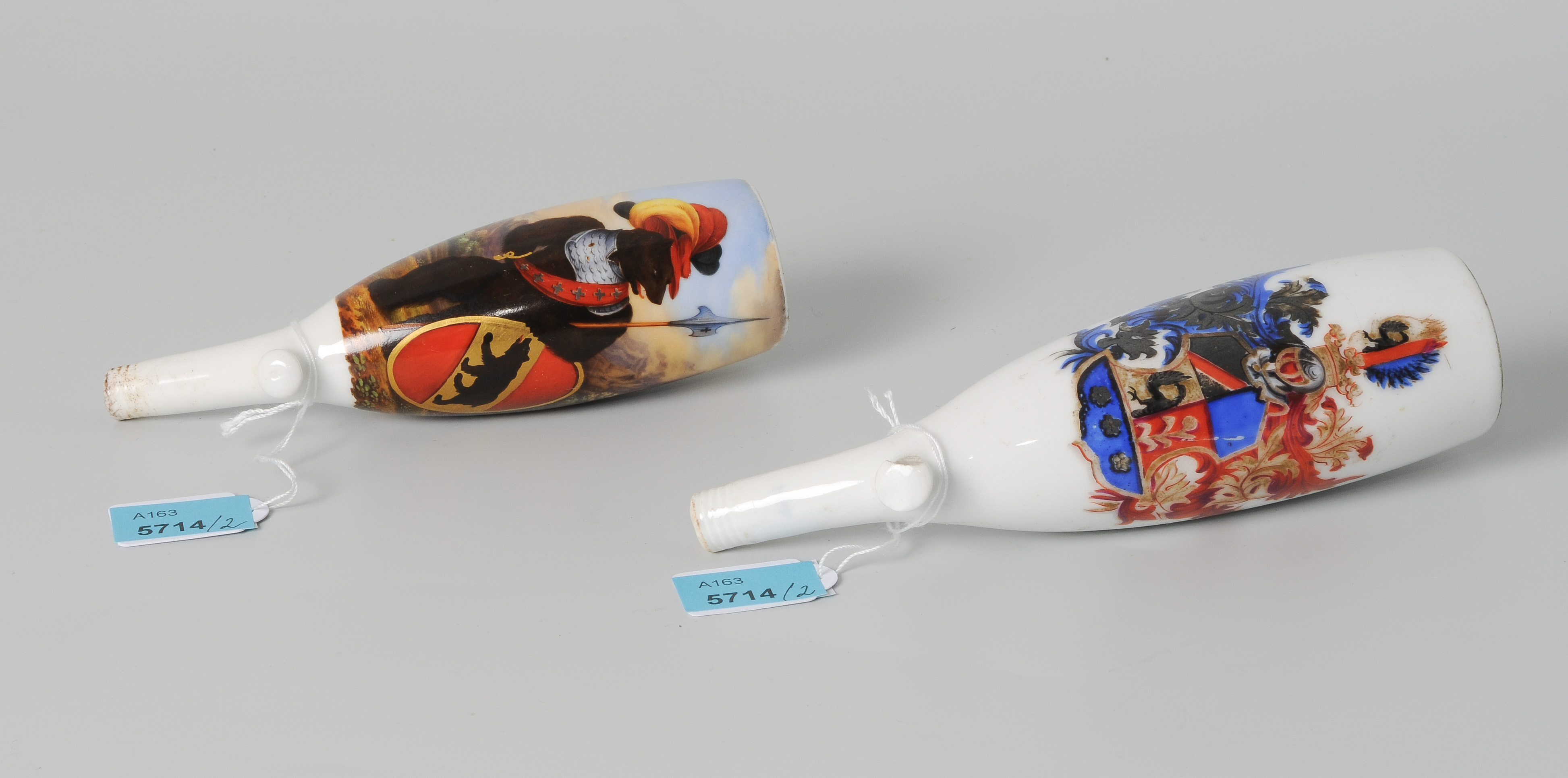 Datiert 1837/1850. Porzellan. Farbige Malerei. (1) Bär mit Halbarte und Berner Schild vor Landschaftshintergrund. (2) Behelmtes Wappen. Beide mit Widmungsinschrift. H 12,5 cm bzw. 14,5 cm.