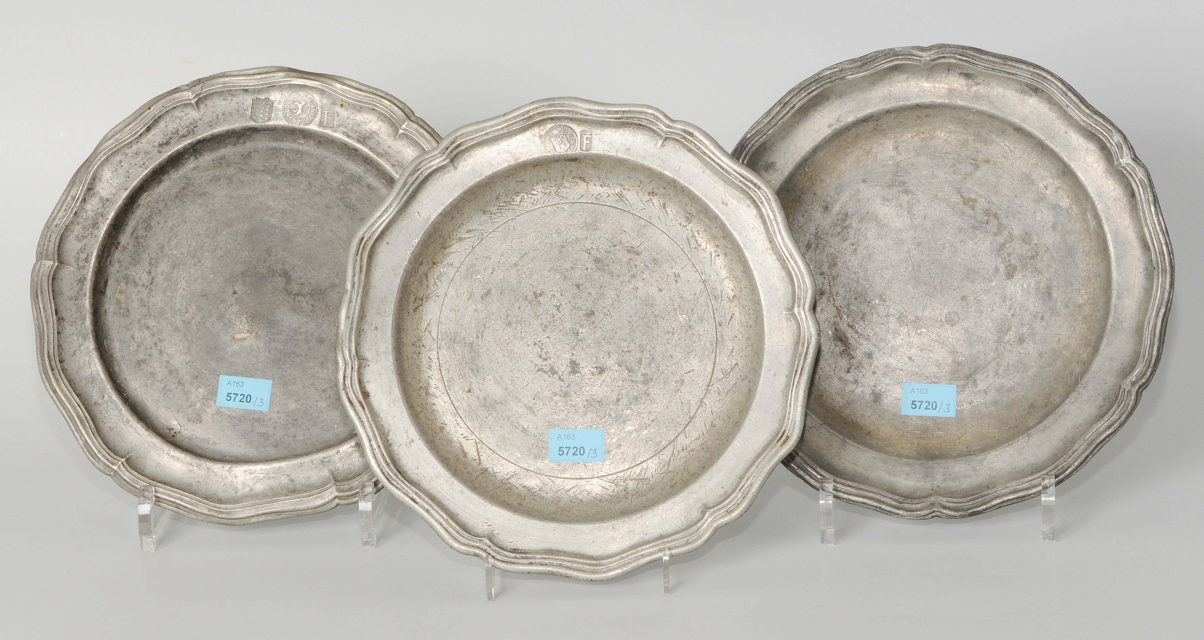 Wallis, 19.Jh./um 1900. Zinn. Rundform mit profiliertem und geschweiftem Rand. (1) Marke des Lorenzo d.J. della Bianca (1867–1941). (2) Marke des Paulo Giuseppe (geb. um 1780) oder seines Sohnes Paulo Giuseppe Lorenzo Maciago (1811–1860). (3) Ohne Marken. D 22 cm.