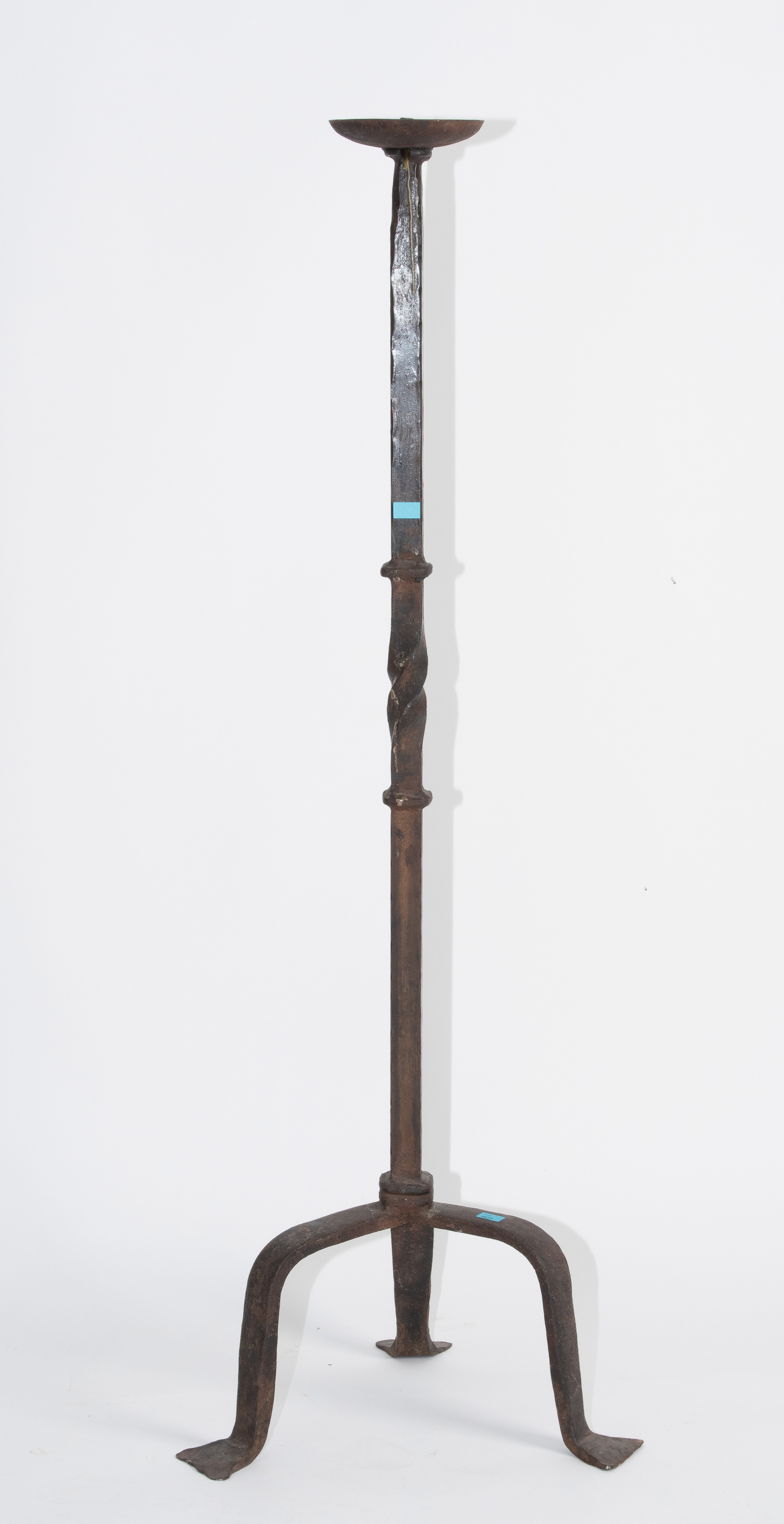 18./19.Jh. Eisen. Vierkantschaft mit tordiertem Mittelstück über 3 Füssen aus gebogenen Eisenbändern. Tropfschale mit Dorn ergänzt. H 127 cm.