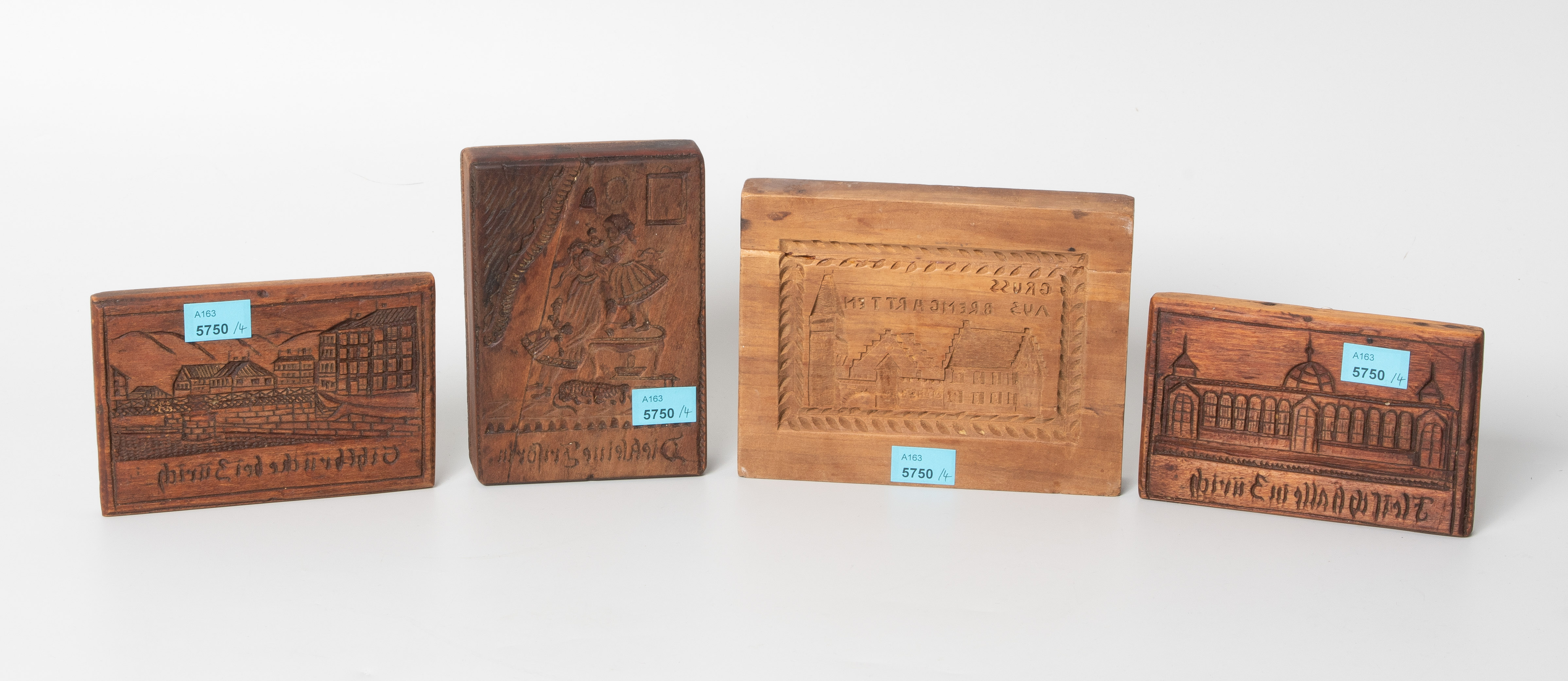 Schweiz, 19./20.Jh. Holz. Rechteckige Form mit eingeschnitzten Motiven. Baumonumente von Schweizer Städten (u.a. Bremgarten, doppelseitig) und Mädchen mit Spielsachen. L 13–15 cm.