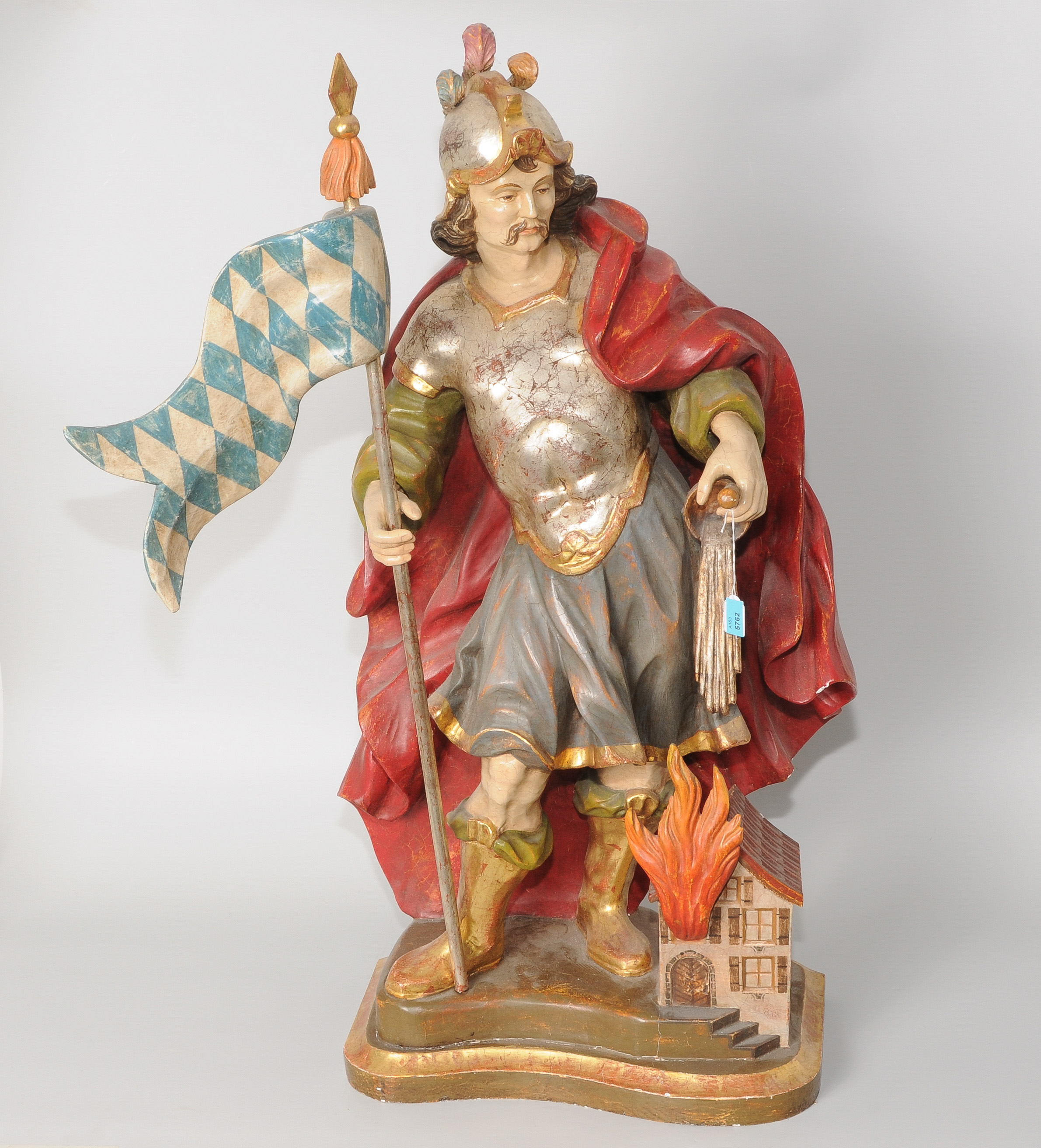 Süddeutsch, Barockstil, 20.Jh. Holz geschnitzt, polychrom gefasst und tlw. versilbert bzw. vergoldet. Auf Sockel stehender Heiliger als römischer Soldat mit Harnisch, Helm und Lanze. Aus einer Kanne giesst er Wasser auf das brennende Haus zu seinen Füssen. Rückseitig gehöhlt. H 77 cm.