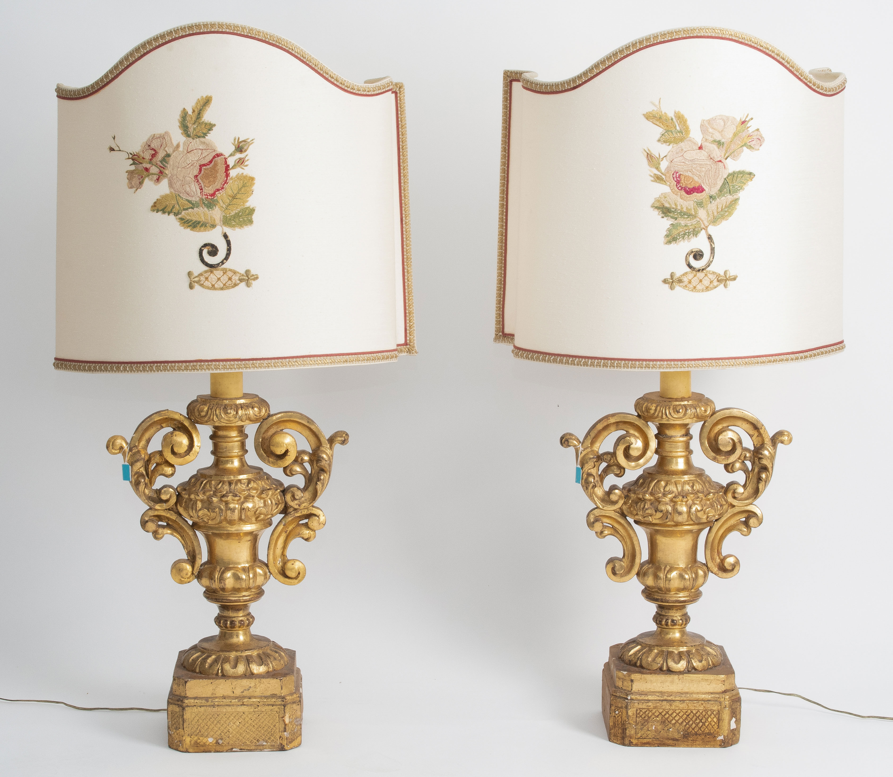 Italien, Barock, mit Ergänzungen. Holz geschnitzt und gefasst, Schauseiten vergoldet. Henkelvasen mit reichem Akanthus- und Volutendekor. Quadratische Sockel ergänzt. Reste einer Elektrifizierung. H 53 cm.