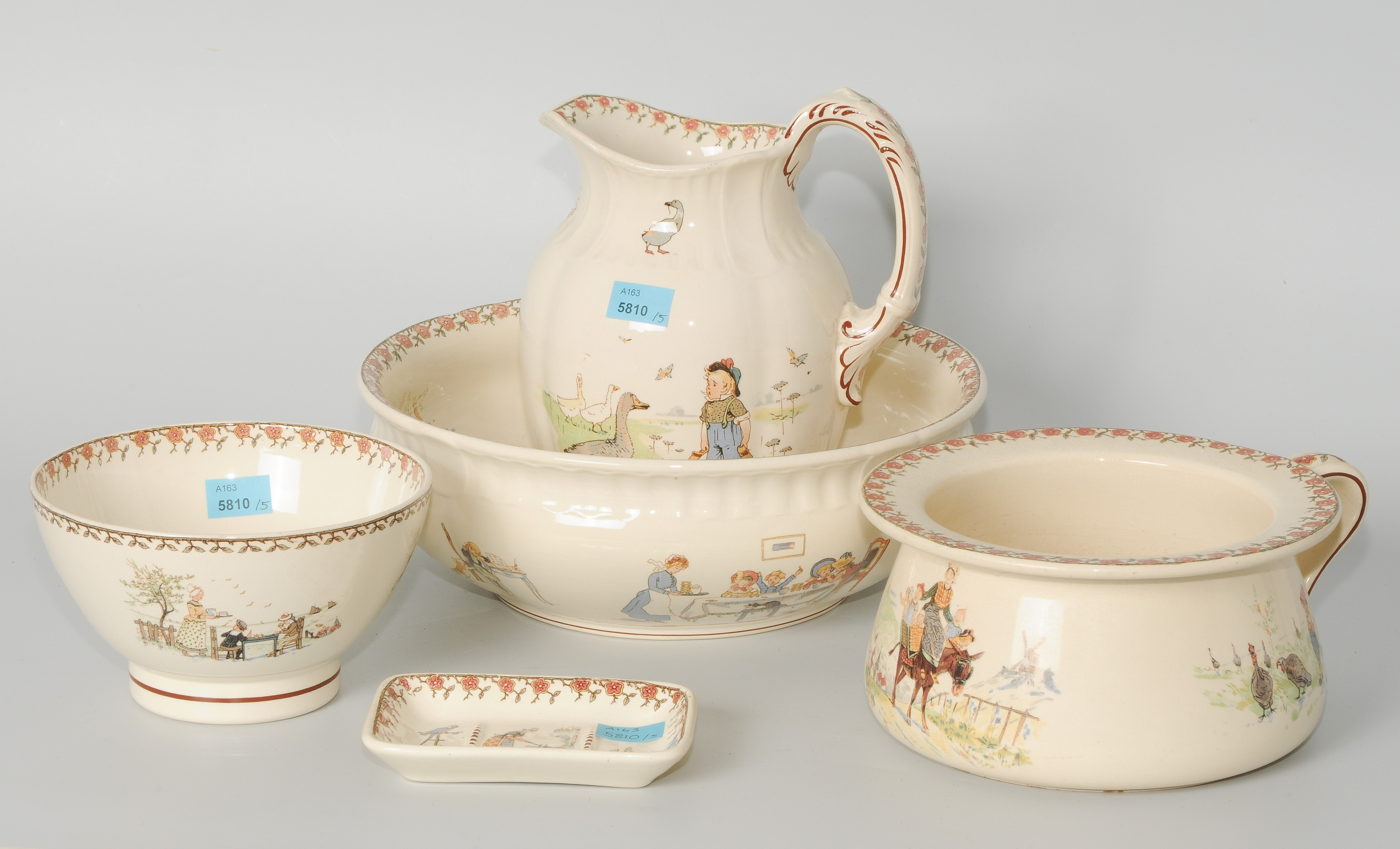 Sarreguemines, Frankreich, um 1910/20. Fayence mit Druckdekor, Kindermotive. Bestand: Waschbecken, Krug, Nachttopf, Schale und Seifenschale. H 17,5 cm (Kanne).