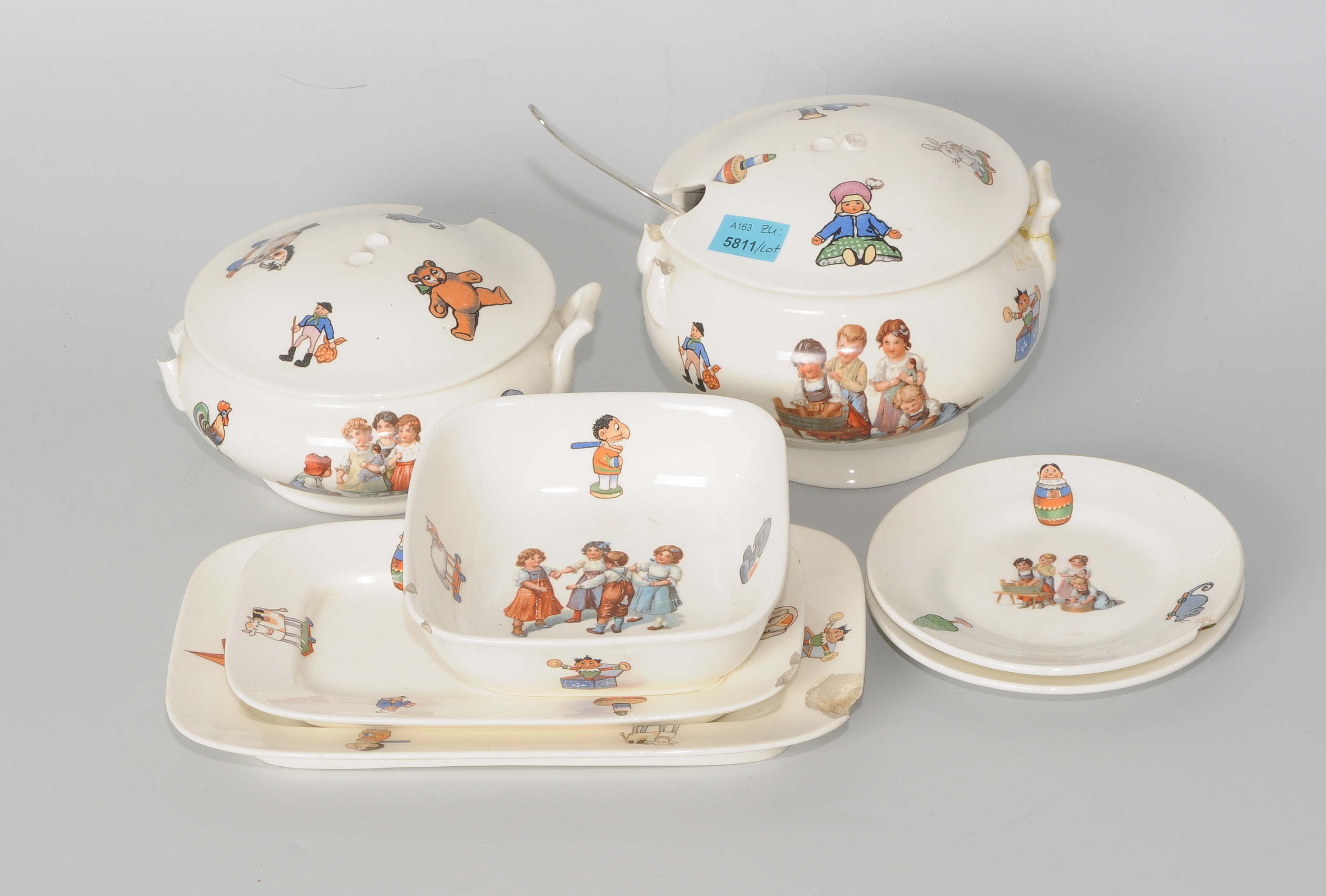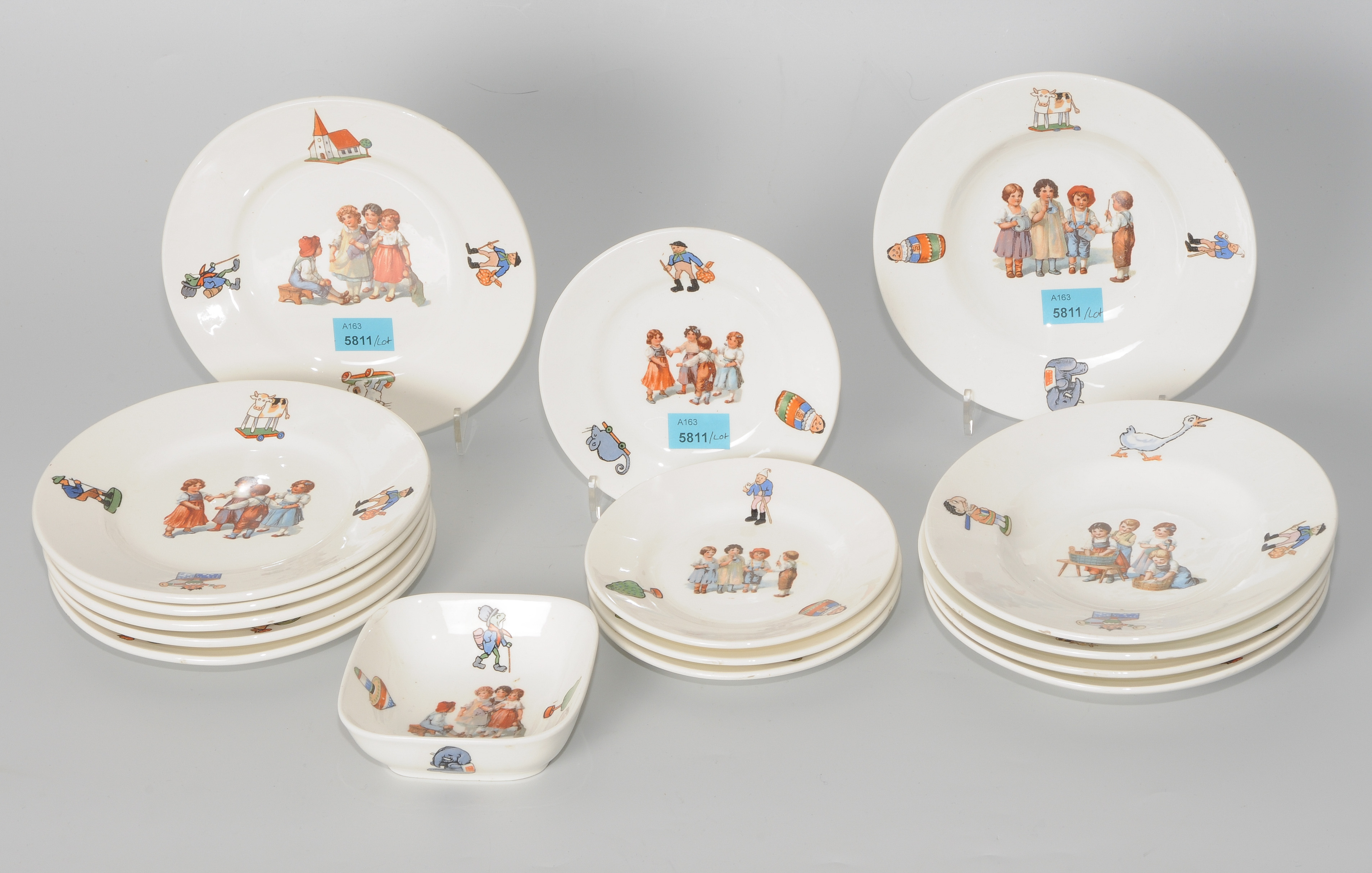 Rodach/D, um 1910/20. Steinzeug mit Druckdekor, Kinder- und Spielzeugmotive. Total 16 Teile. D 15,5 cm (Speiseteller). Beigegeben: div. bestossene Geschirrteile.