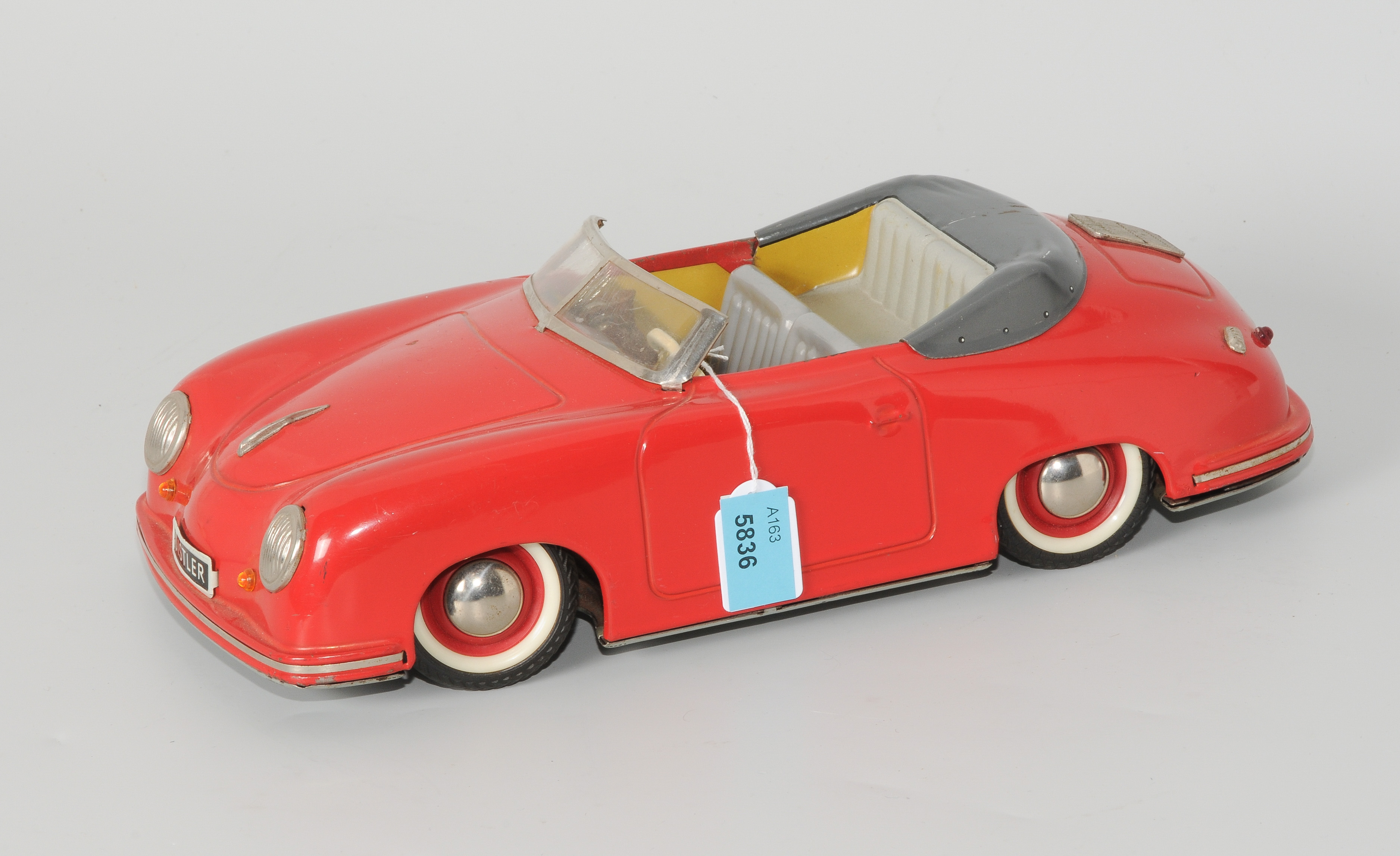 Deutschland, 1950er Jahre. Mit Firmensignet. Blech, farbig lithographiert bzw. rot lackiert. Ohne Zubehör. L 25 cm.