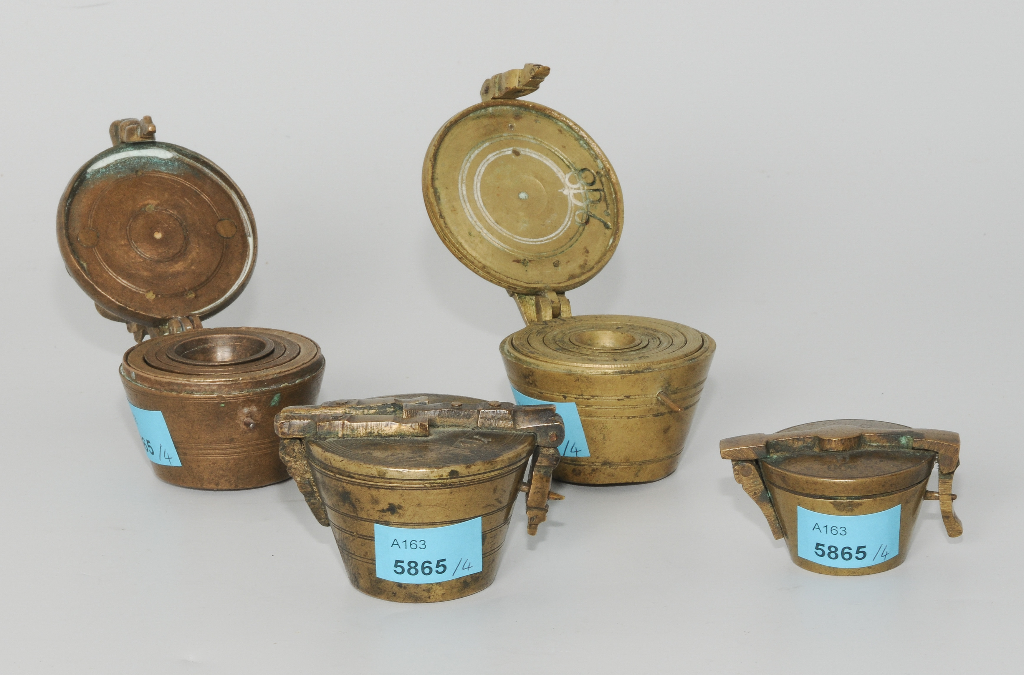Bronze. (1) Deutsch, Ende 18.Jh. Scharnierter Deckel mit Meisterzeichen von Stephan Jäckel und Eichmarken. 6 Einsatzgewichte (unvollständig). H 4 cm. (2) Nürnberg, 17.Jh. Scharnierter Deckel mit Meisterzeichen wohl von Georg Bernhard Weinmann (Vater). 4 Einsatzgewichte (unvollständig). H 4,5 cm. (3) Deutsch, 18.Jh. Scharnierter Deckel mit Meistermarke (nicht zuzuordnen) und Eichmarken. 7 Einstazgewichte (vollständig). H 4 cm. (4) Dresden, 19.Jh. Scharnierter Deckel mit Eichmarke "NDB (Norddeutscher Bund)". 4 Einsatzgewichte (unvollständig). H 3,5 cm.