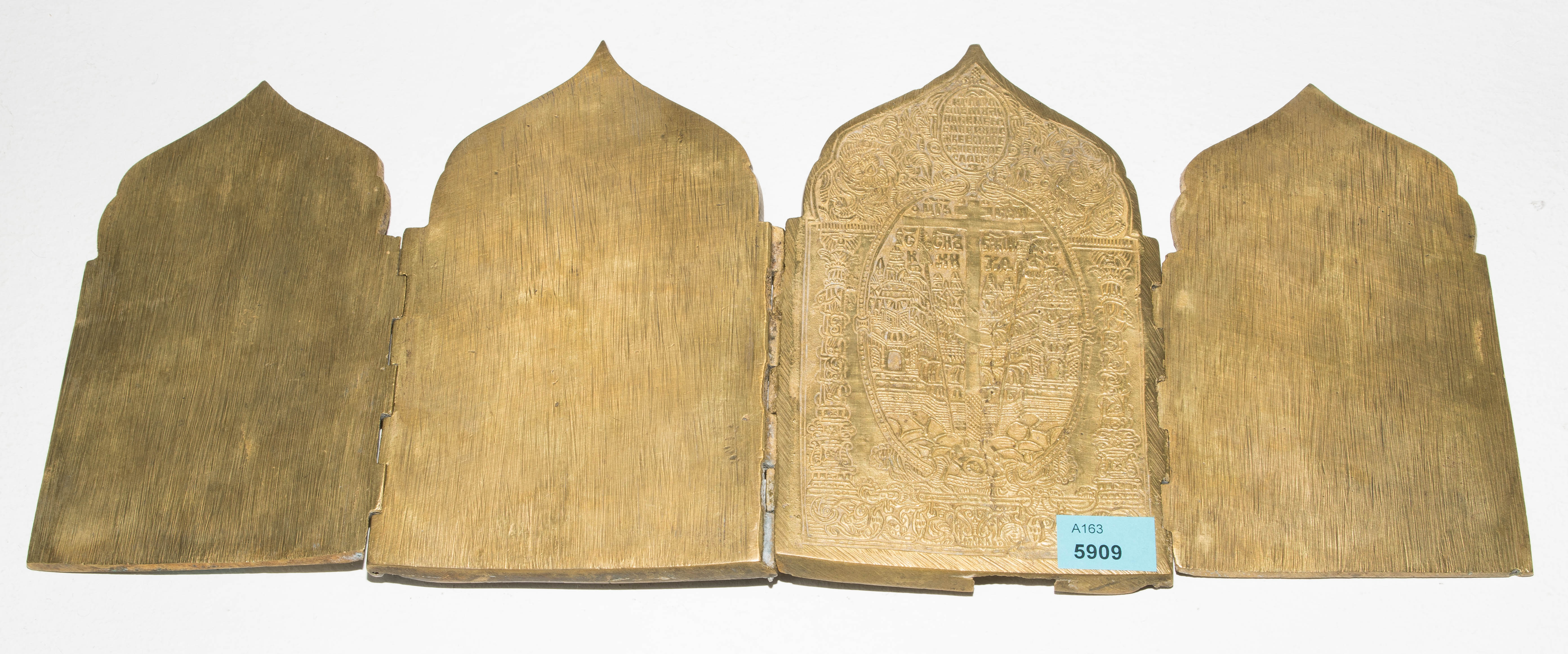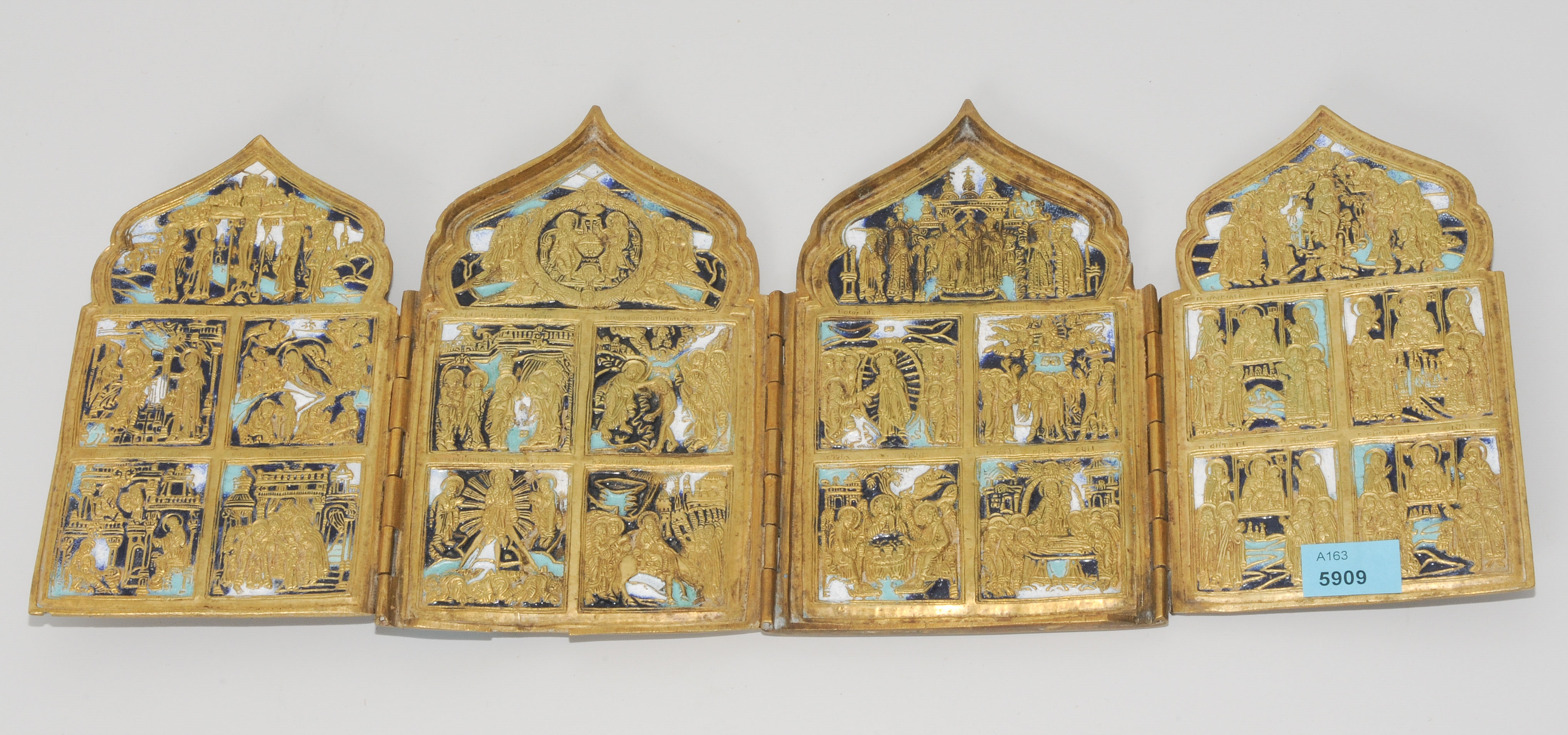 Russisch, 19.Jh. Bronze vergoldet, mehrfarbig emailliert. Auf 3 Flügeln je 4 Szenen aus dem Leben Christi. 1 Flügel mit 4 Szenen der Verehrung von wundertätigen Gottesmutter-Ikonen. In den geschweiften Giebeln Kreuzigung Christi, Hl. Dreifaltigkeit, Kreuzerhöhung und die himmlische Lobpreisung der Gottesmutter. Auf der Schauseite (aussen) Kreuz über Schädel Adams vor Stadtsilhouette Jerusalems. 17x39 cm (offen).