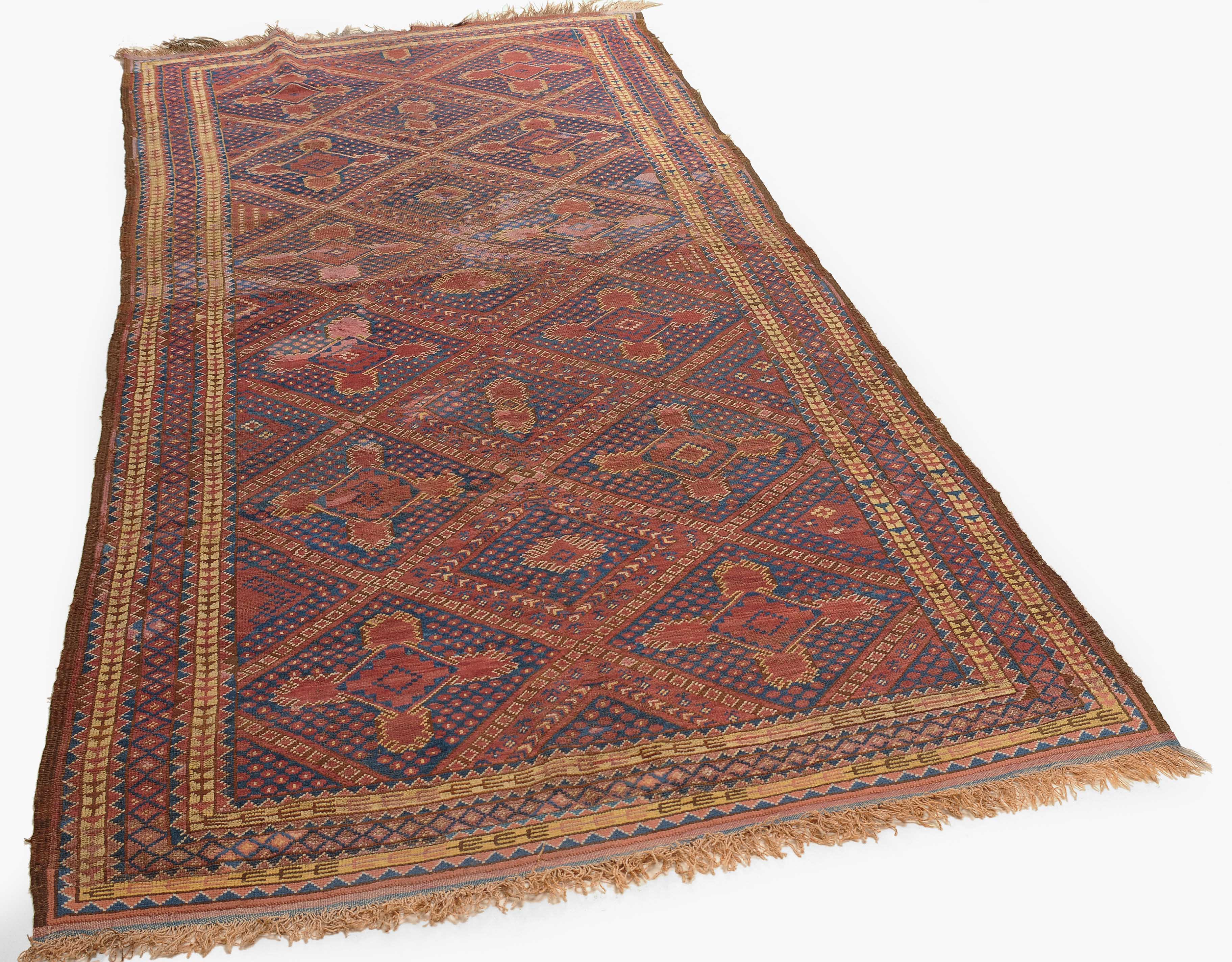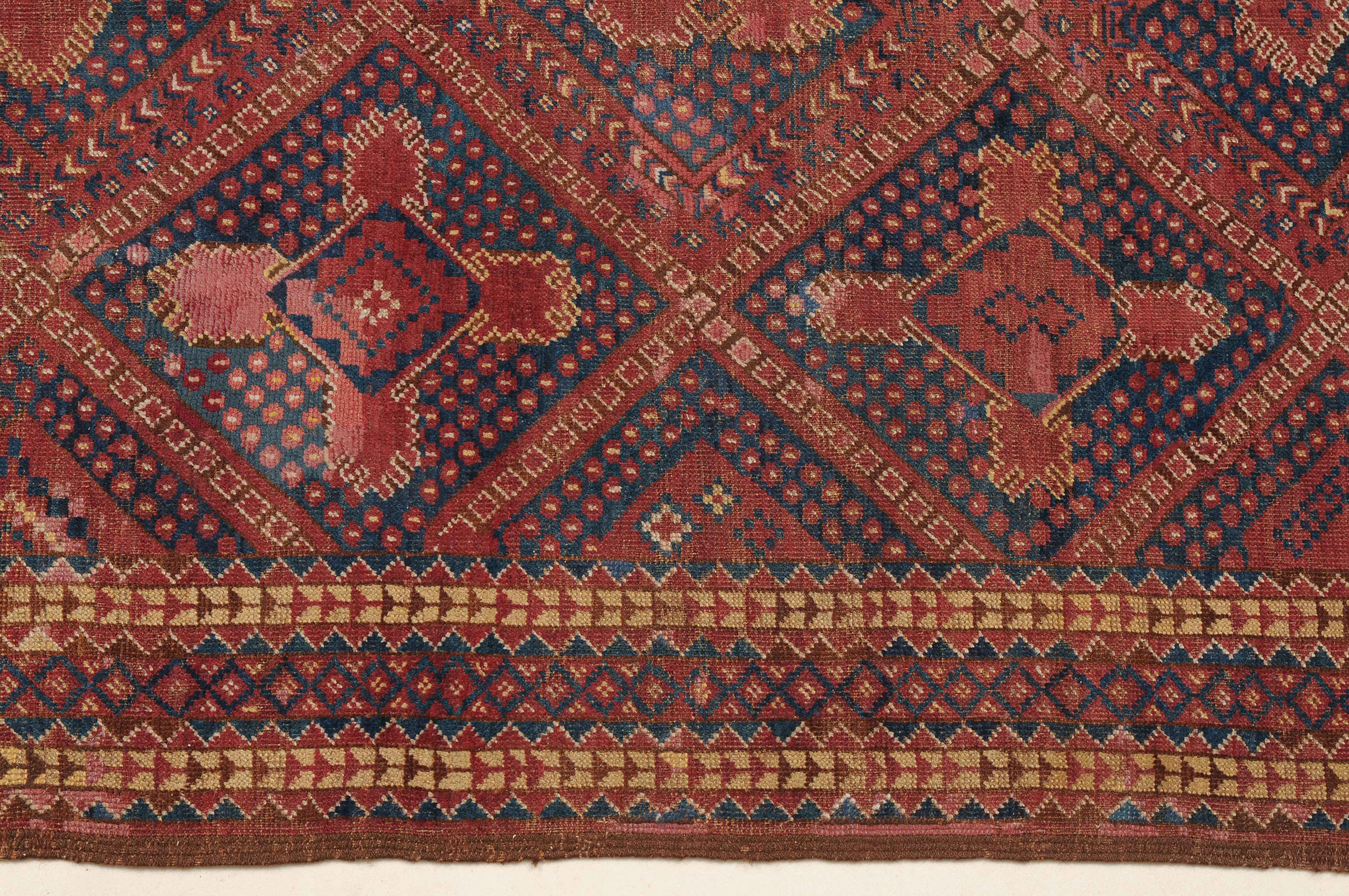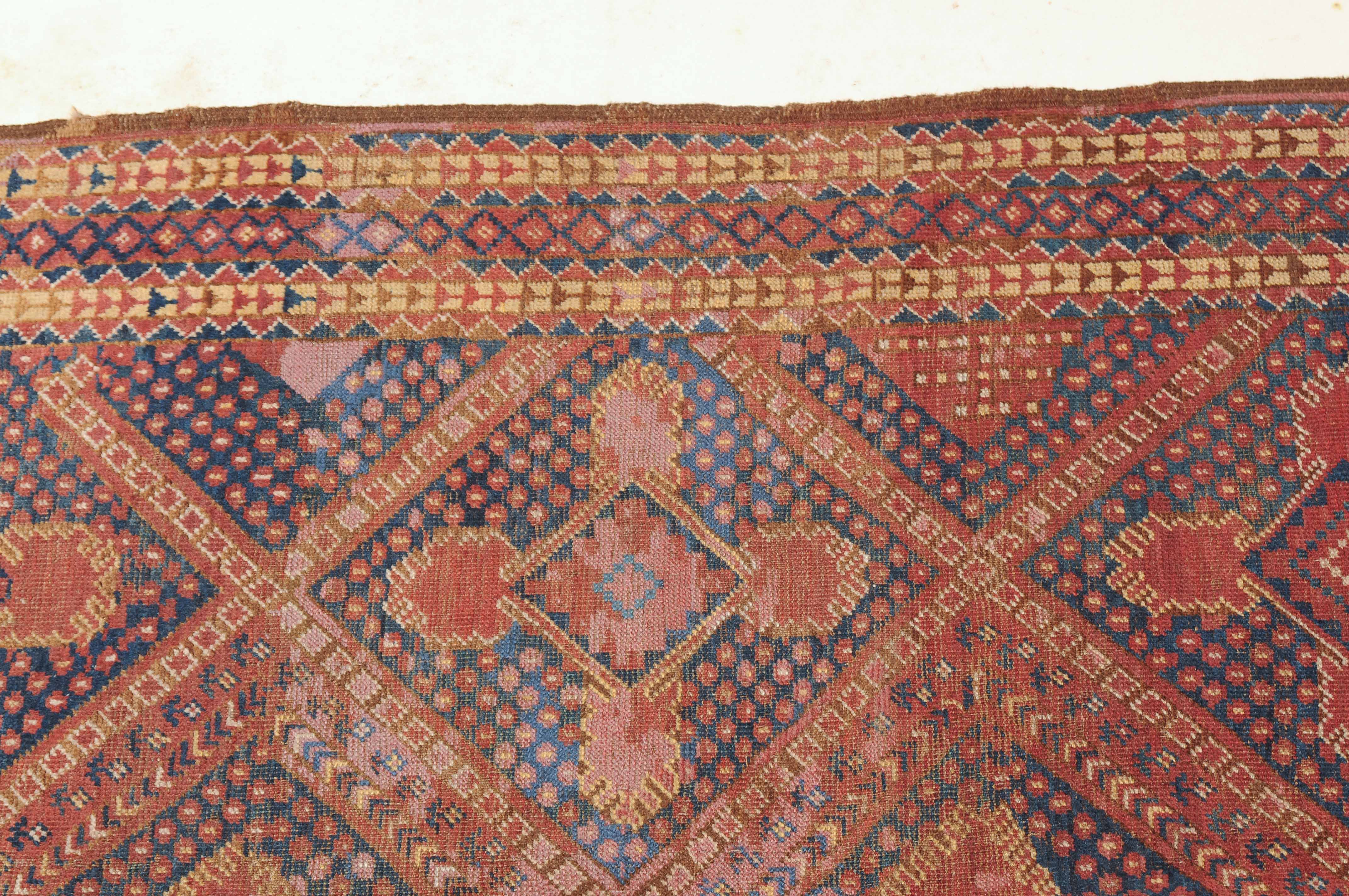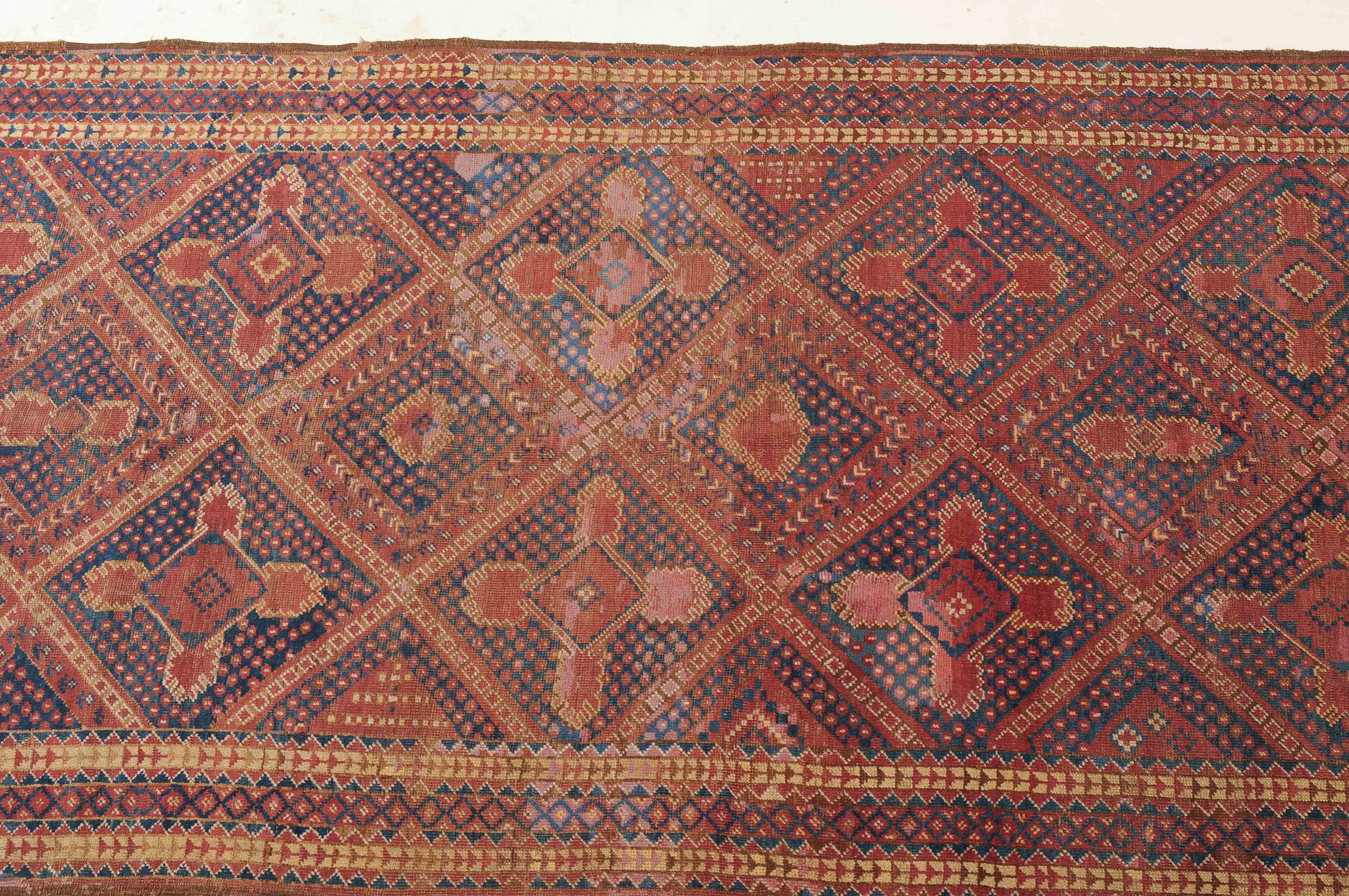 Afghanistan, um 1900. Seltene Musterung. Verschiedene Rauten-Variationen belegen in diagonalen Reihen durchgehend das ziegelrote Mittelfeld, flankiert von in unendlichem Rapport gestreuten Blütenmotiven. Die mit Rauten und Halbrauten in alternierenden Farben belegte Hauptbordüre wird von mehreren dekorativen Borten gesäumt. Natürlicher Abrash. Grosse reparierte Stelle im Feld. Gebrauchsspuren. 140x340 cm (ft. 4.6x11.2).