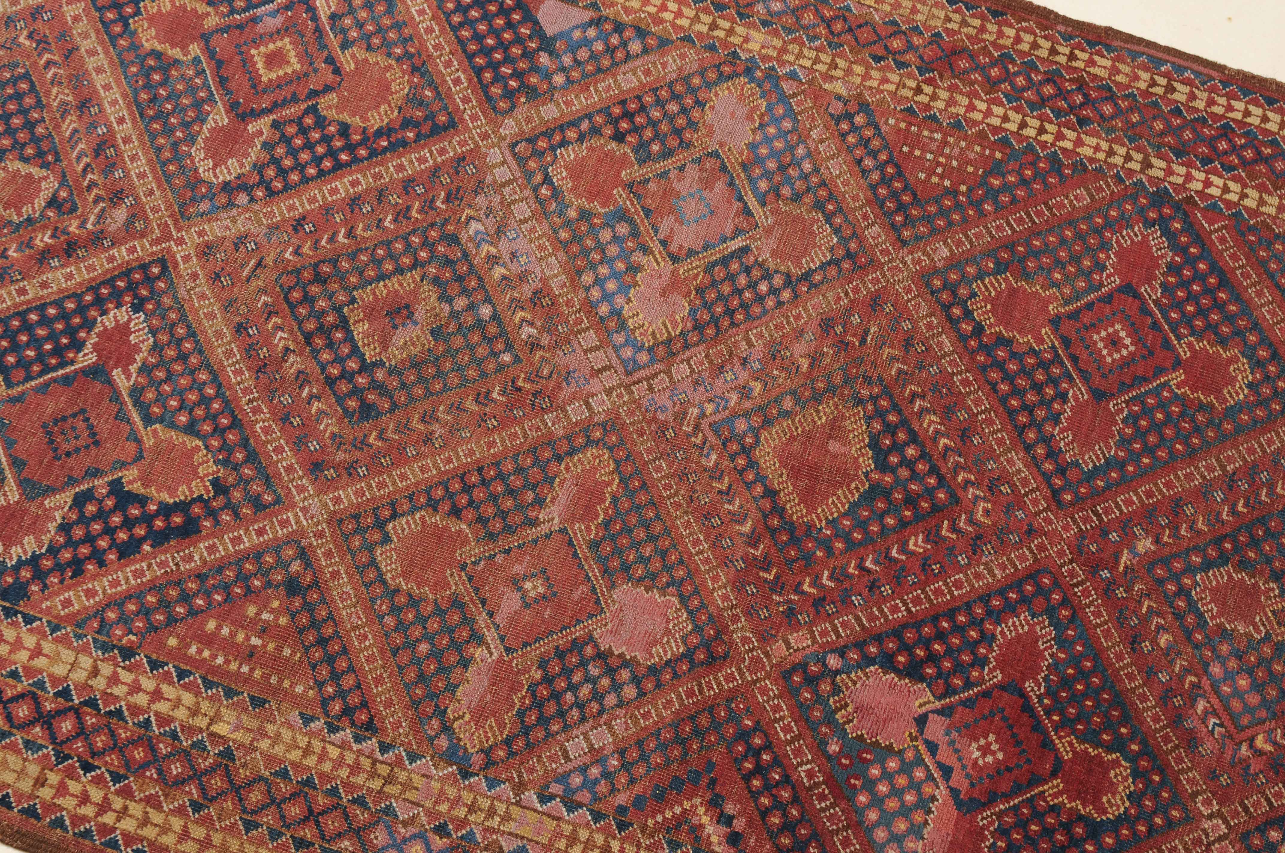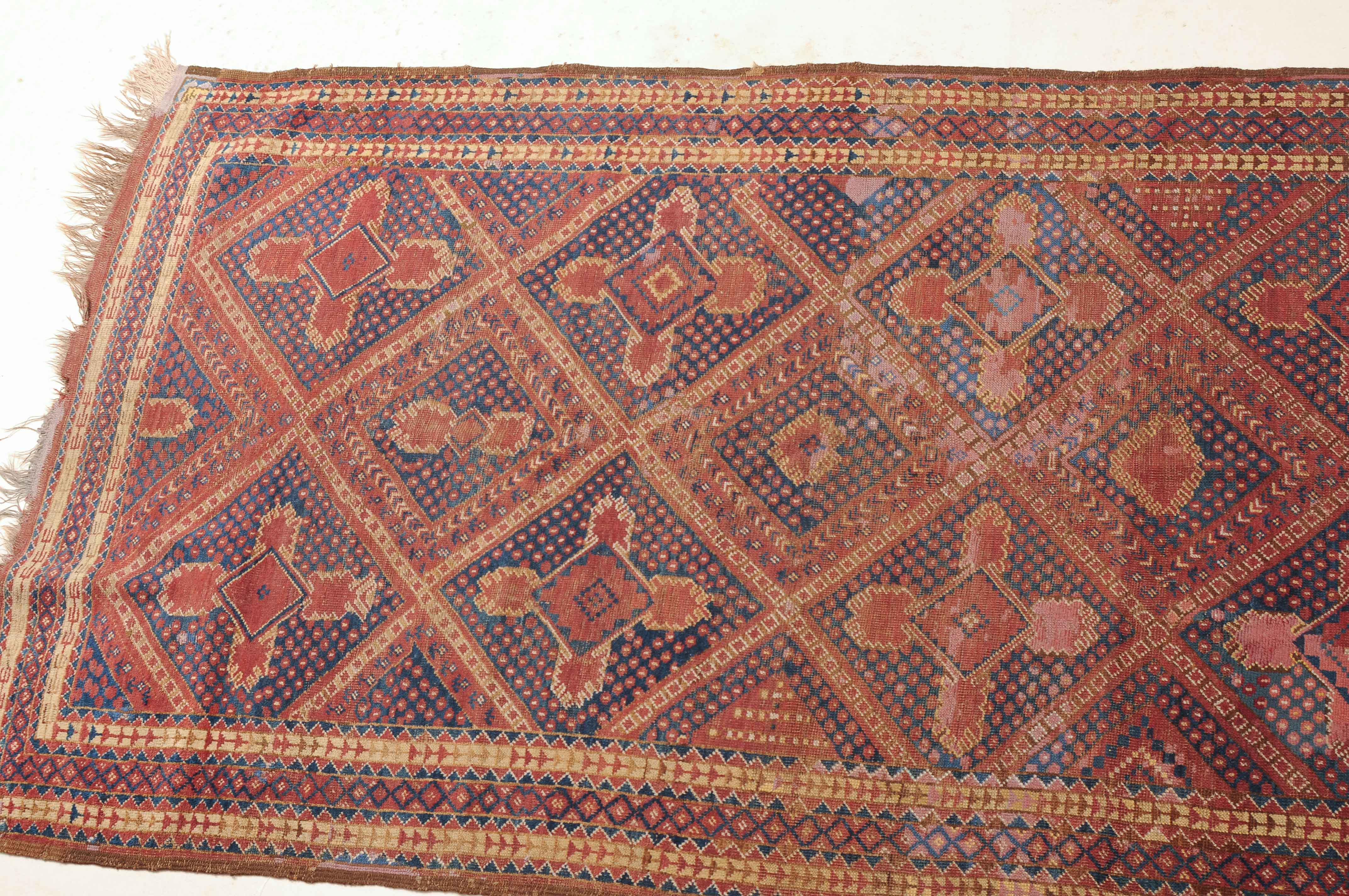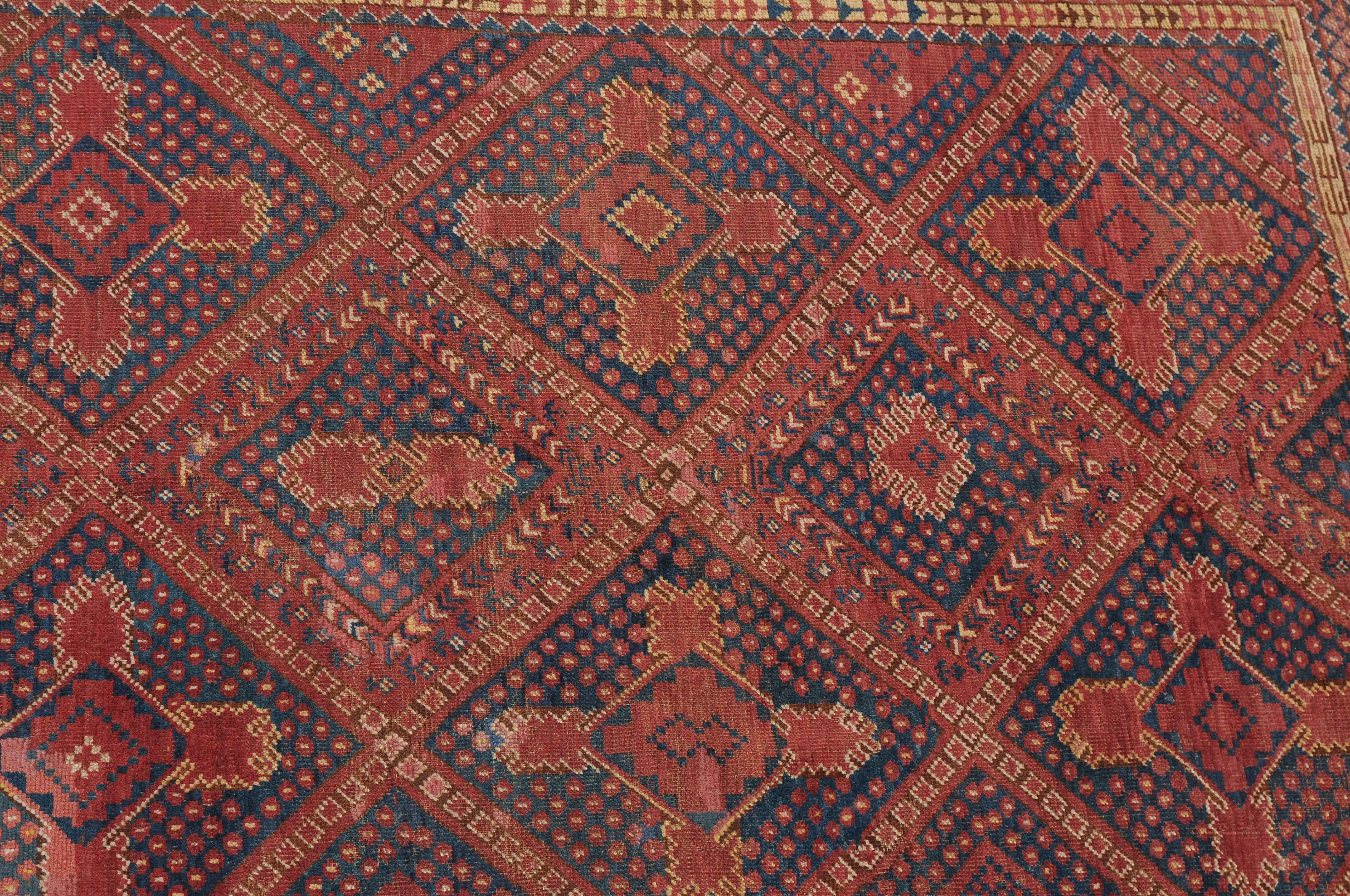 Afghanistan, um 1900. Seltene Musterung. Verschiedene Rauten-Variationen belegen in diagonalen Reihen durchgehend das ziegelrote Mittelfeld, flankiert von in unendlichem Rapport gestreuten Blütenmotiven. Die mit Rauten und Halbrauten in alternierenden Farben belegte Hauptbordüre wird von mehreren dekorativen Borten gesäumt. Natürlicher Abrash. Grosse reparierte Stelle im Feld. Gebrauchsspuren. 140x340 cm (ft. 4.6x11.2).