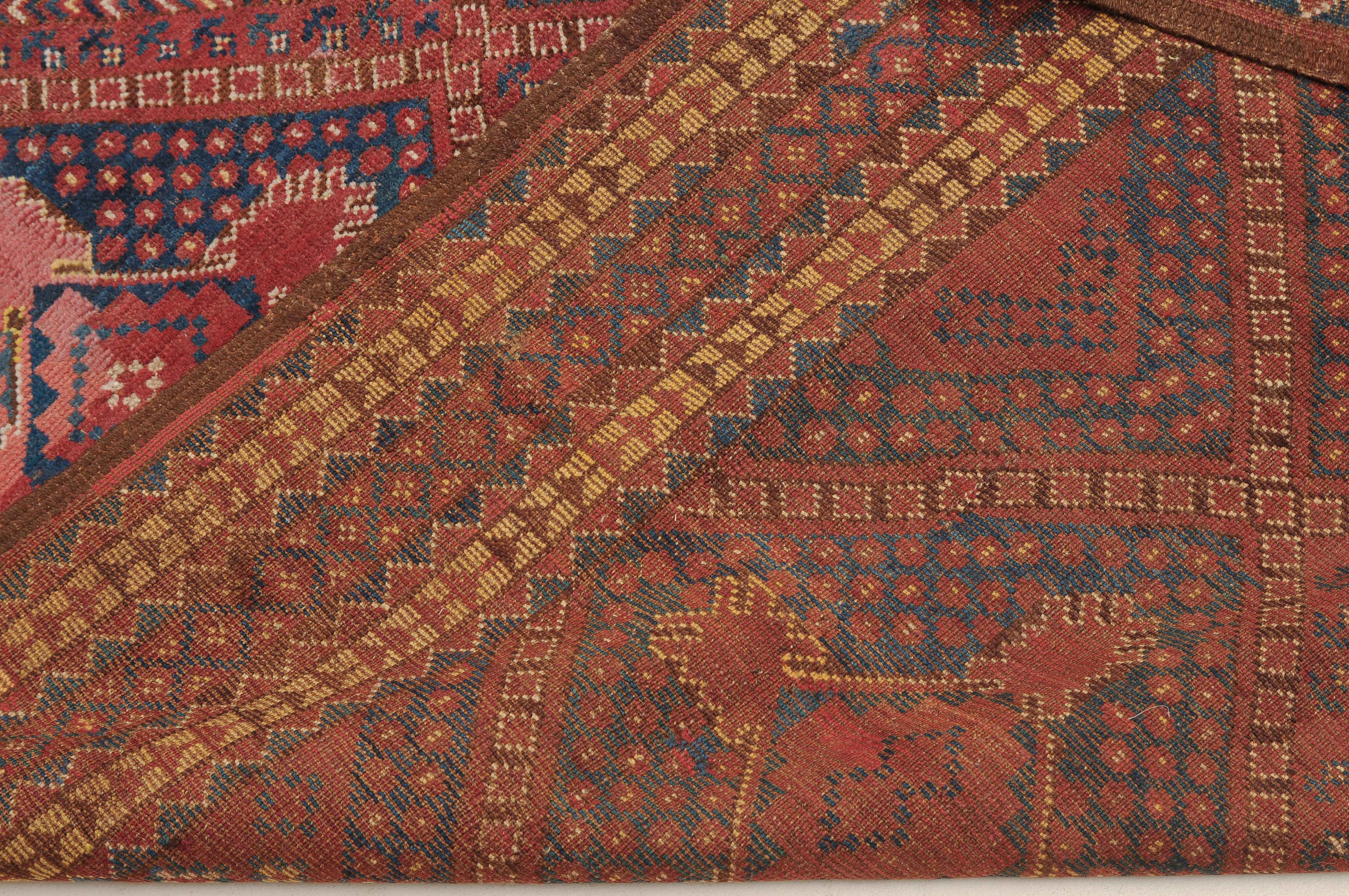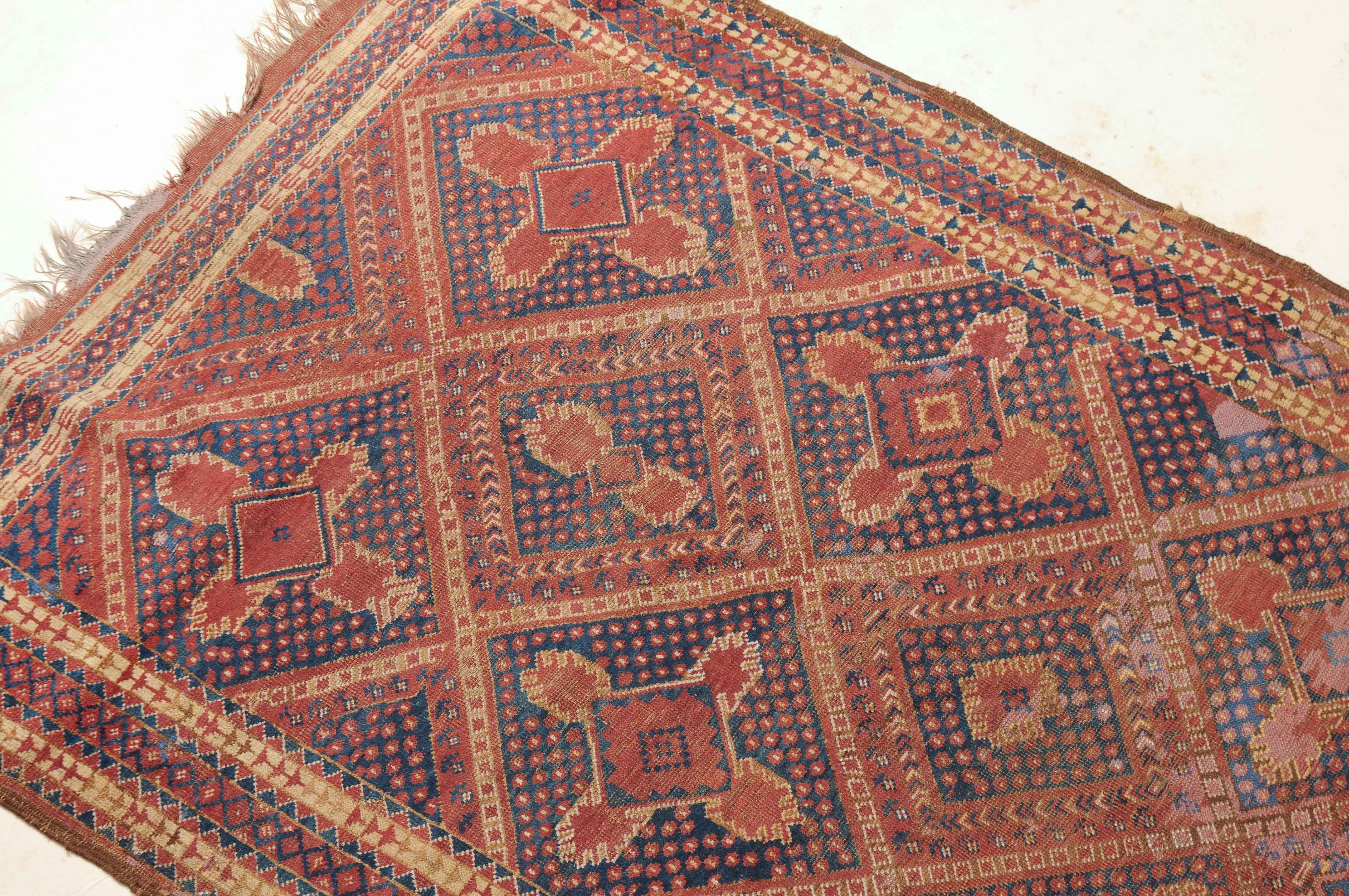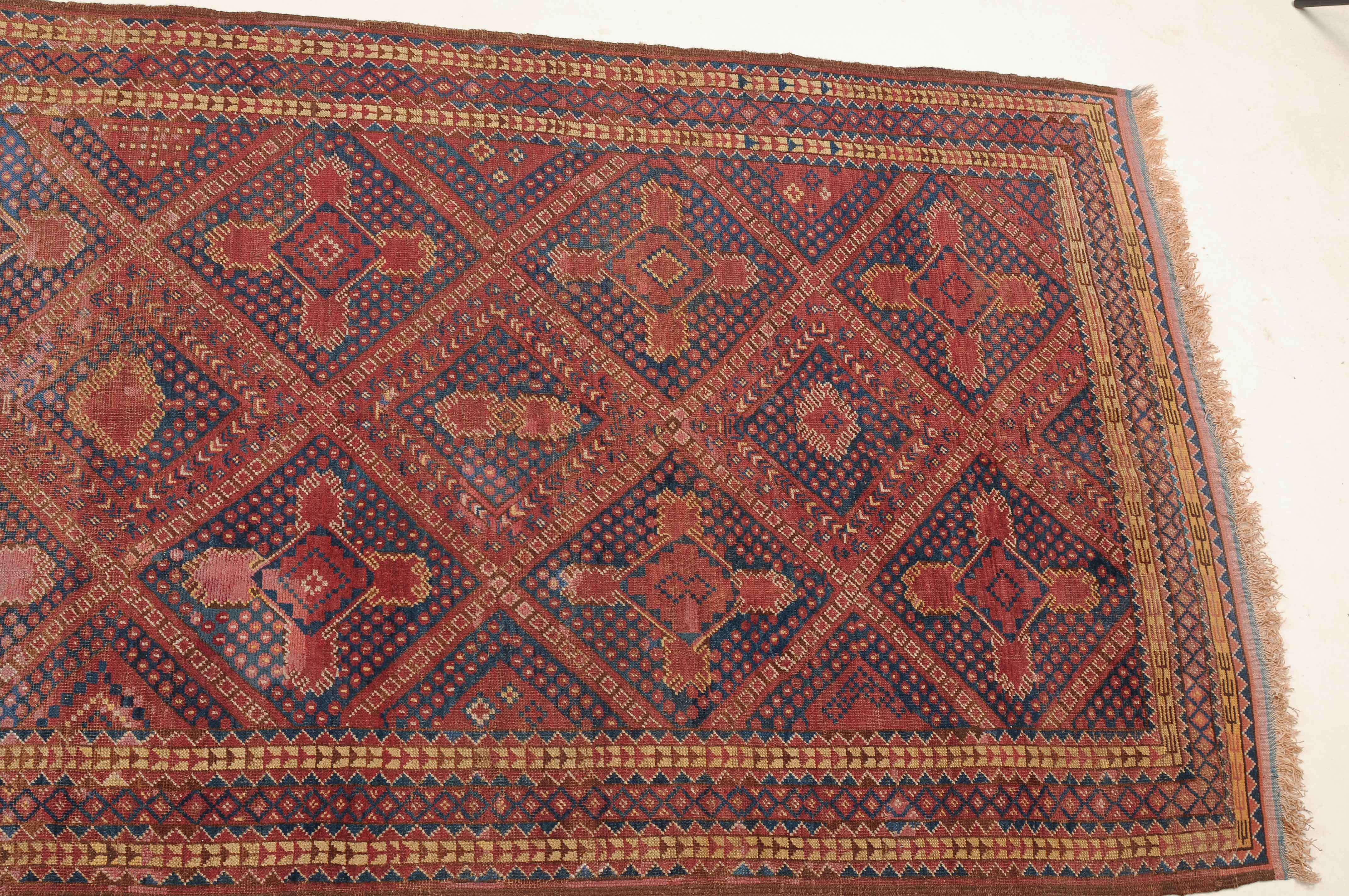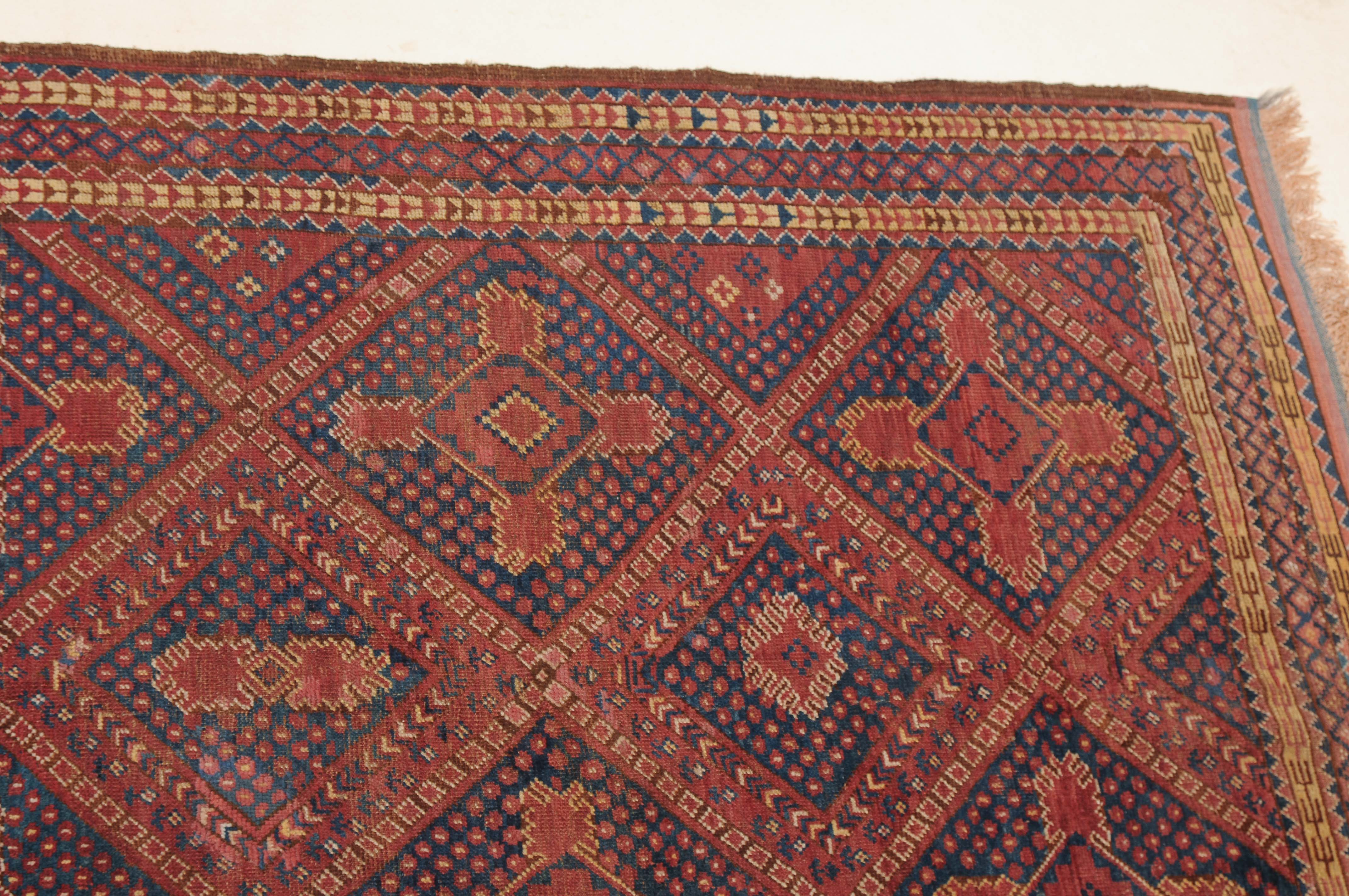 Afghanistan, um 1900. Seltene Musterung. Verschiedene Rauten-Variationen belegen in diagonalen Reihen durchgehend das ziegelrote Mittelfeld, flankiert von in unendlichem Rapport gestreuten Blütenmotiven. Die mit Rauten und Halbrauten in alternierenden Farben belegte Hauptbordüre wird von mehreren dekorativen Borten gesäumt. Natürlicher Abrash. Grosse reparierte Stelle im Feld. Gebrauchsspuren. 140x340 cm (ft. 4.6x11.2).