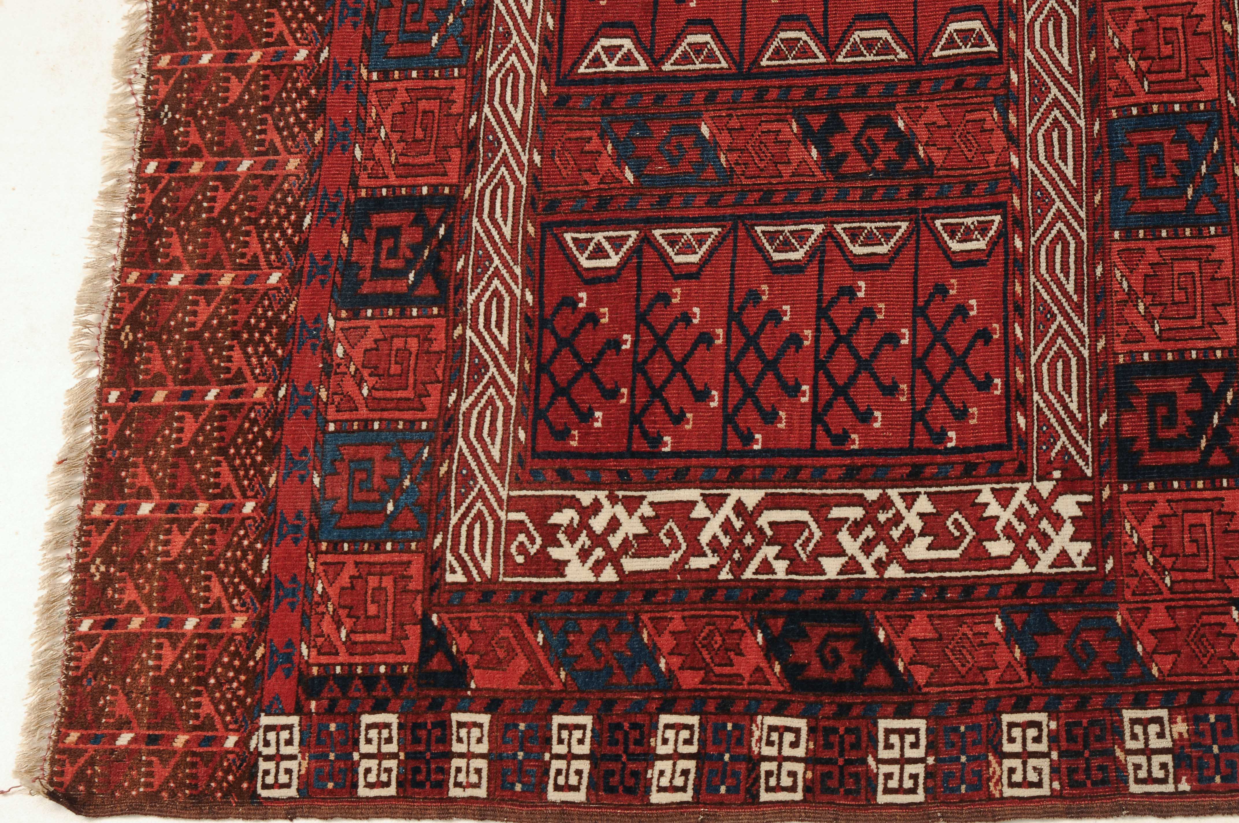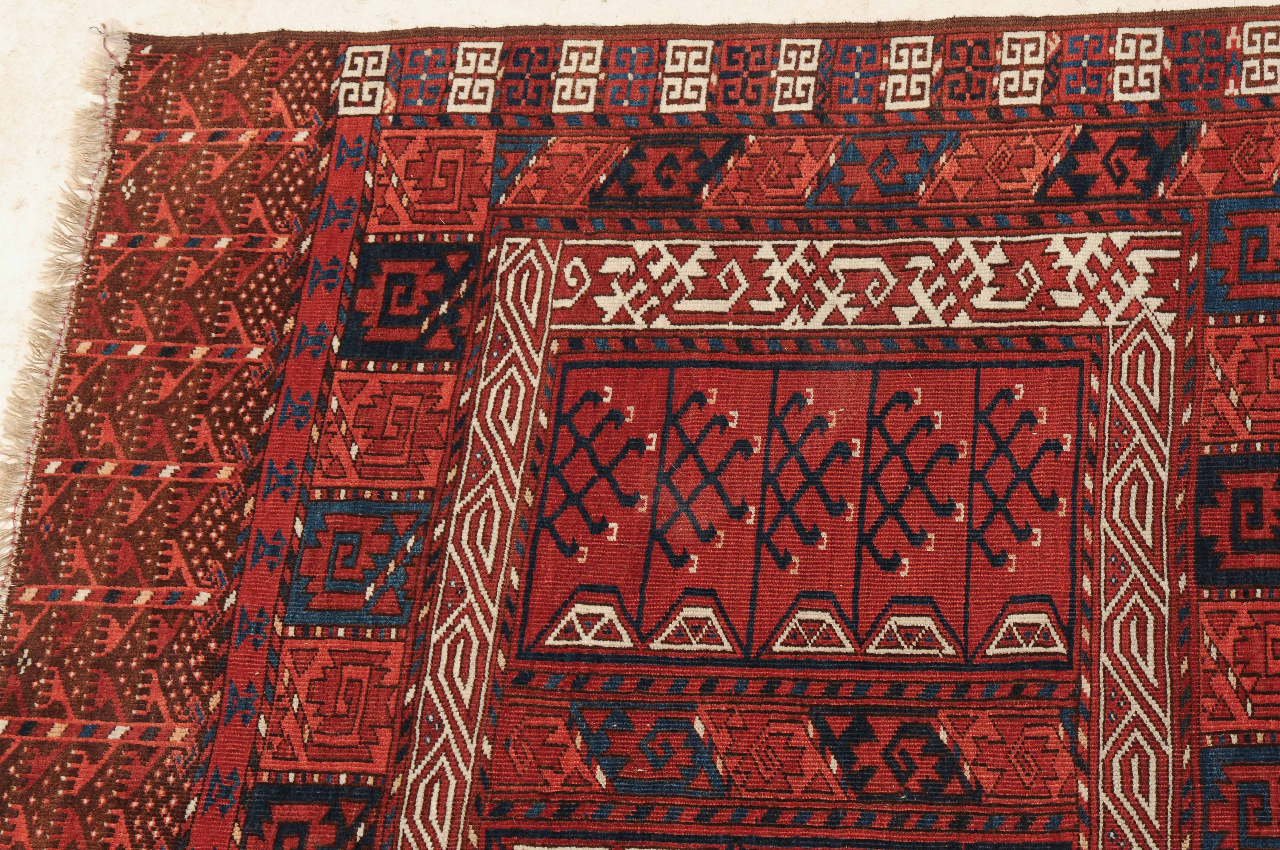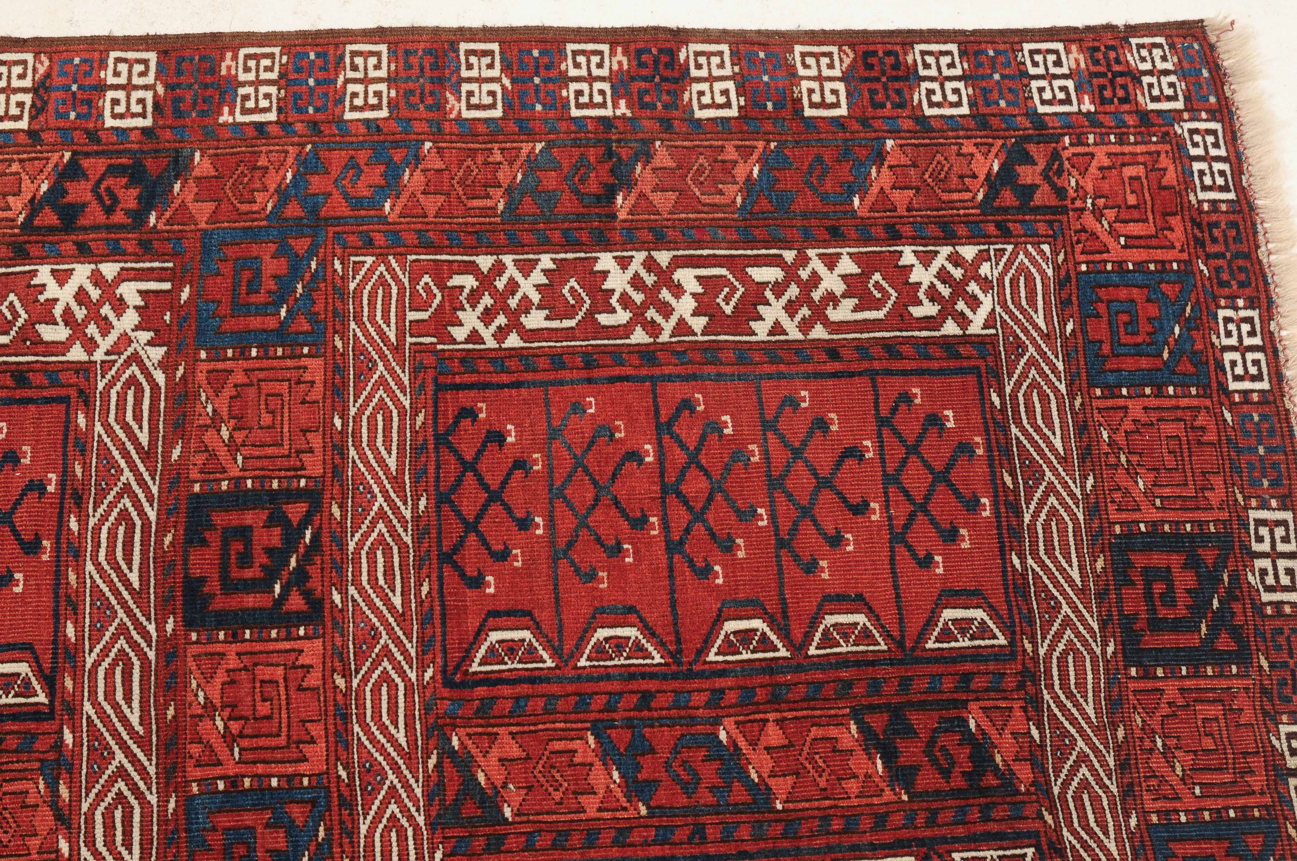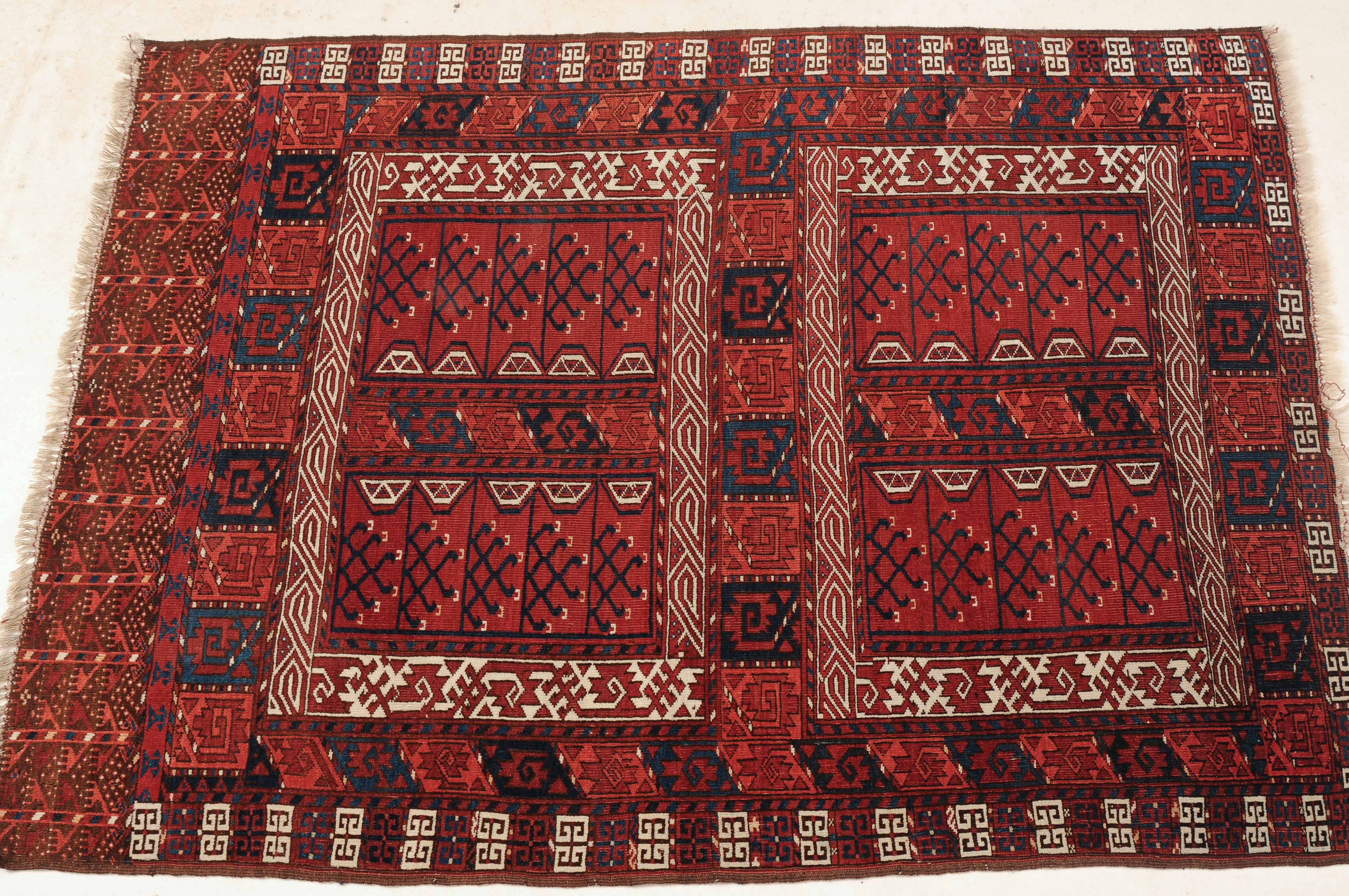 Afghanistan, um 1900. Mehrere Bordüren umranden das in der typisch braunroten Farbe gehaltene Mittelfeld, das in 4 Engsi-Zonen geteilt ist, die im Inneren mit gereihten Göls geschmückt sind. Extrafeine Schürze mit Lebensbäumen. Gebrauchsspuren. 133x185 cm (ft. 4.4x6.1).