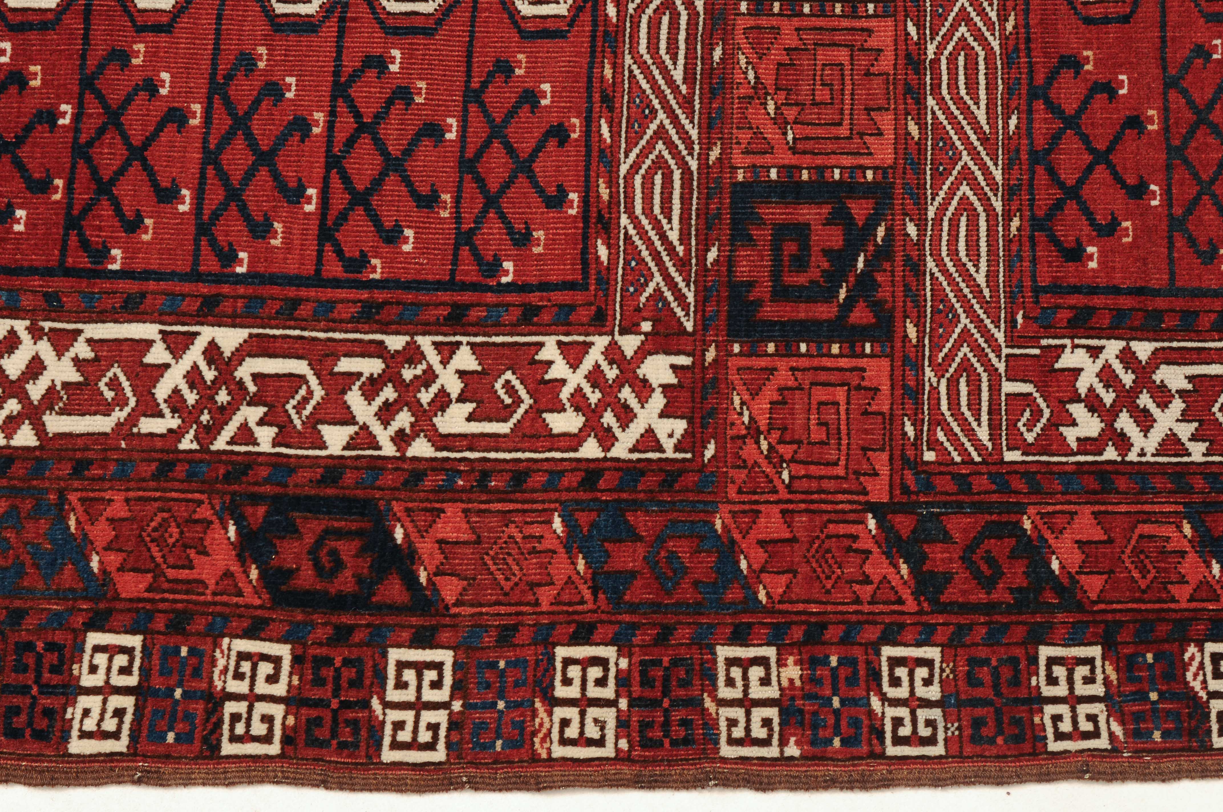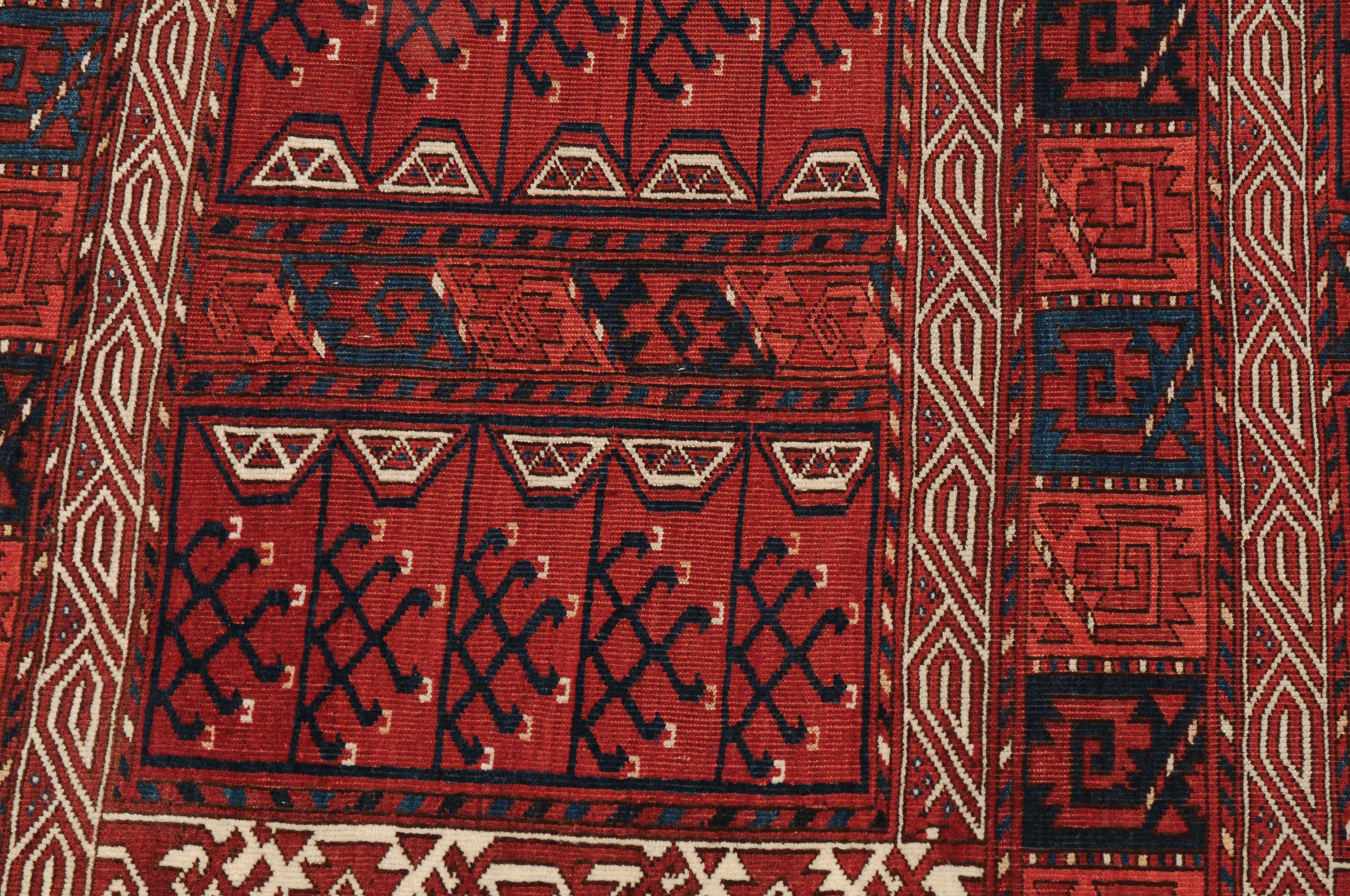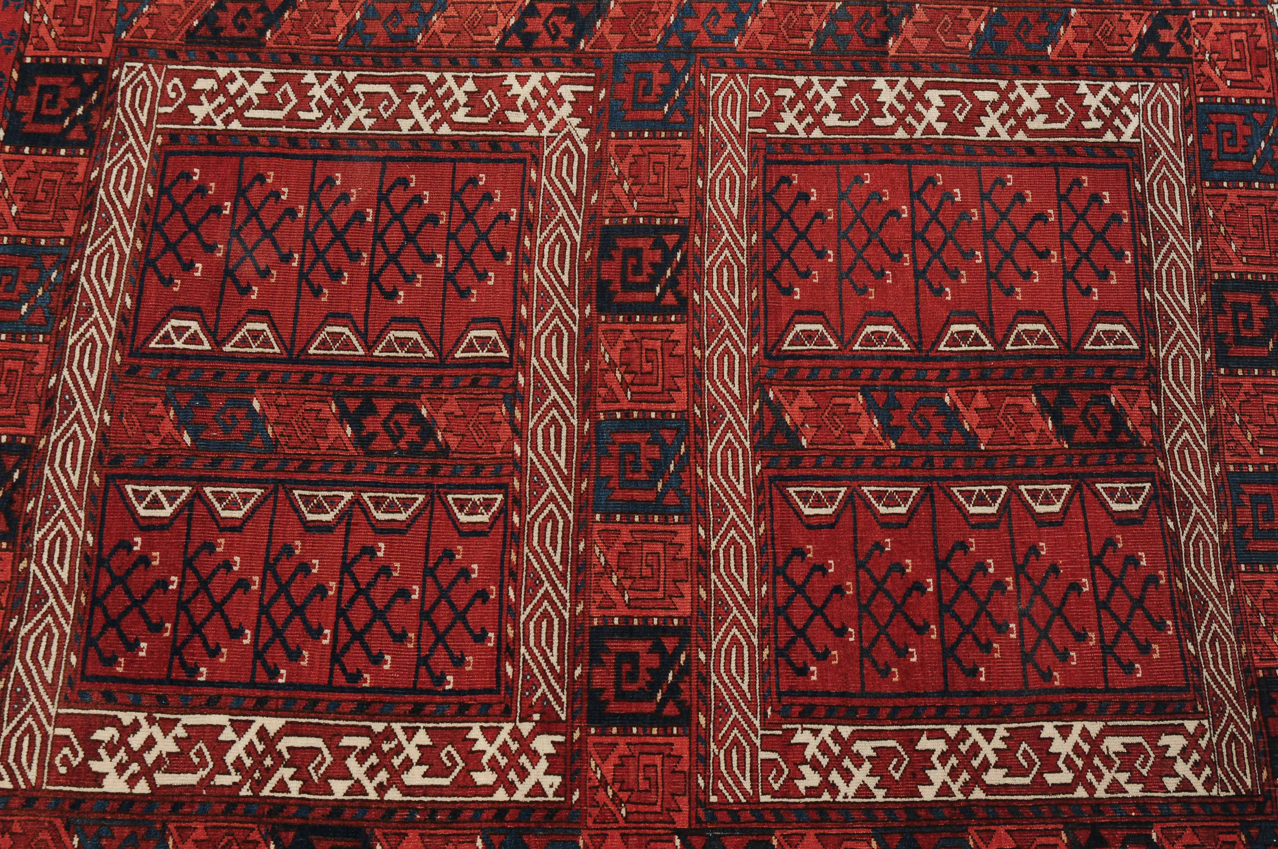 Afghanistan, um 1900. Mehrere Bordüren umranden das in der typisch braunroten Farbe gehaltene Mittelfeld, das in 4 Engsi-Zonen geteilt ist, die im Inneren mit gereihten Göls geschmückt sind. Extrafeine Schürze mit Lebensbäumen. Gebrauchsspuren. 133x185 cm (ft. 4.4x6.1).