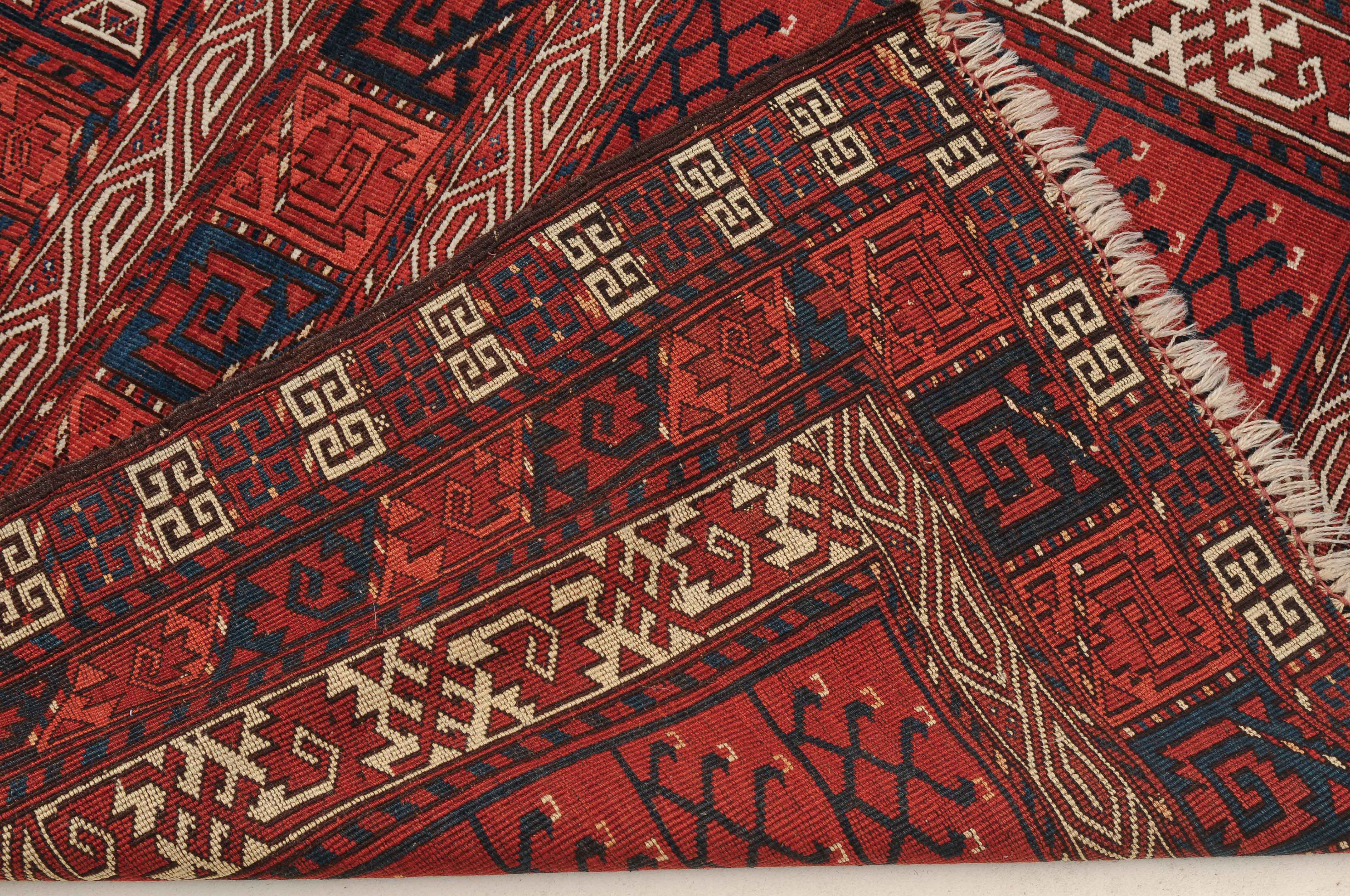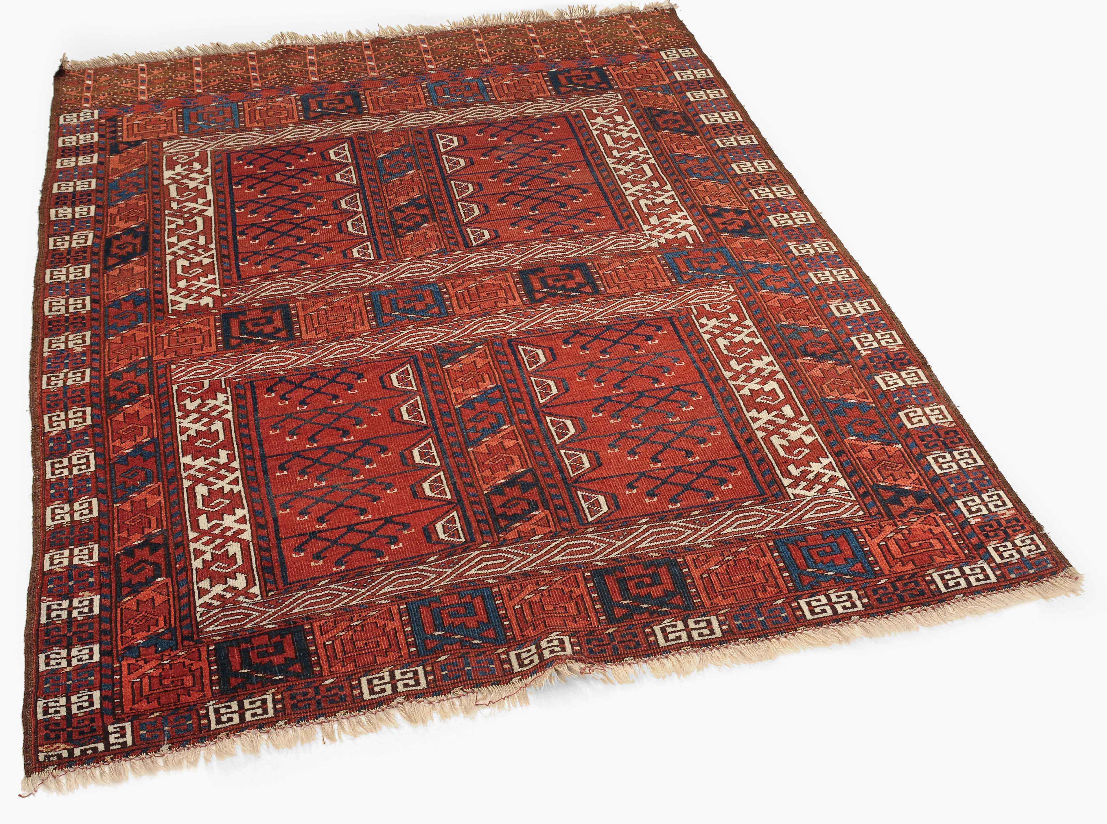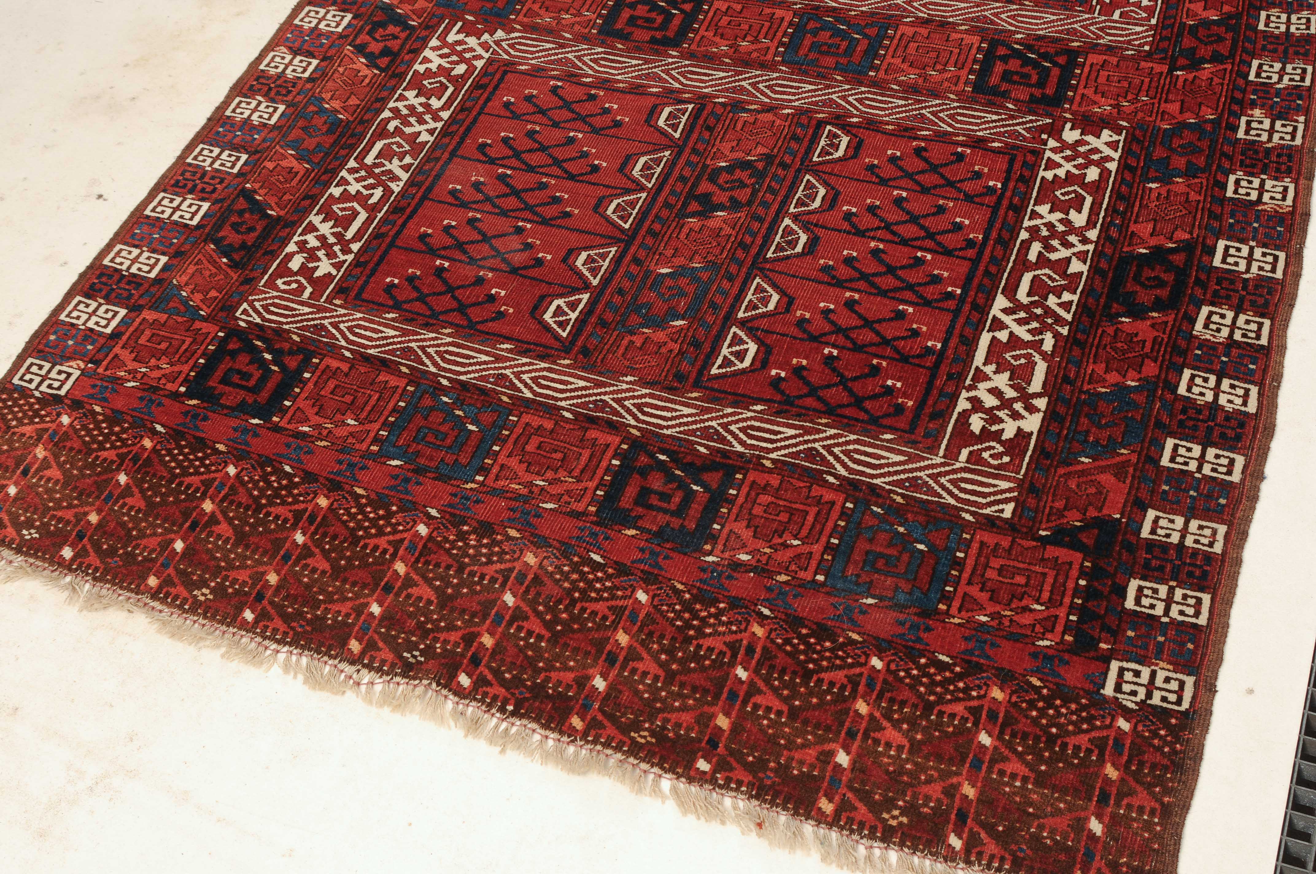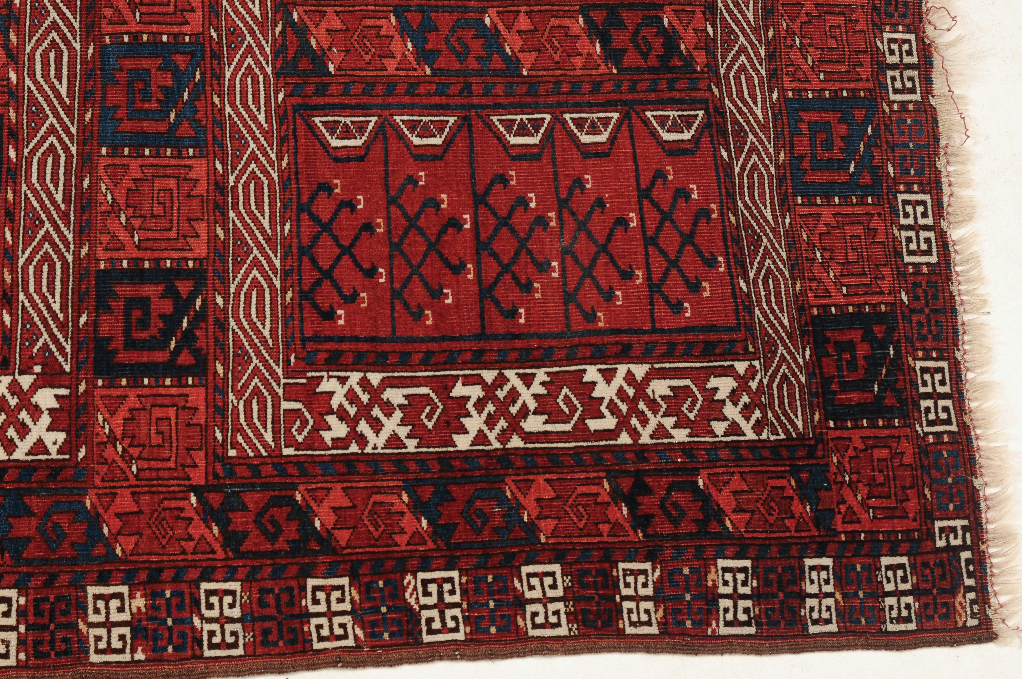 Afghanistan, um 1900. Mehrere Bordüren umranden das in der typisch braunroten Farbe gehaltene Mittelfeld, das in 4 Engsi-Zonen geteilt ist, die im Inneren mit gereihten Göls geschmückt sind. Extrafeine Schürze mit Lebensbäumen. Gebrauchsspuren. 133x185 cm (ft. 4.4x6.1).