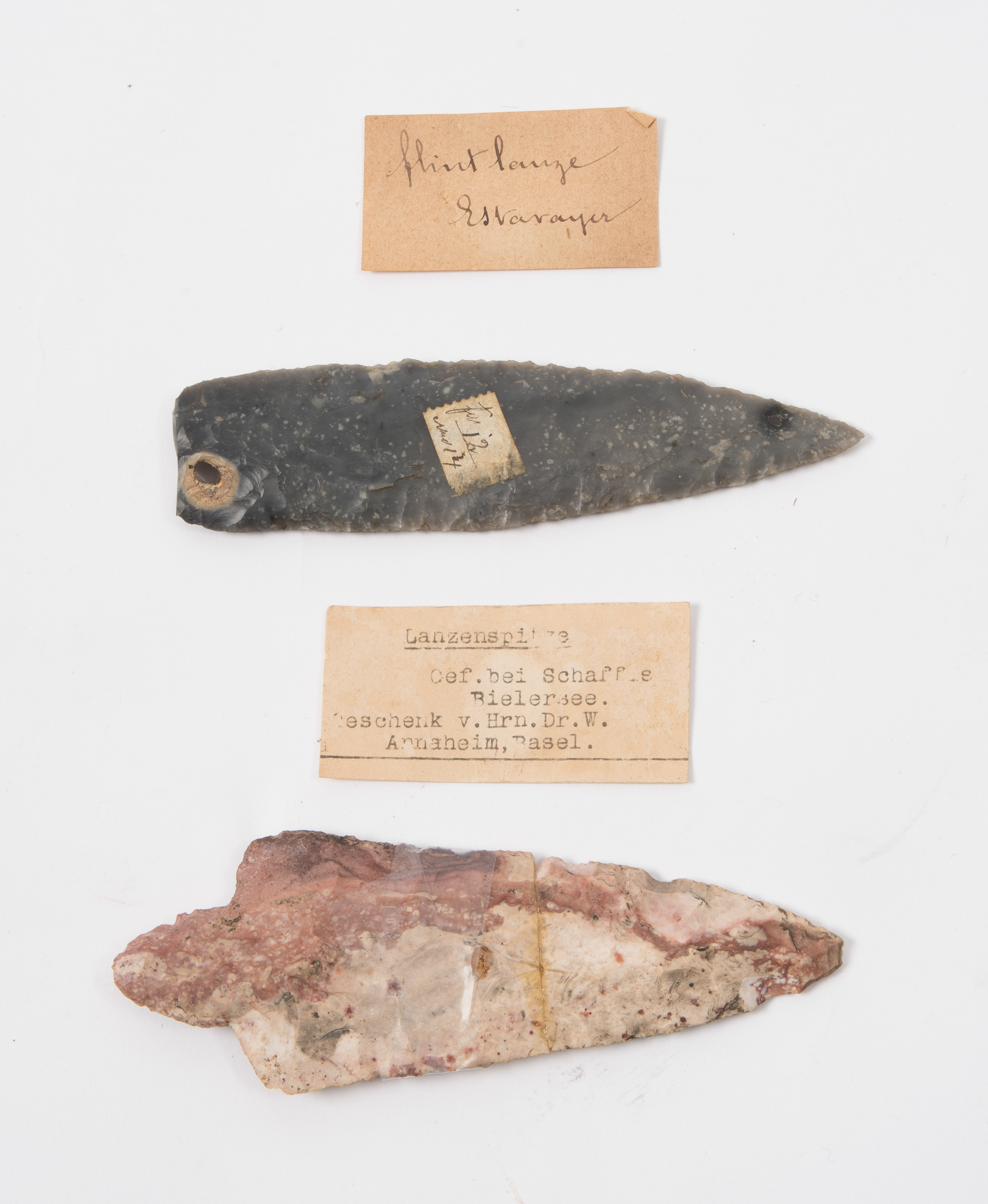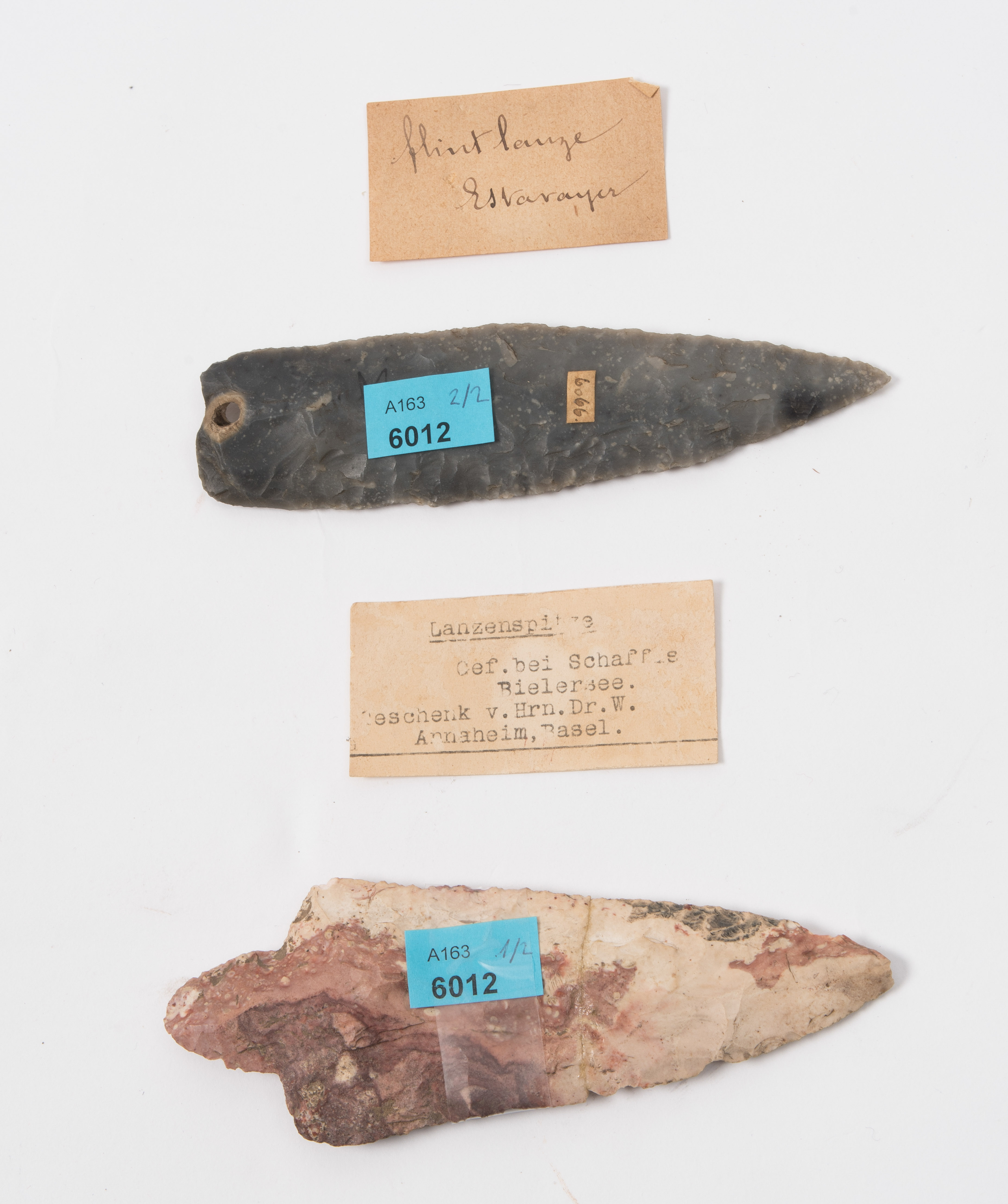 Schweiz, Neolithikum, ca. 4000 - 2500 v. Chr. Provenienz: 1996 aufgelöste Sammlung Bally-Briord, Schönenwerd. 1. Spitze aus rötlich-weiss gebändertem Hornstein mit alt geklebter Bruchstelle, gef. bei Schafis am Bielersee. L 13,8 cm. 2. Spitze aus grauem Silex mit einer Bohrung am Ansatz, gef. bei Estavayer. Zwei Beispiele für die jungsteinzeitliche Silexverarbeitung auf höchstem Niveau. L 13,4 cm.