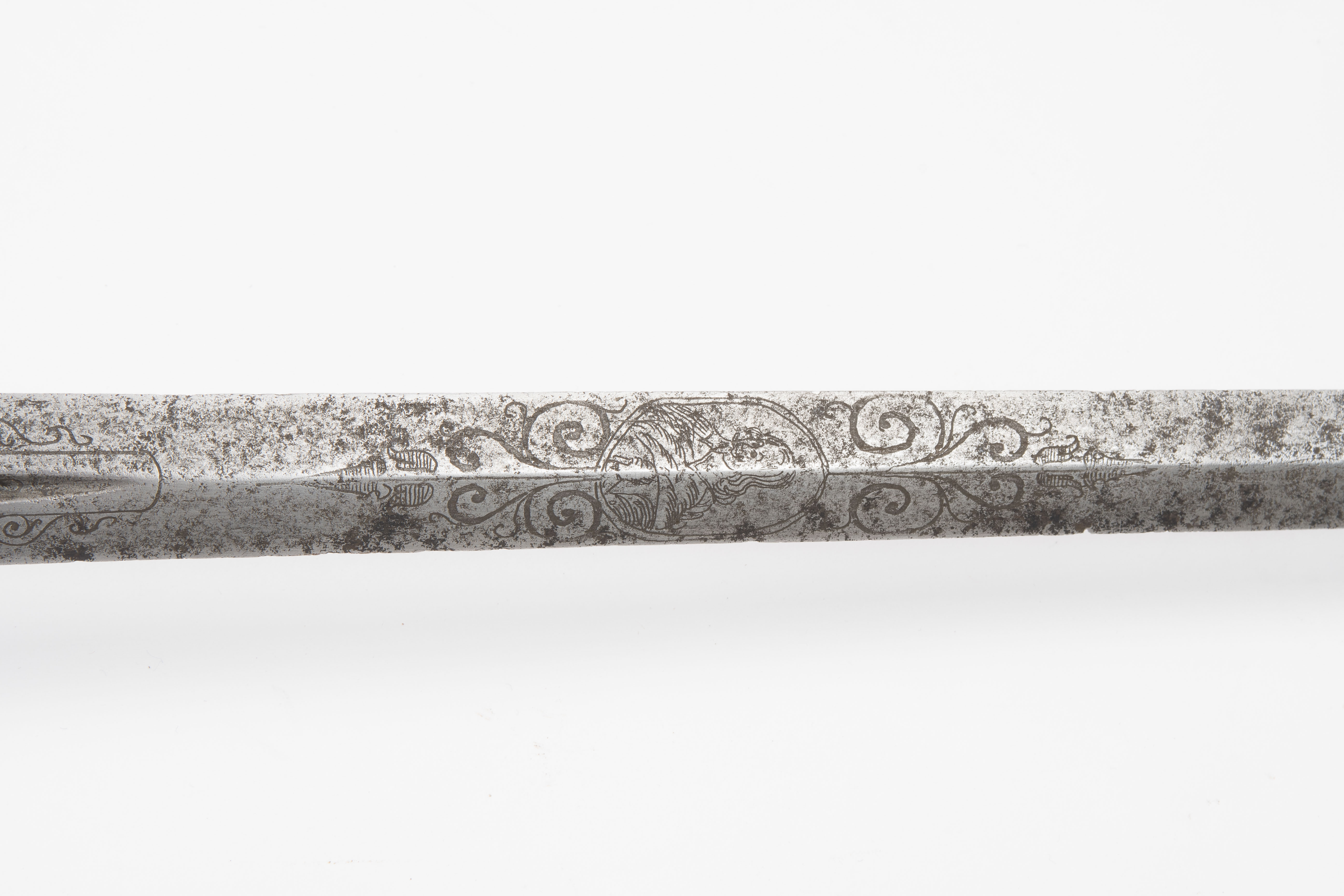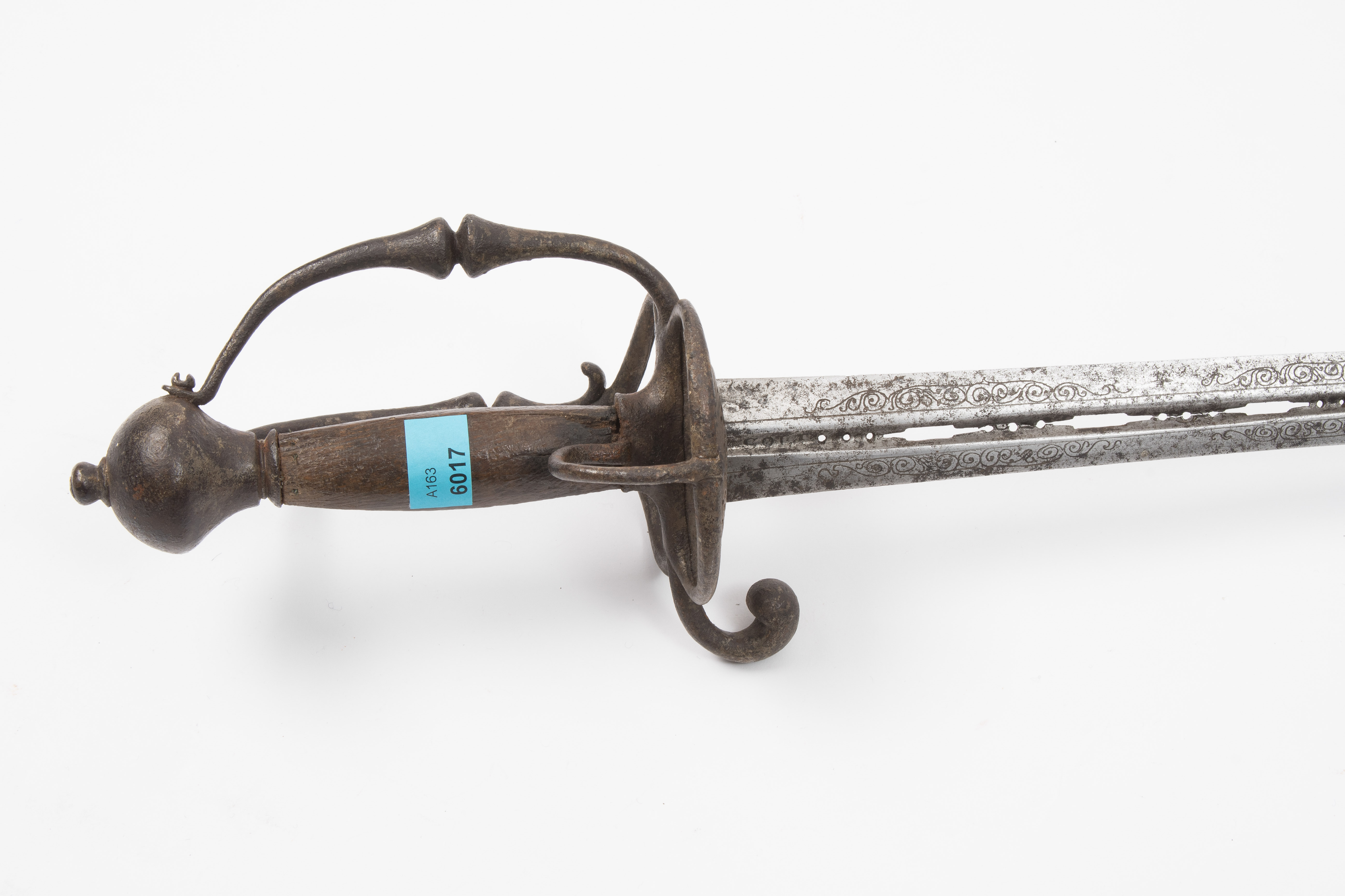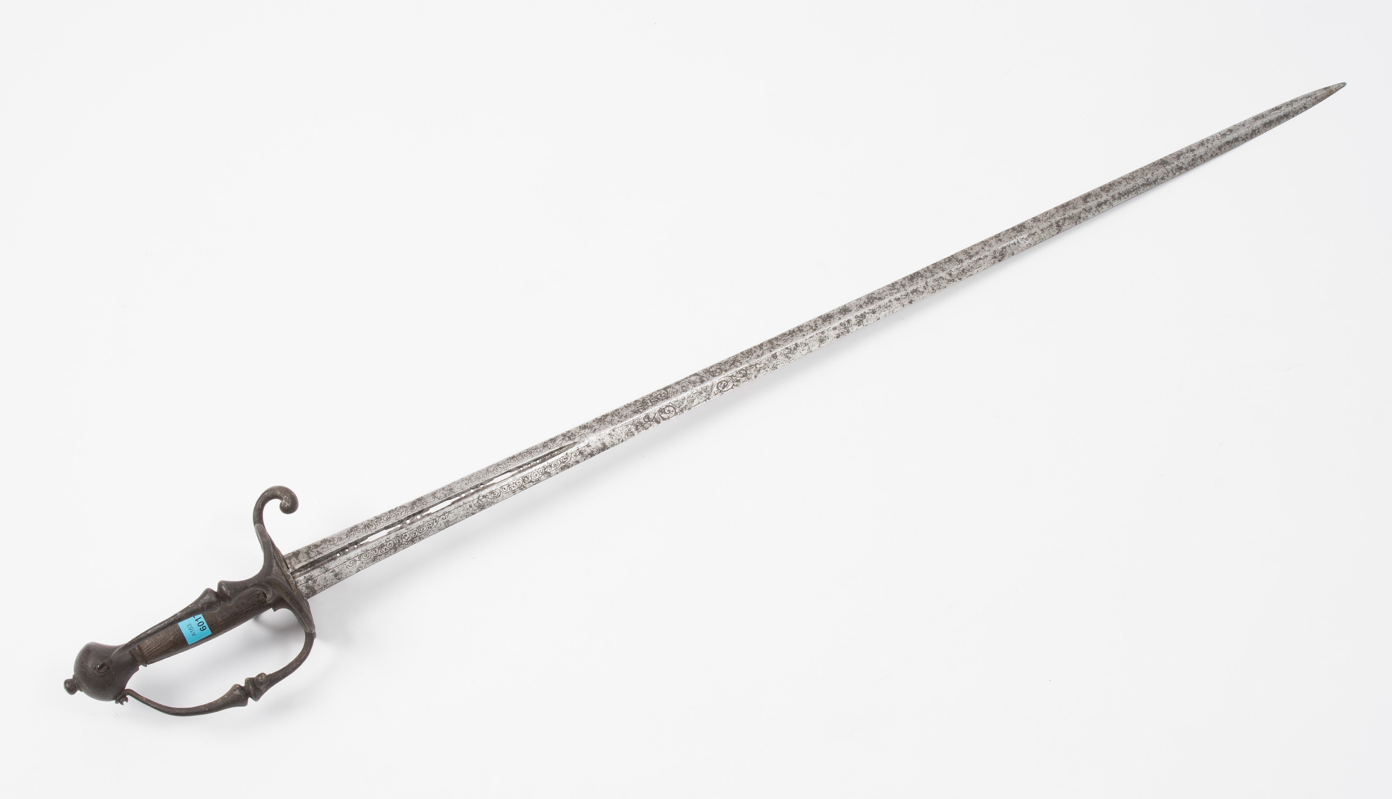 Deutschland/Niederlande, 1. Hälfte 17. Jh., wohl Offizierswaffe. Korrodiertes Gefäss mit pilzförmigem Knauf, nodusverziertem Griff- und Terzbügel, Daumenbügel und erhaltenem Quartstichblatt mit sternförmigen Durchbrechungen; das Terzstichblatt fehlt ebenso, wie die Drahtwicklung der Hilze. Ältere, wohl gekürzte Rapierklinge mit Mittelgrat und Zierduchbrechungen in den 20 cm langen Hohlkehlen. Die floralen Gravuren inklusive zweier beriebener Porträtmedaillons wurden im 17. Jh., vielleicht als Auftragsarbeit im Kontext mit der Neumontage der Klinge, angebracht. L ca. 100 cm.