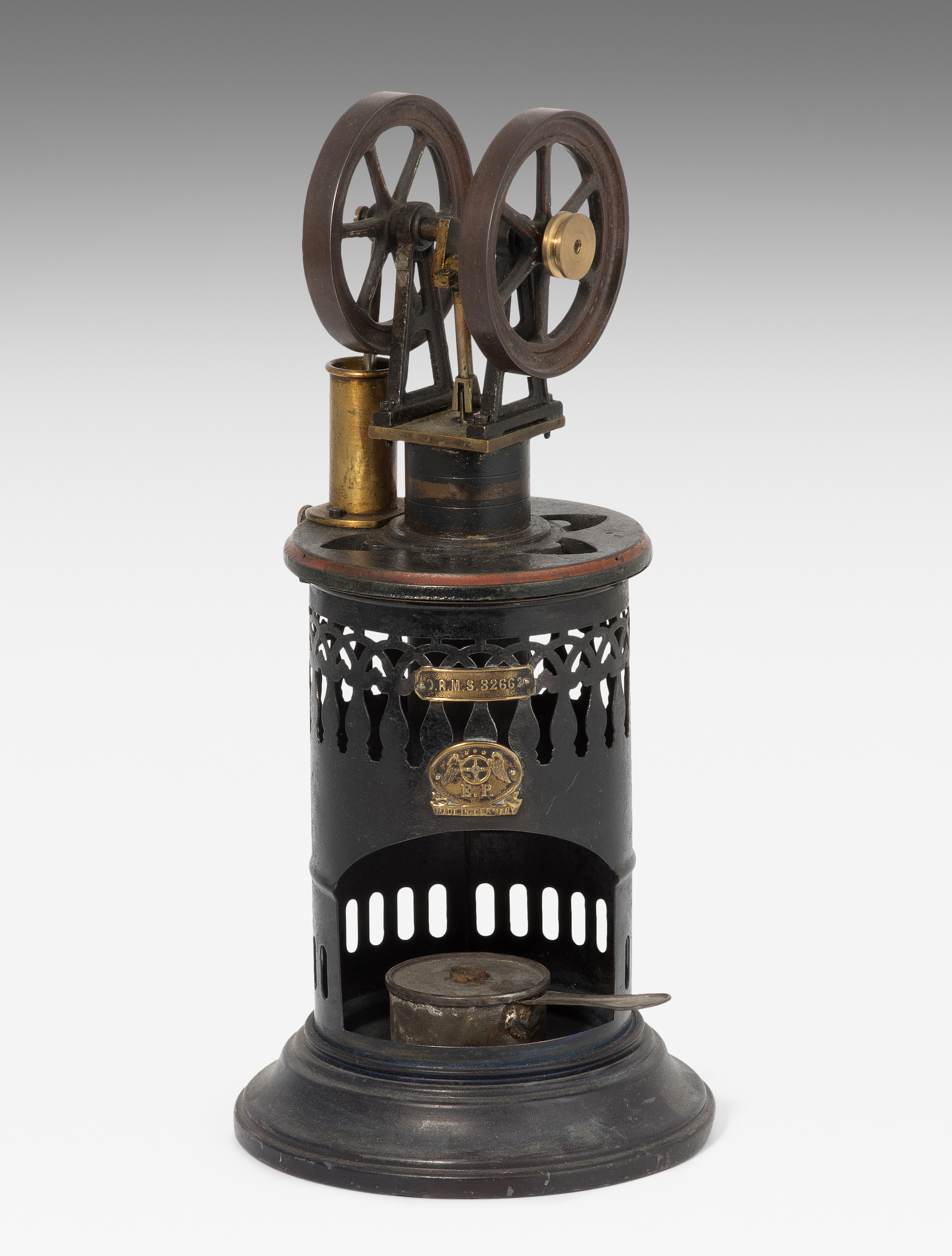 Deutschland, um 1900. Mit Firmensignet und Messingschild "D.R.M.S. 3266 2". Gusseisen, Messing und Blech. Nebeneinander gelagerte Arbeits- und Verdrängungszylinder über Rechaud mit ornamentalen Lüftungsschlitzen und Brenner. H 30 cm.