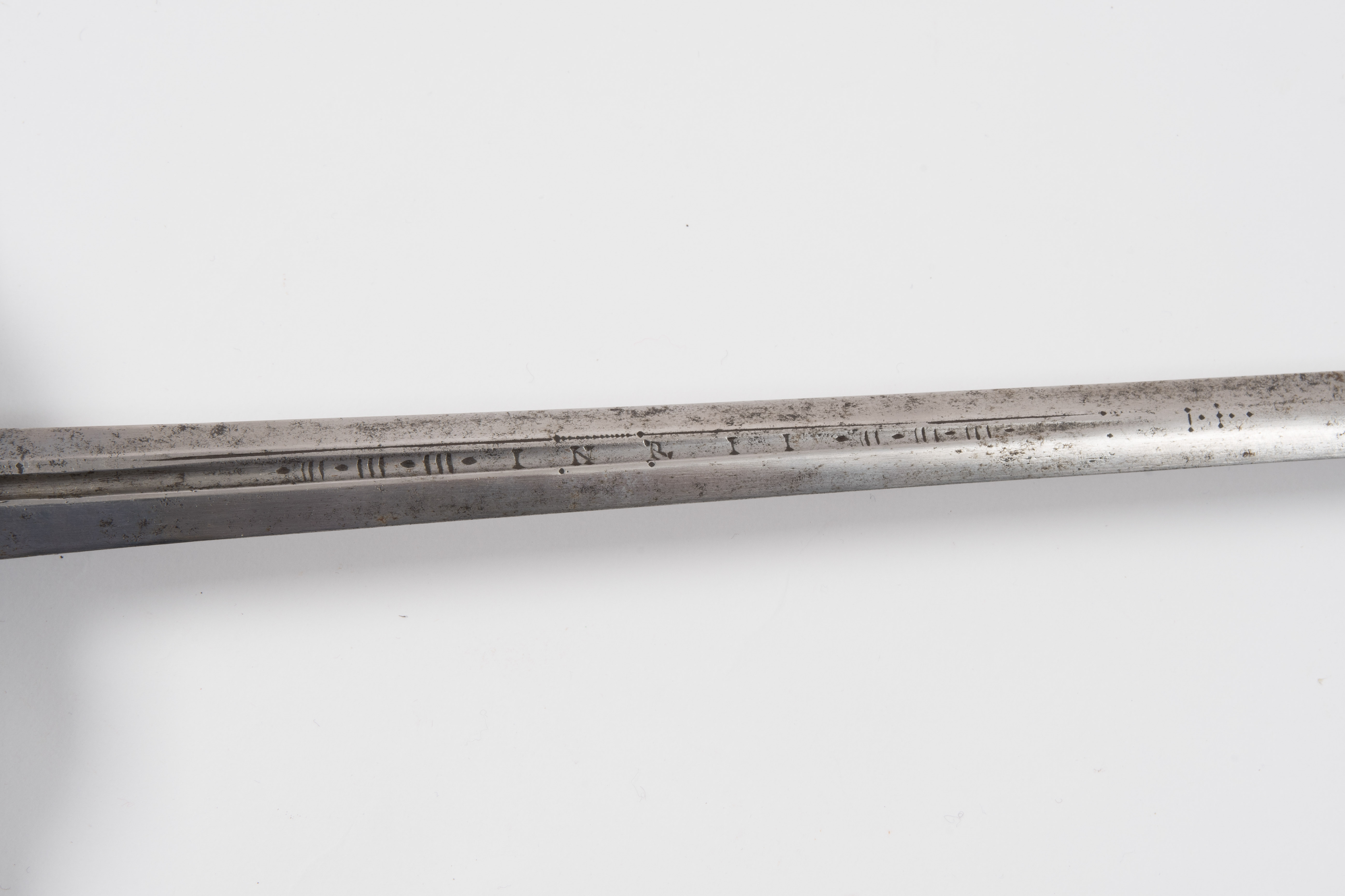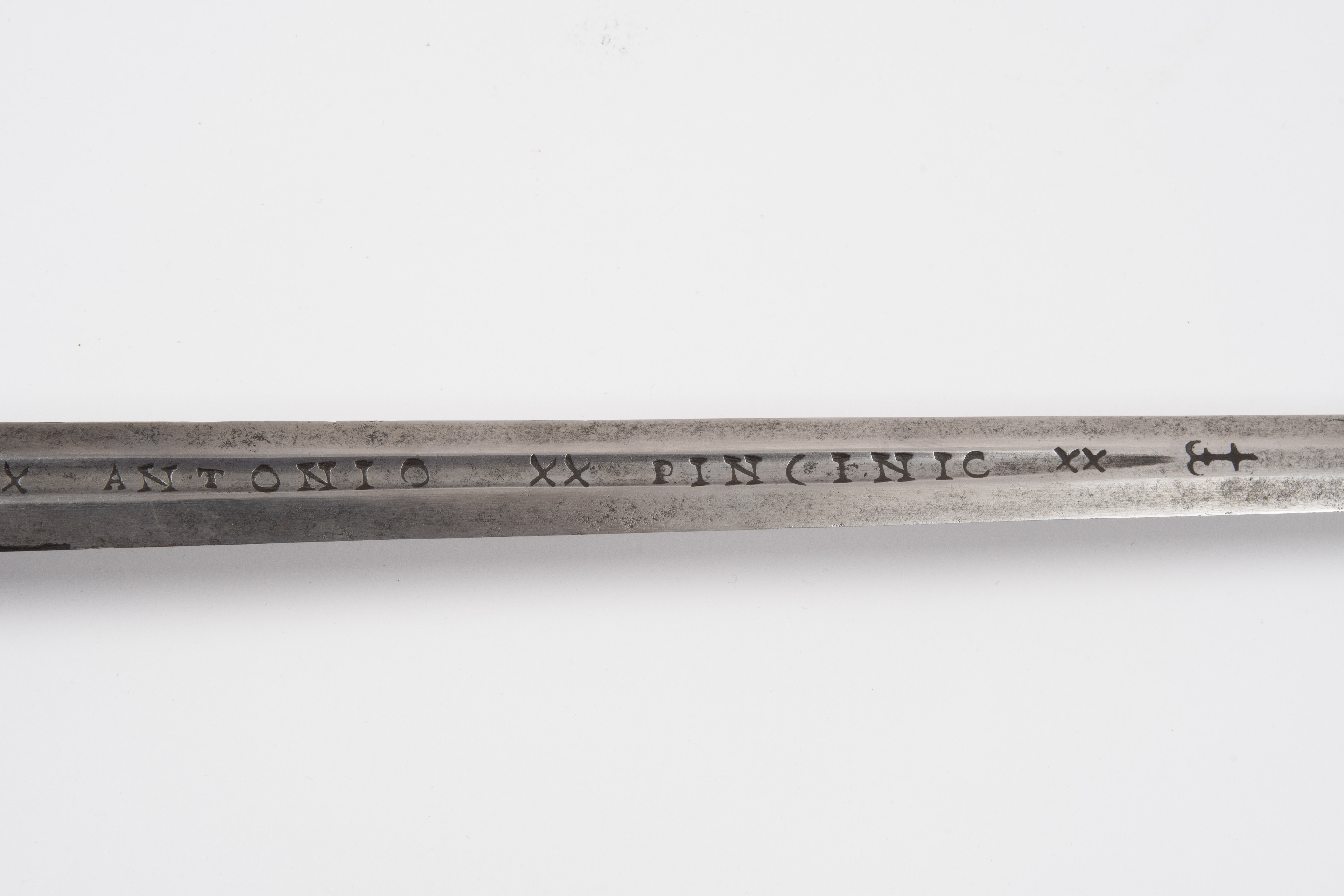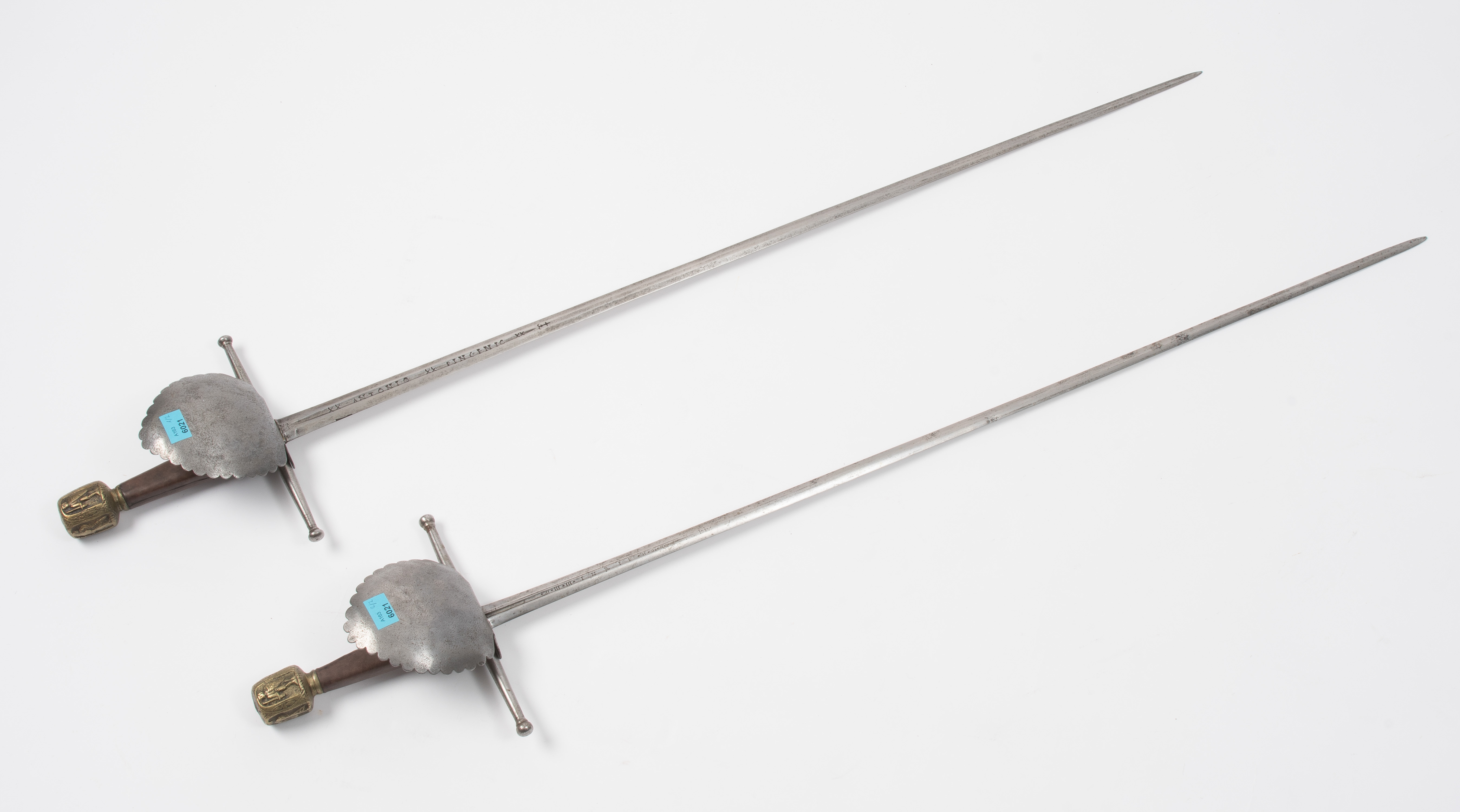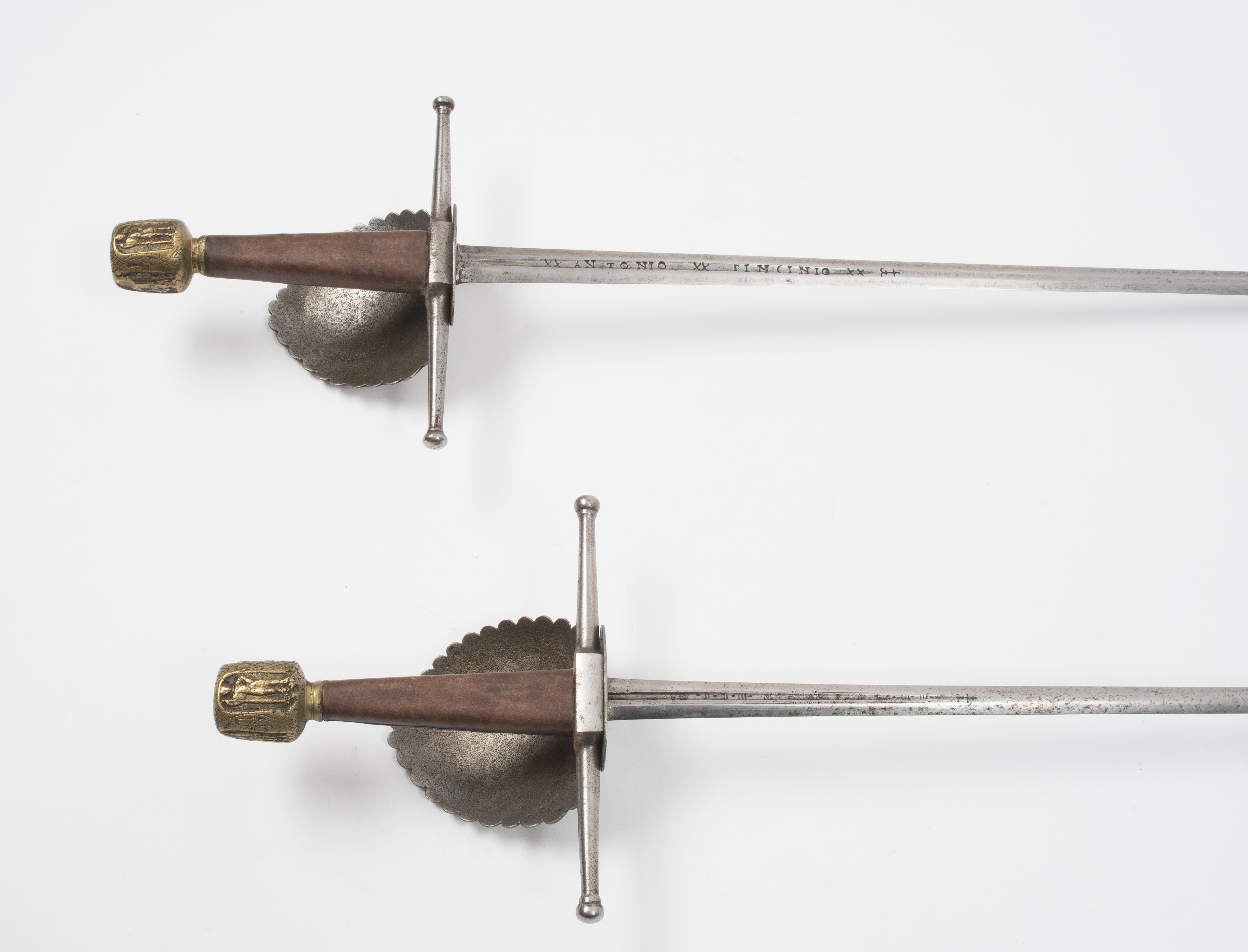 Im Stile der ersten Hälfte des späten 16./ frühen17. Jh.; wohl im späteren 19. Jh. unter Verwendung authentischer Klingen des 17./18. Jh. zusammengestellt. Kreuzgefässe mit identisch gegossenen, figurenverzierten Messingknäufen. Maschinell gefertigte Parierstangen mit kugeligen Enden und muschelförmigen Terzstichblättern. In jüngerer Zeit neu belederte Hilzen. a) Degenklinge von hexagonalem Querschnitt mit 20 cm langen Hohlkehlen, darin jeweils eine Herstellerbezeichnung "xxANTONIOxxPINCINIOxx". Vor der Hohlkehle ist ein Ankerkreuz graviert. b) Degenklinge von bauchig linsenförmigem Querschnitt mit 16 cm langen Hohlkehlen, darin die Anrufungen "INRI" (Iesus Nazarenus Rex Iudaeorum) und "MARIA" zwischen senkrechten Linienbündeln. L a) 99,5 cm, L b) 99,5 cm.