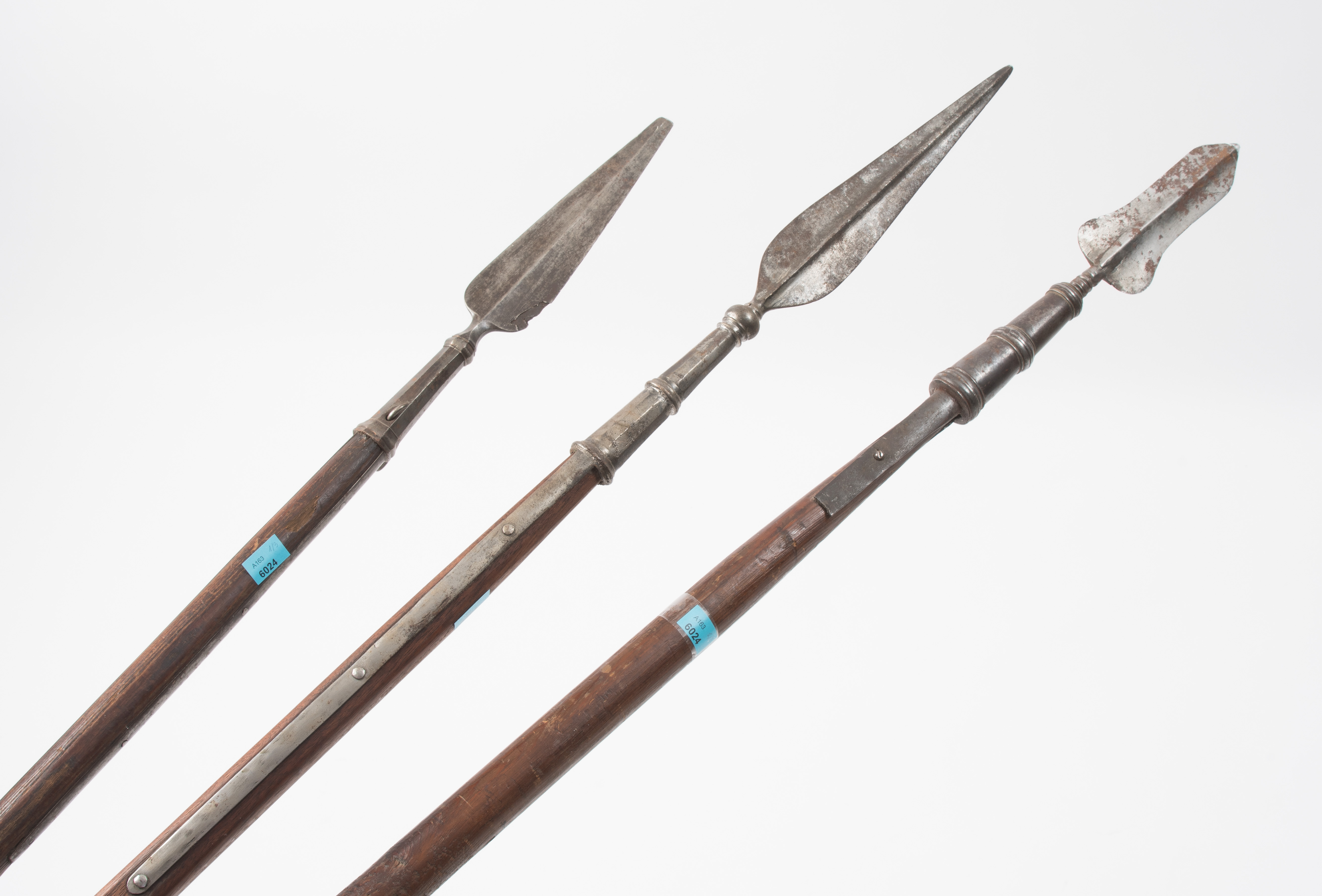 Deutschland / Schweiz, 1. Hälfte 18. Jh. a) Korr. Eisen (L 22 cm) mit abgebrochener Spitze (ca. 1 cm) und verschraubt mit Achtkanttülle. Letztere mit durchgestecktem, S-förmigem Haken. Schaftfedern und originaler Rundschaft mit Standdorn. L ca. 216 cm. b) Korr. Eisen (L 18 cm), verschraubt mit zweifach gegliederter Rundtülle und gekürzten Schaftfedern. Ergänzter Rundschaft. L ca. 246 cm. c) Eisen (L 24 cm) über zweifach gegliederter Oktogonaltülle mit Schaftfedern. Ergänzter Vierkantschaft. L 208 cm.