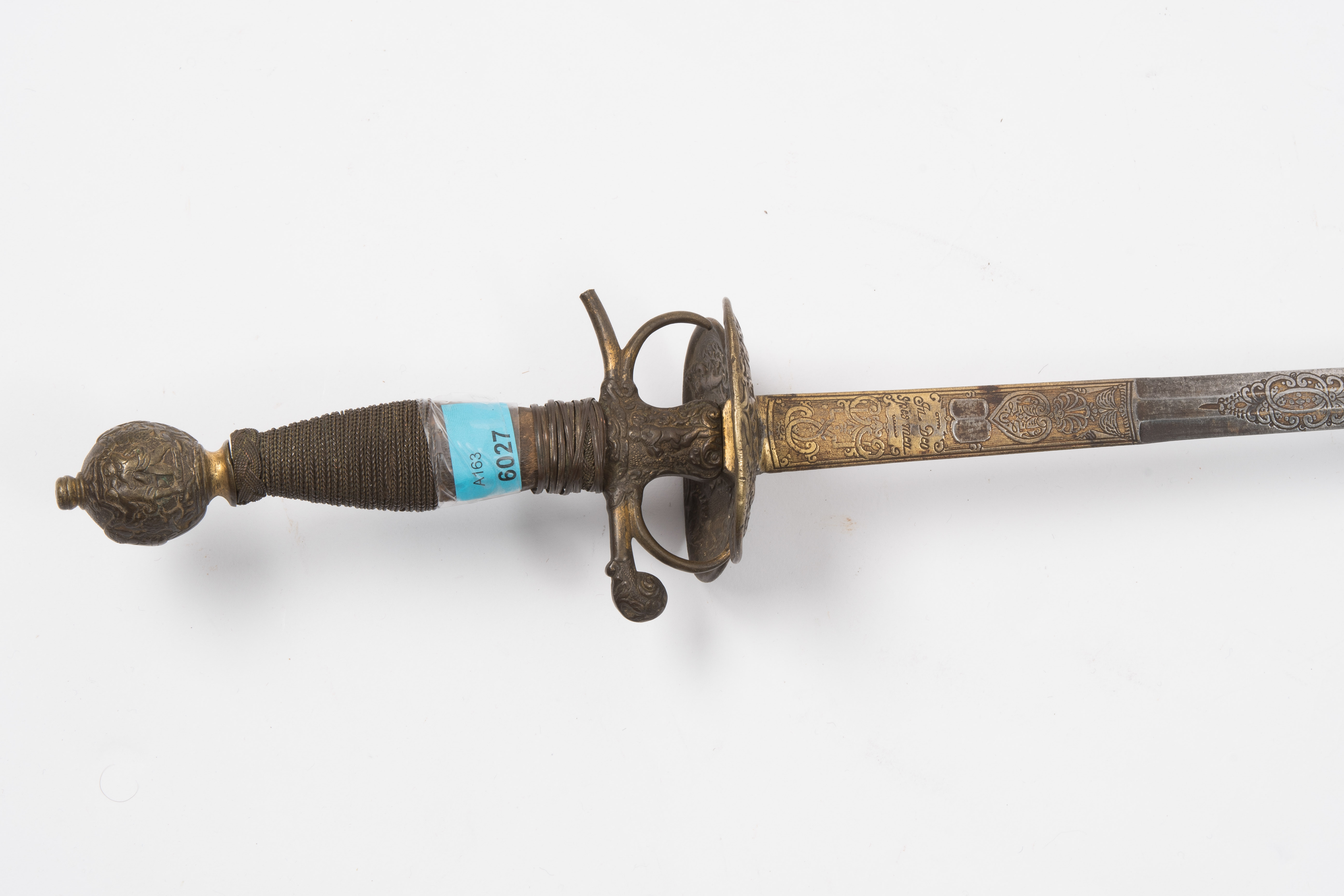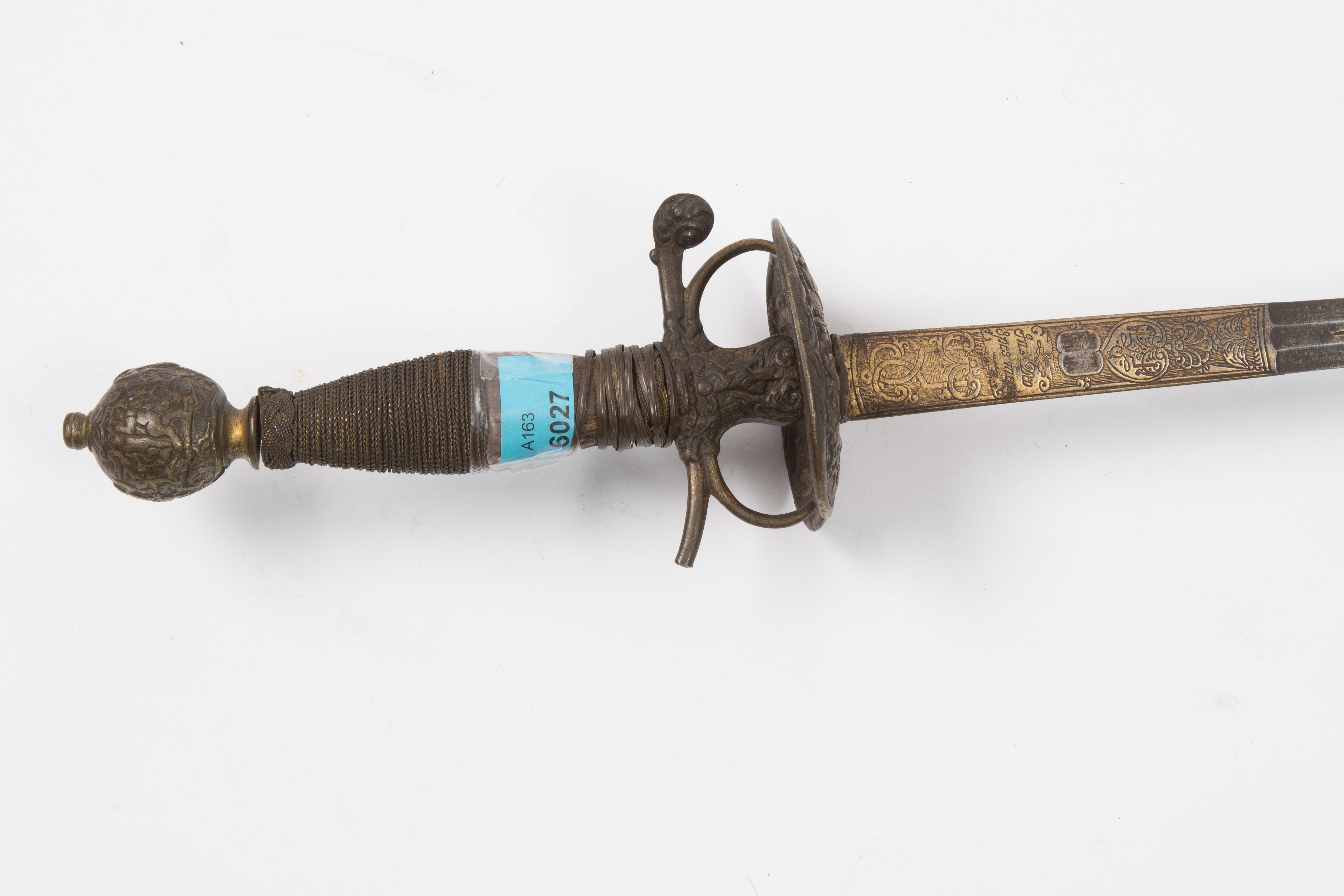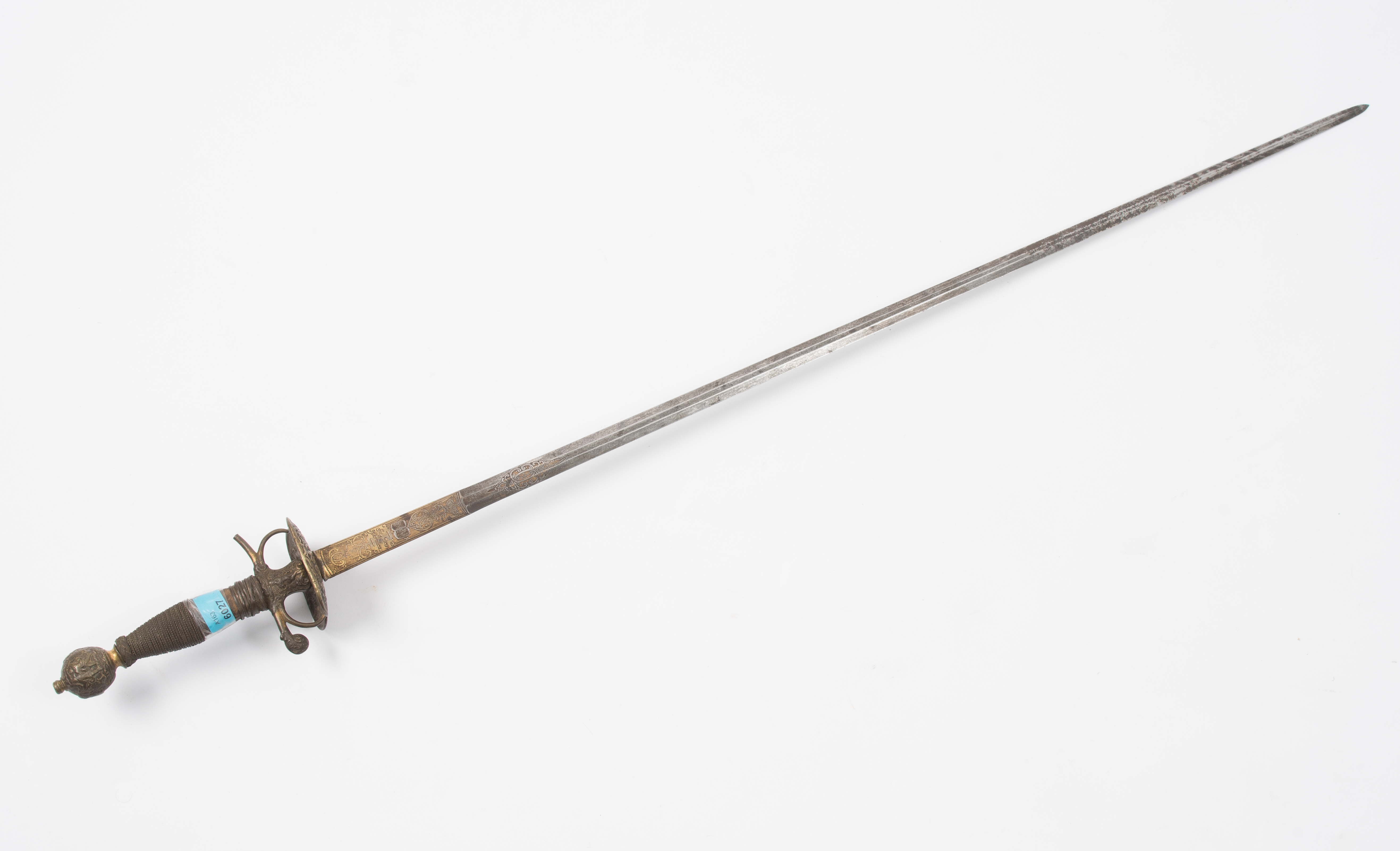 Italien/Deutschland, um 1680. Fragmentiertes und von der Angel gelöstes Messinggefäss mit Resten von Vergoldung. Kugelknauf, Mitteleisen und Stichblatt mit figürlichem und floralem Barock-Dekor. Griffbügel fehlt. Bauchige Hilze mit Türkenbünden und weitgehend abgelöster Drahtwicklung. Dunkel angelaufene bis korr. Stossklinge von hexagonalem Querschnitt mit linsenförmigem Ansatz. Letzterer mit Ranken- und Beschlagwerk graviert und vergoldet. Beidseitig Sinnspruch " In Deo Spes mea" (Auf Gott meine Hoffnung). L 91 cm.