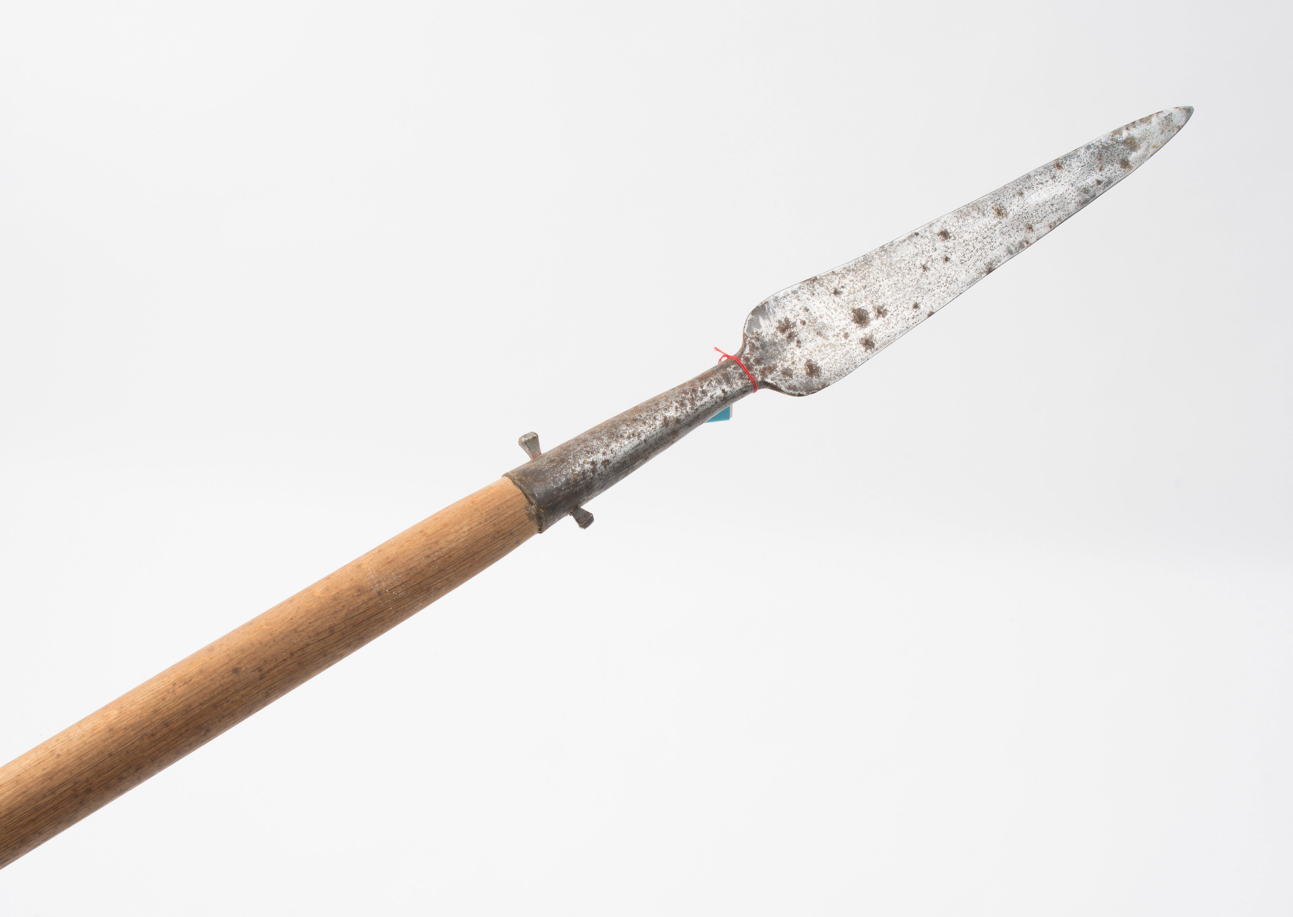 Frankreich, um 1793/94. Korr. Spiesseisen (L 35,5 cm) mit im Schmiedegesenk erzeugtem asymmetrischem Querschnitt. Eine Seite weist einen akzentuierten Mittelgrat auf und ist hohl geschliffen. Die Gegenseite ist plan. Auf der Rundtülle sind die Buchstaben "AN" ("Armée Nationale") eingraviert. Das Klingenblatt und die Tülle weisen stellenweise Reste von Vergoldung, bzw. Goldbemalung auf. In jüngerer Zeit ergänzter Rundschaft mit Standfuss. L ca. 245 cm.