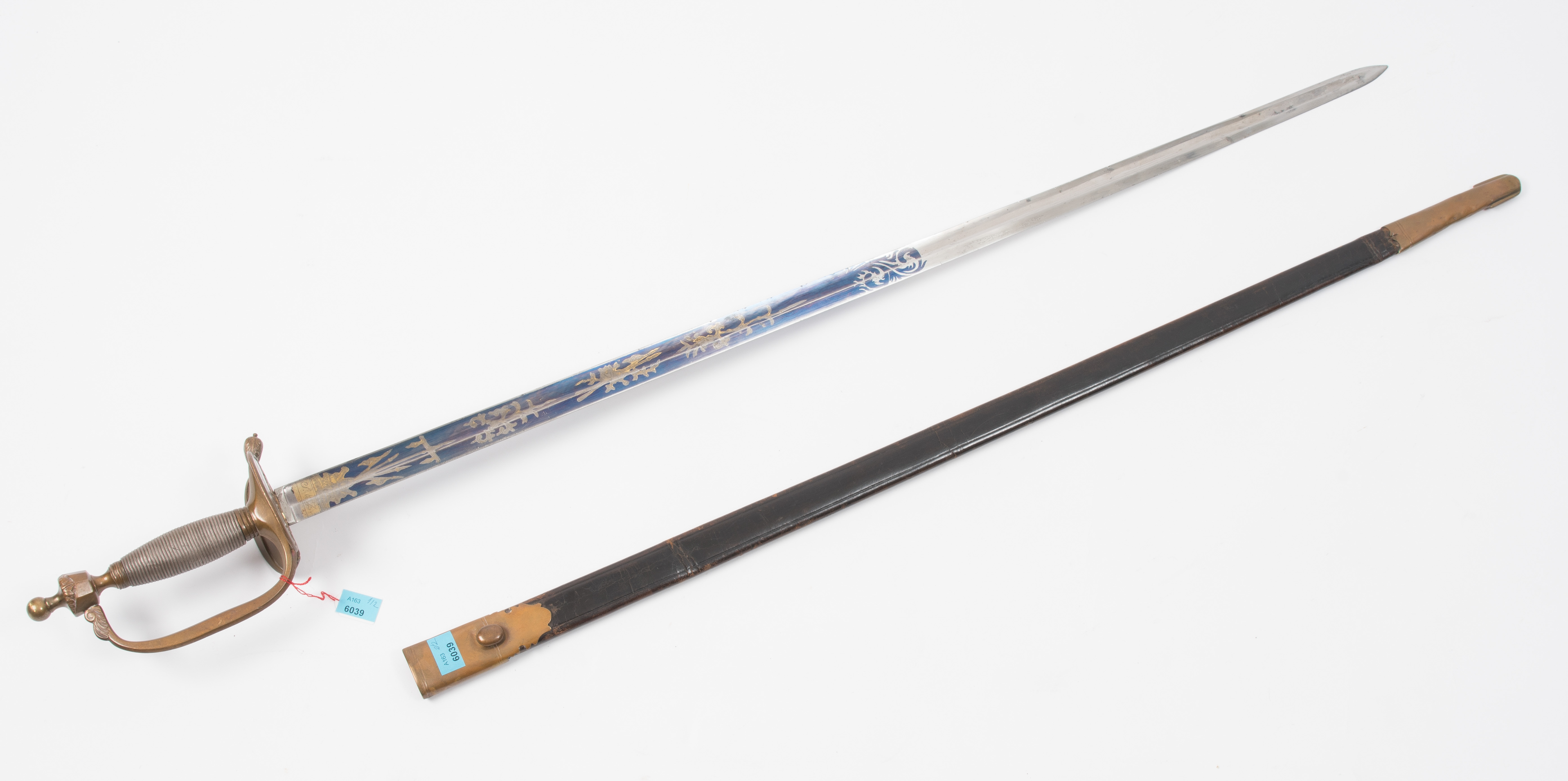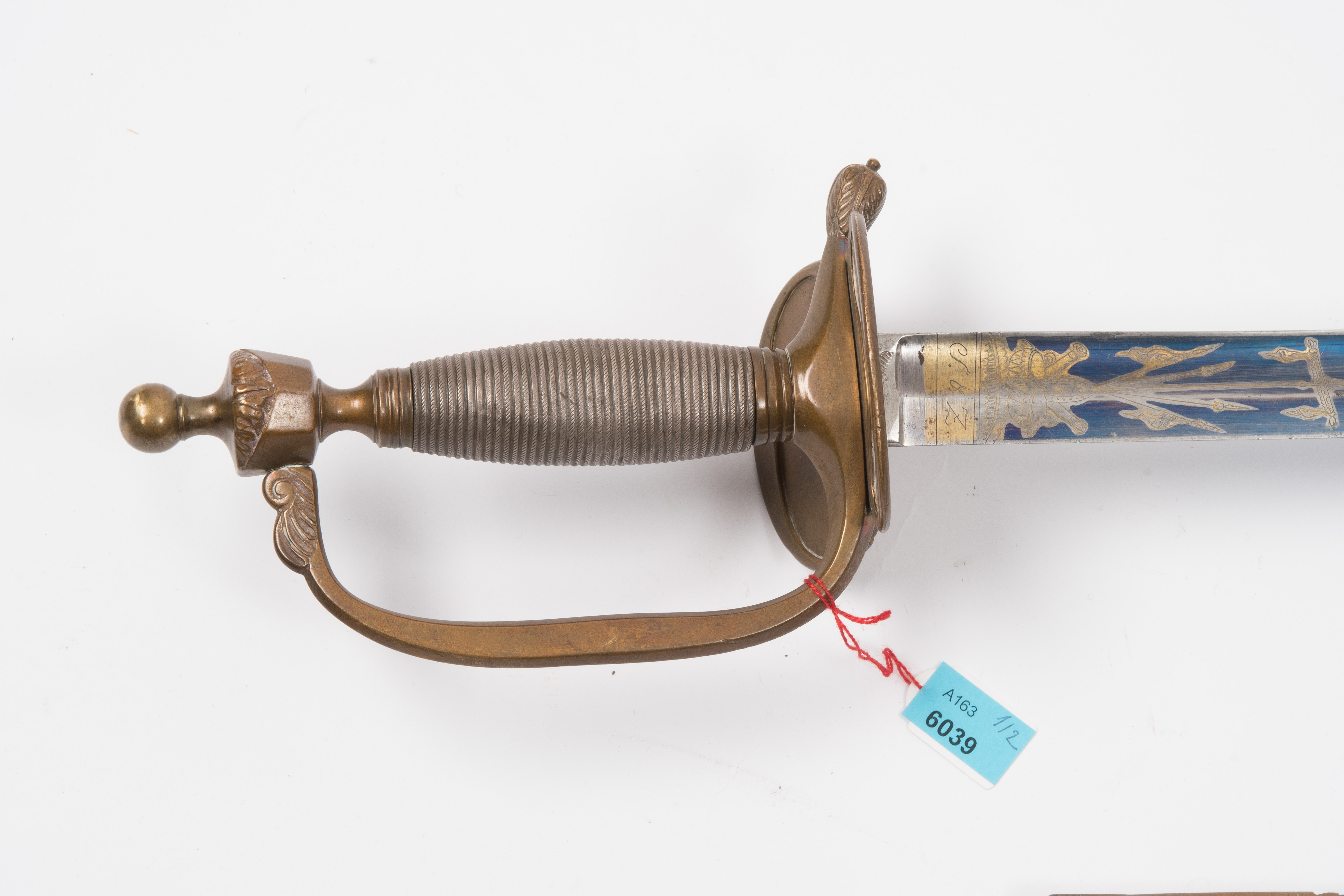 Niederlande, um 1800. Beriebenes, patiniertes Messinggefäss mit zehnfach facettiertem Vasenknauf, Griffbügel und quartseitig abklappbarem Stichblatt. Auf den beiden Seiten desselben gemarkt "L. DROIXHE / AMSTDM". Hilze mit in Form einer Drahtwicklung geprägtem Blechmantel zwischen Messingzwingen. Beidseitig gekehlte Solinger Rückenklinge mit Rückenschneide und Mittelspitze. Am Ansatz die Herstellerbez. "S & Z / Solingen". Bläuung und Vergoldung gut erhalten. Dargestellt sind florale Motive und militärische Trophäen. Schwarze Lederscheide mit Ortband und Mundblech aus patiniertem Messing. L 98 cm.