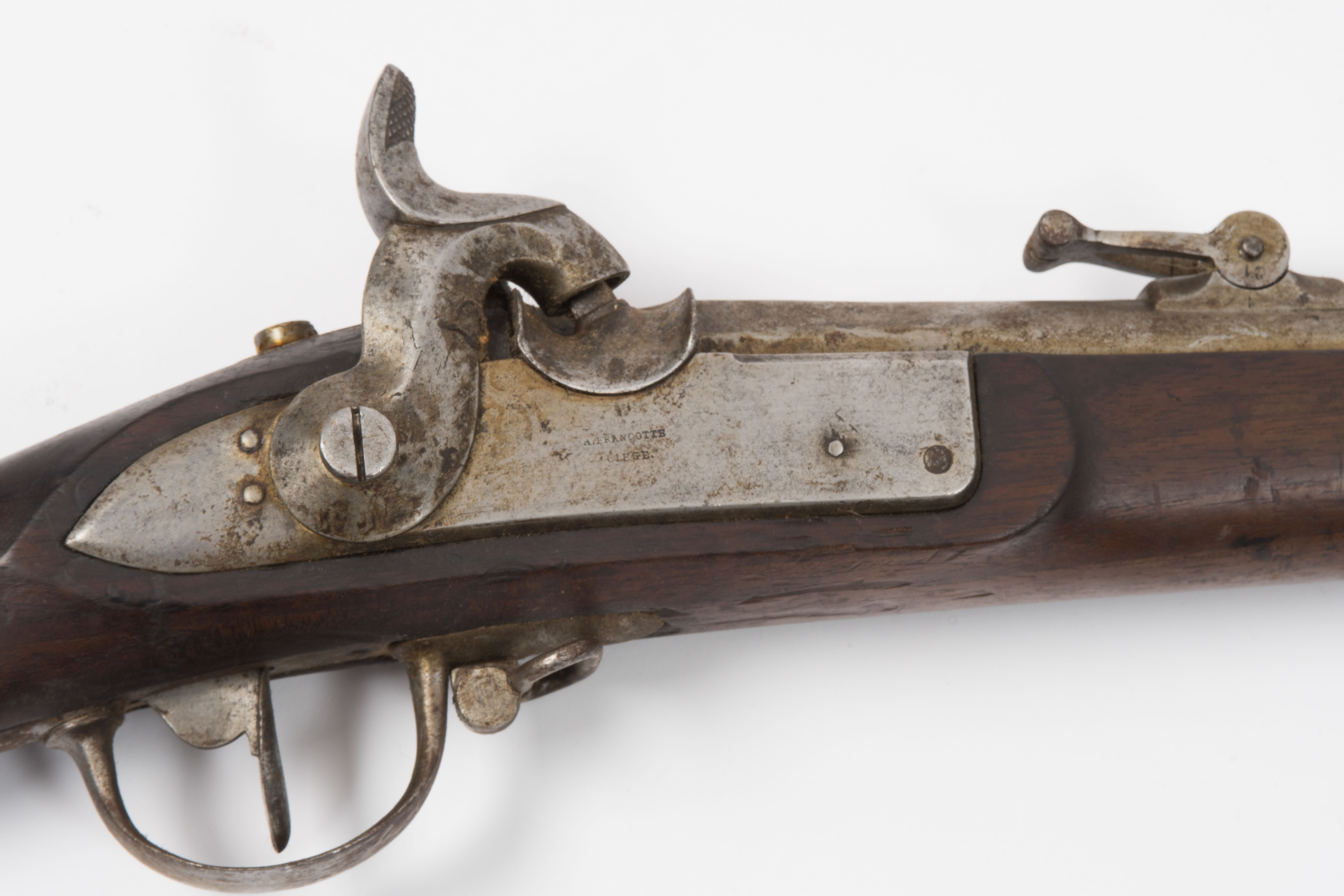 Eidg. Ord. 1842/59, Kt. Thurgau. Infanteriegewehr, Kal. 18 mm, Waffennr. TH 4040 zweimal am Lauf, der zudem mit "Th in Wappenschild" und der Herstellerbez. "A. FRANCOTTE LIÈGE" markiert ist. Schlossplatte bez. "A. FRANCOTTE LIÈGE". Verschmutzte und bereichsweise korr. Eisengarnitur. Nussbaum-Vollschaft mit Waffennr. 4040 und Stempel "CT" in Oval. Mit Eisenladestock. Restaurationswürdige Thurgauer Waffe in ungereinigtem Fundzustand. L 144 cm.