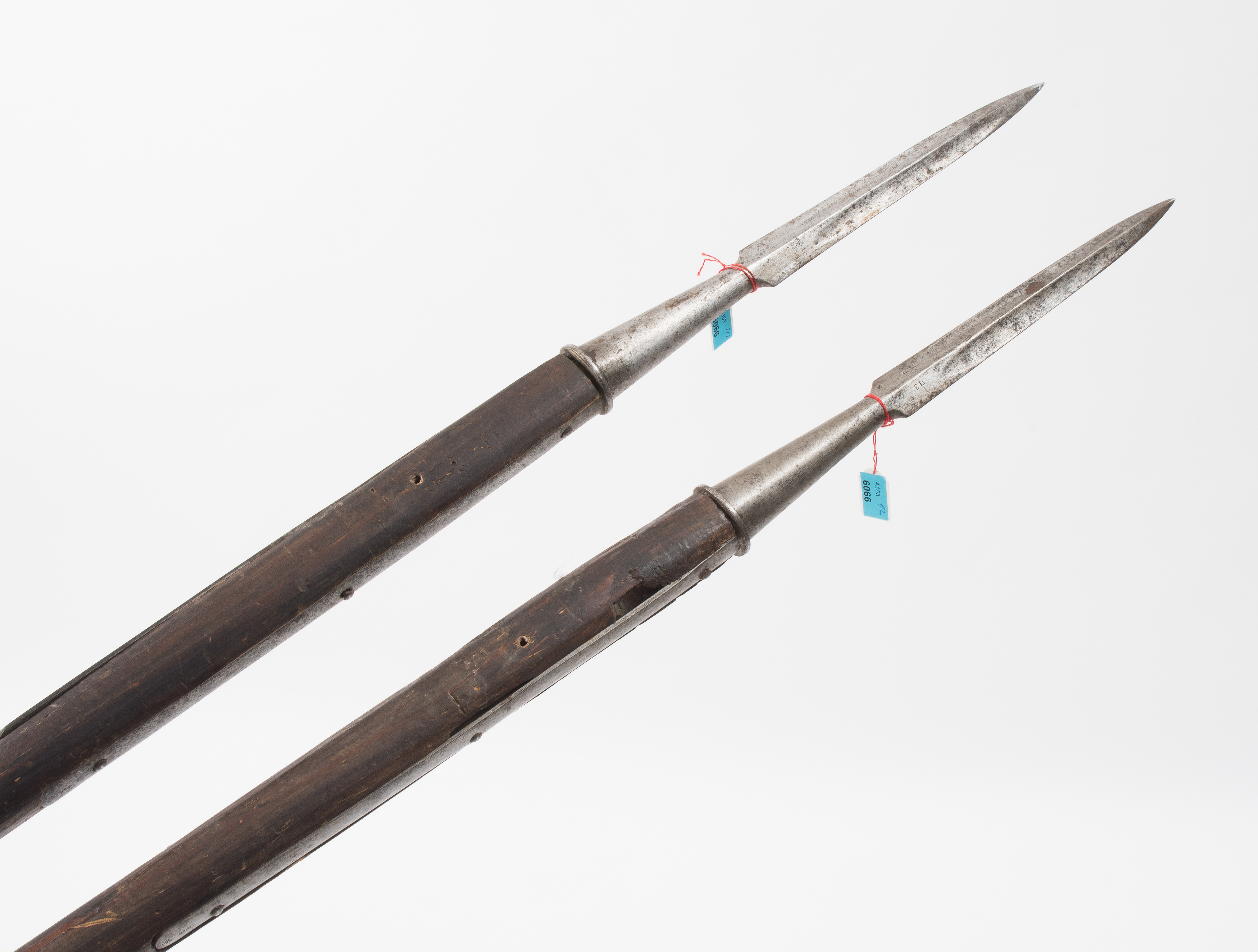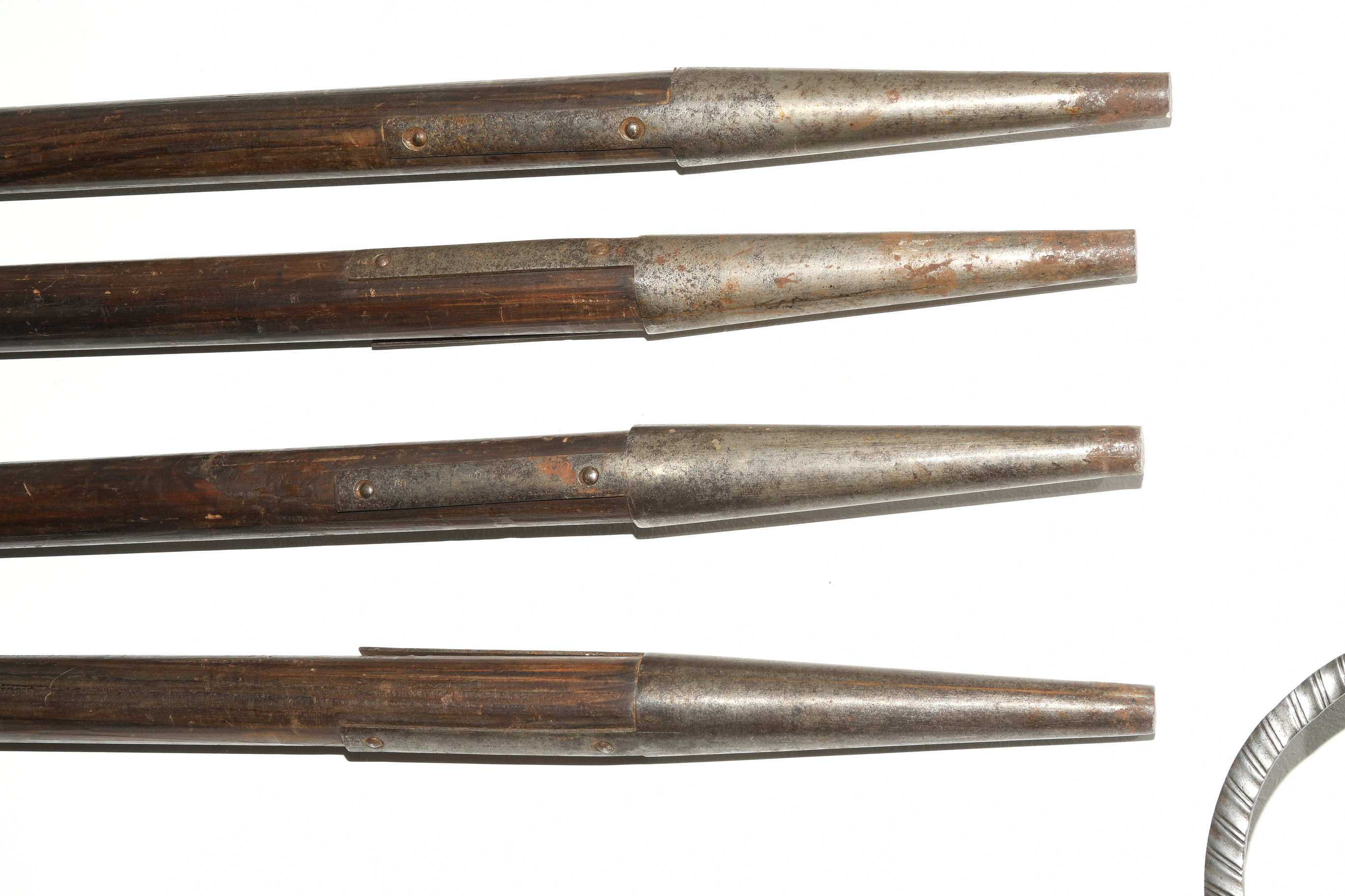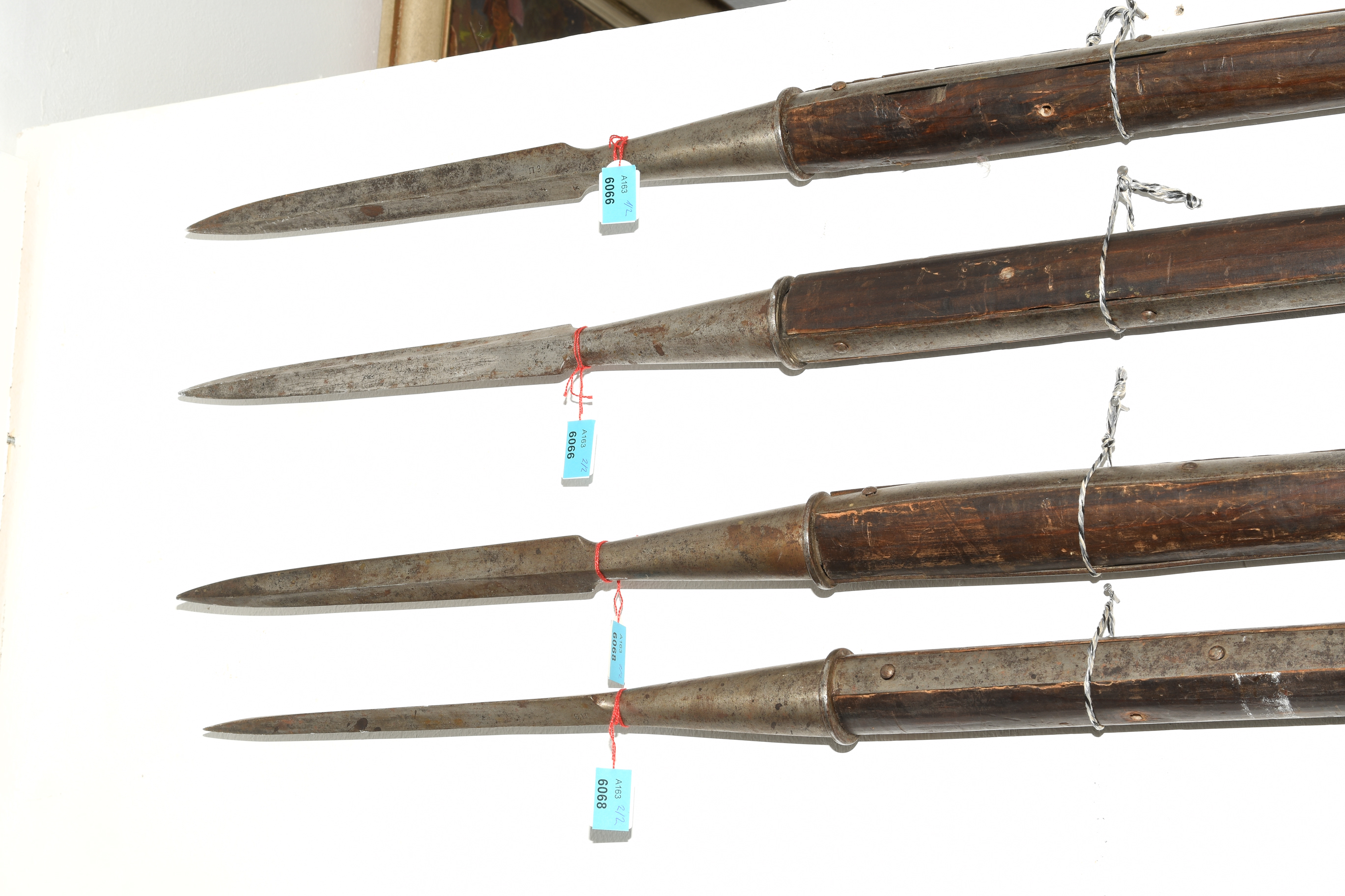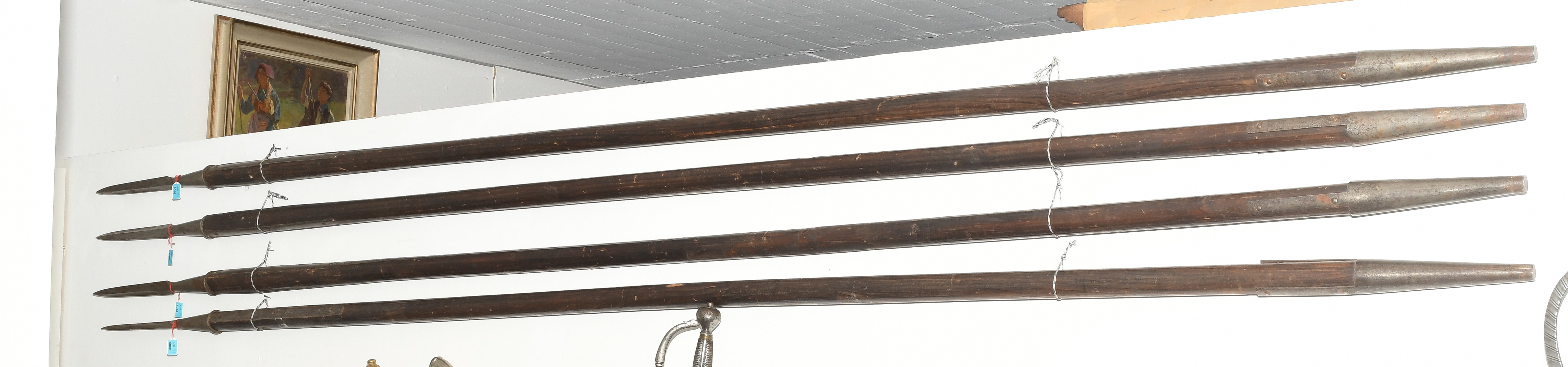 Russland, datiert 1846. Eisen (L 21,5 cm) über Rundtüllen mit Schaftfedern. Auf letzteren die Datierung über Abnahmestempel "B". Hohl geschliffene Vierkantspitzen mit Abnahmestempeln und kyrillischen Buchstaben "K" und "p3". Originale Rundschäfte mit konischen Standfüssen. L ca. 240 cm.