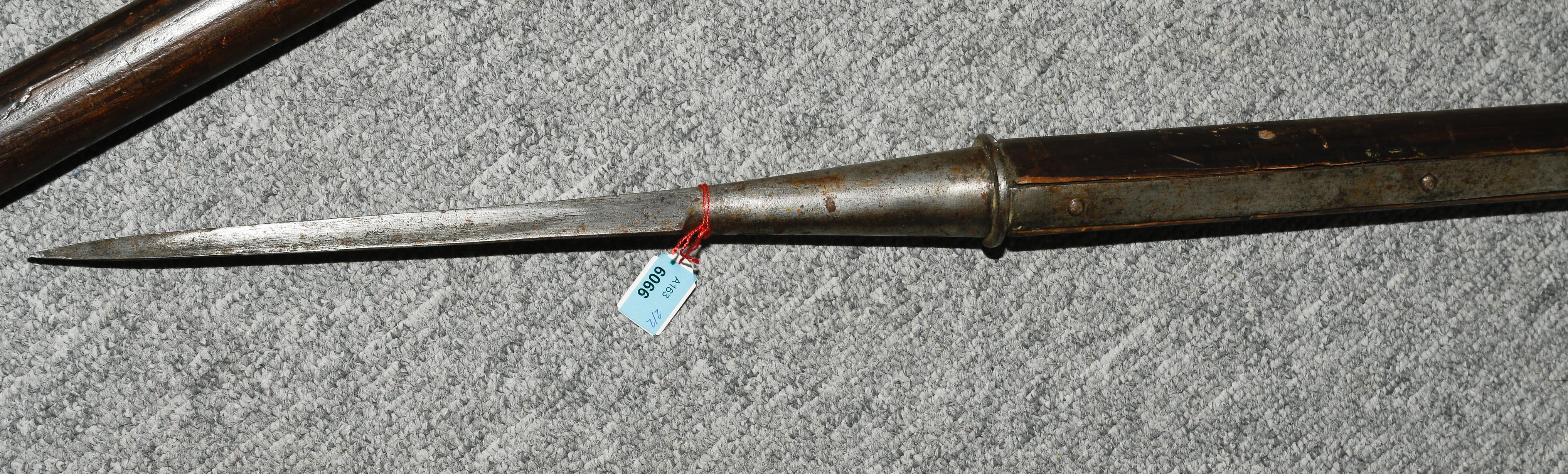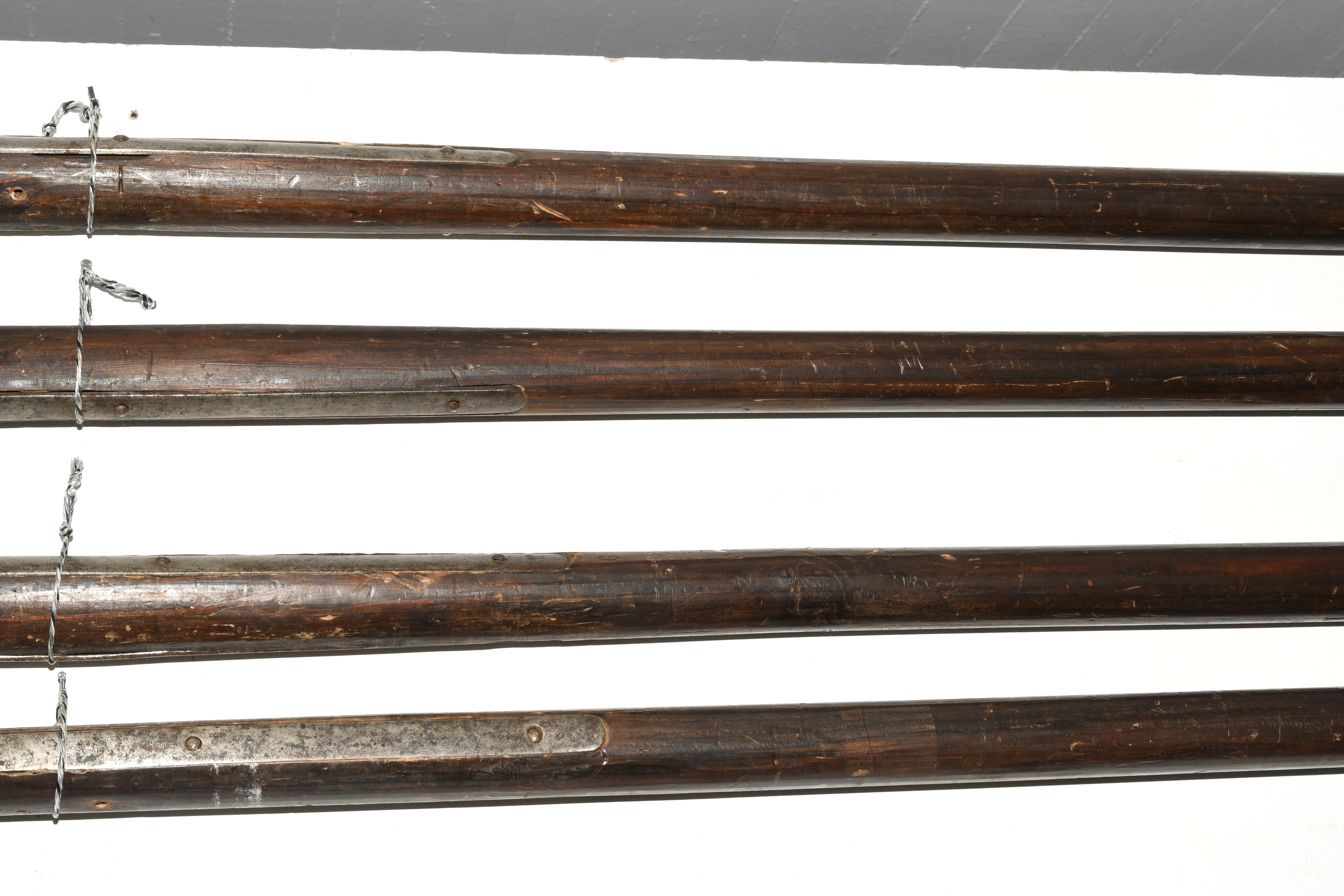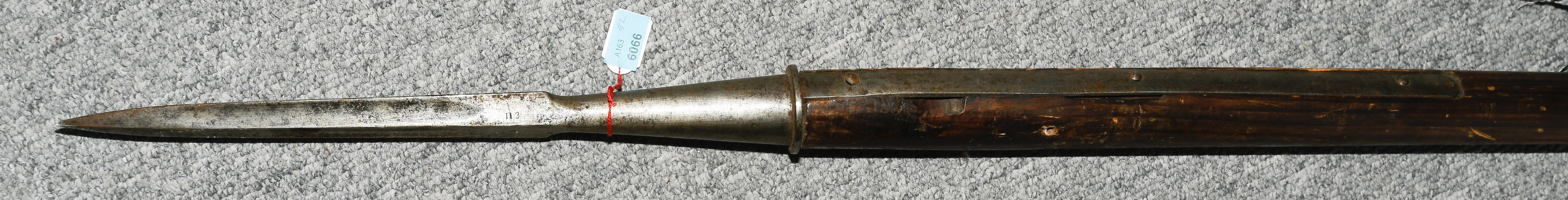 Russland, datiert 1846. Eisen (L 21,5 cm) über Rundtüllen mit Schaftfedern. Auf letzteren die Datierung über Abnahmestempel "B". Hohl geschliffene Vierkantspitzen mit Abnahmestempeln und kyrillischen Buchstaben "K" und "p3". Originale Rundschäfte mit konischen Standfüssen. L ca. 240 cm.