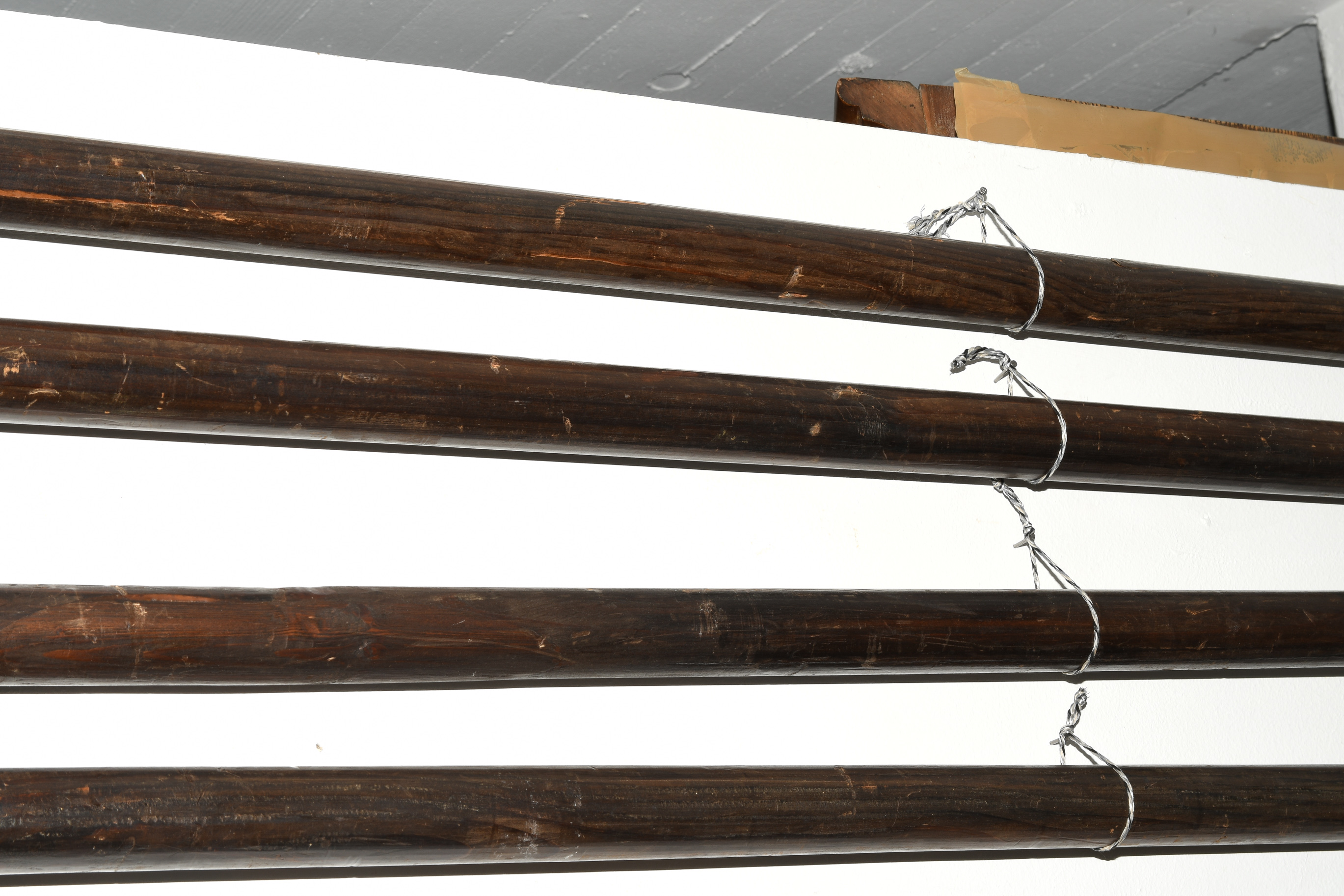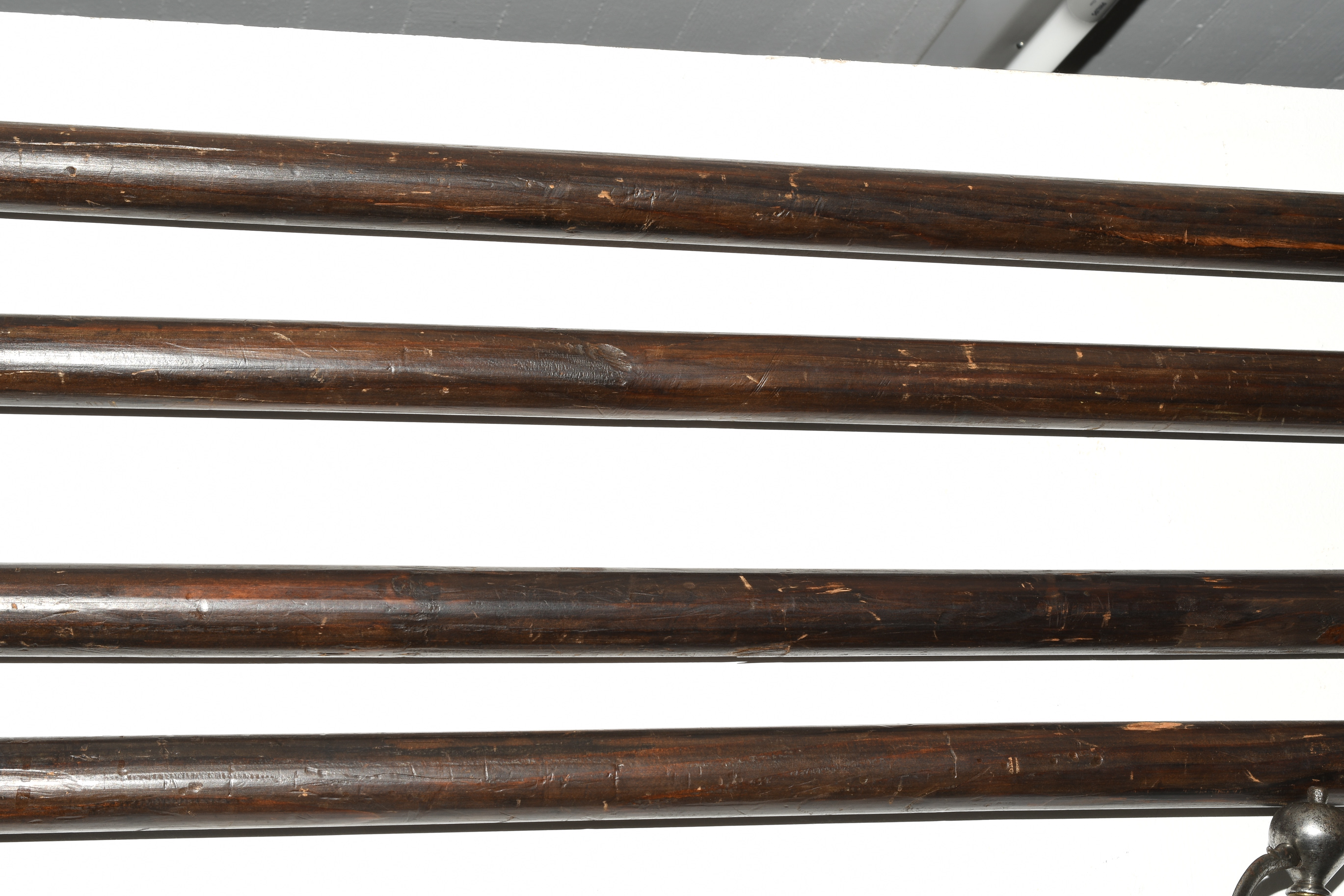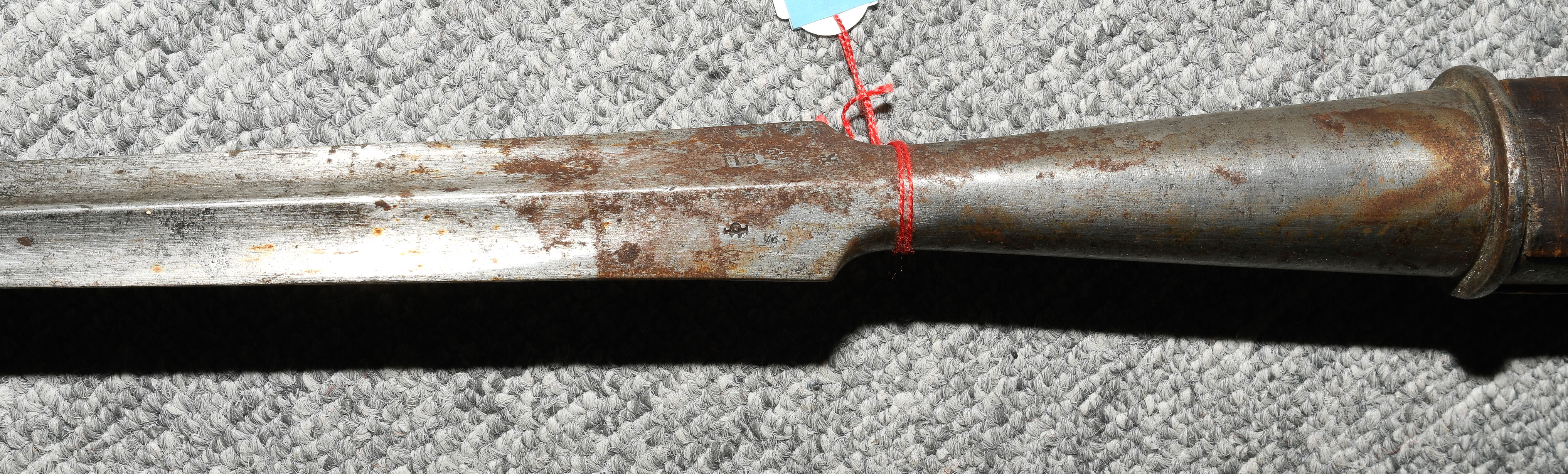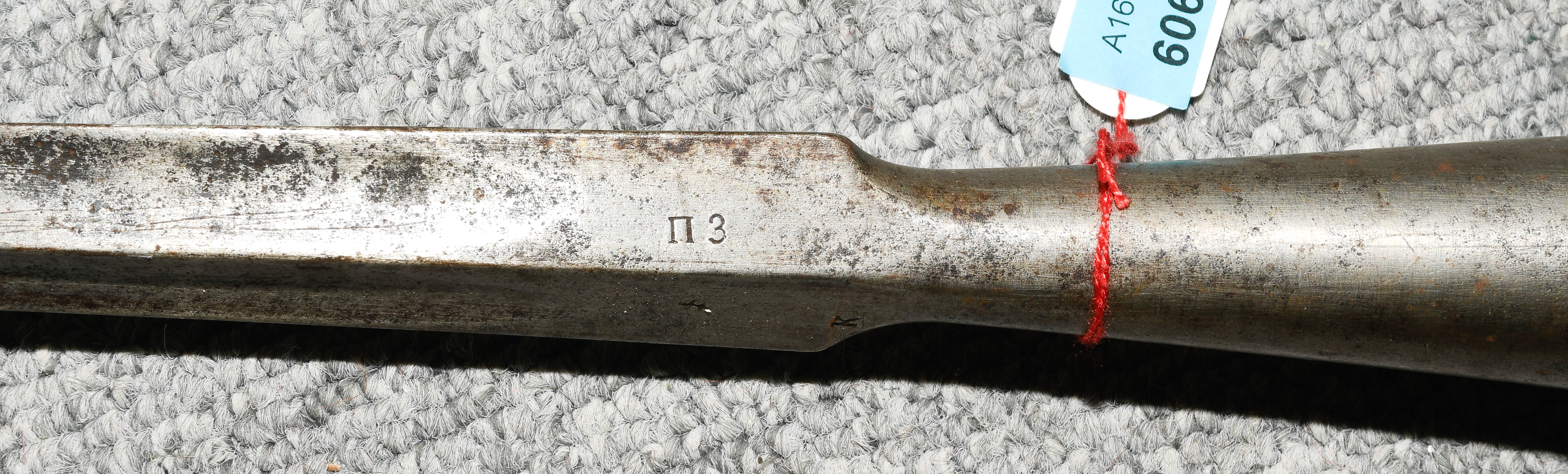 Russland, datiert 1846. Eisen (L 21,5 cm) über Rundtüllen mit Schaftfedern. Auf letzteren die Datierung über Abnahmestempel "B". Hohl geschliffene Vierkantspitzen mit Abnahmestempeln und kyrillischen Buchstaben "K" und "p3". Originale Rundschäfte mit konischen Standfüssen. L ca. 240 cm.