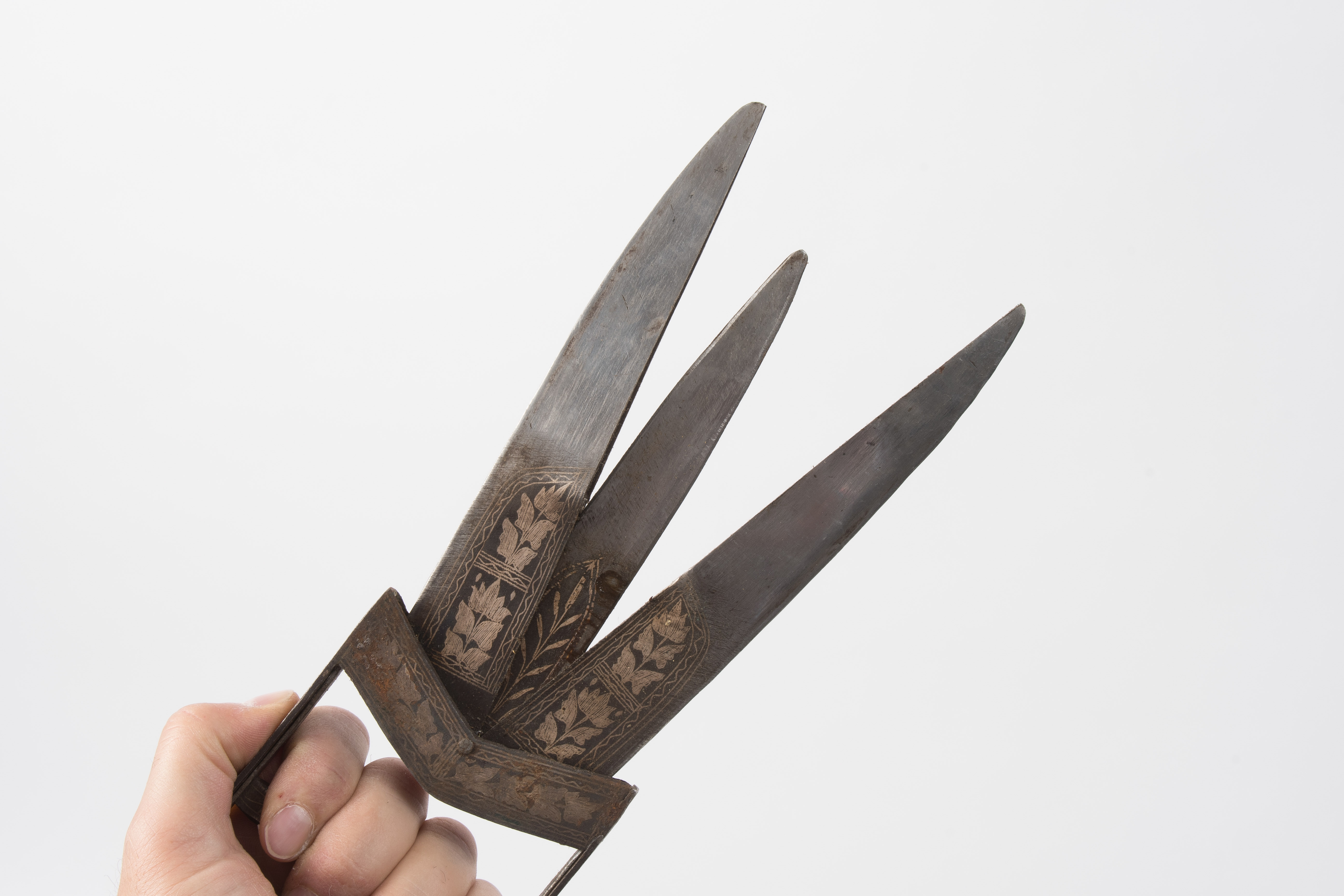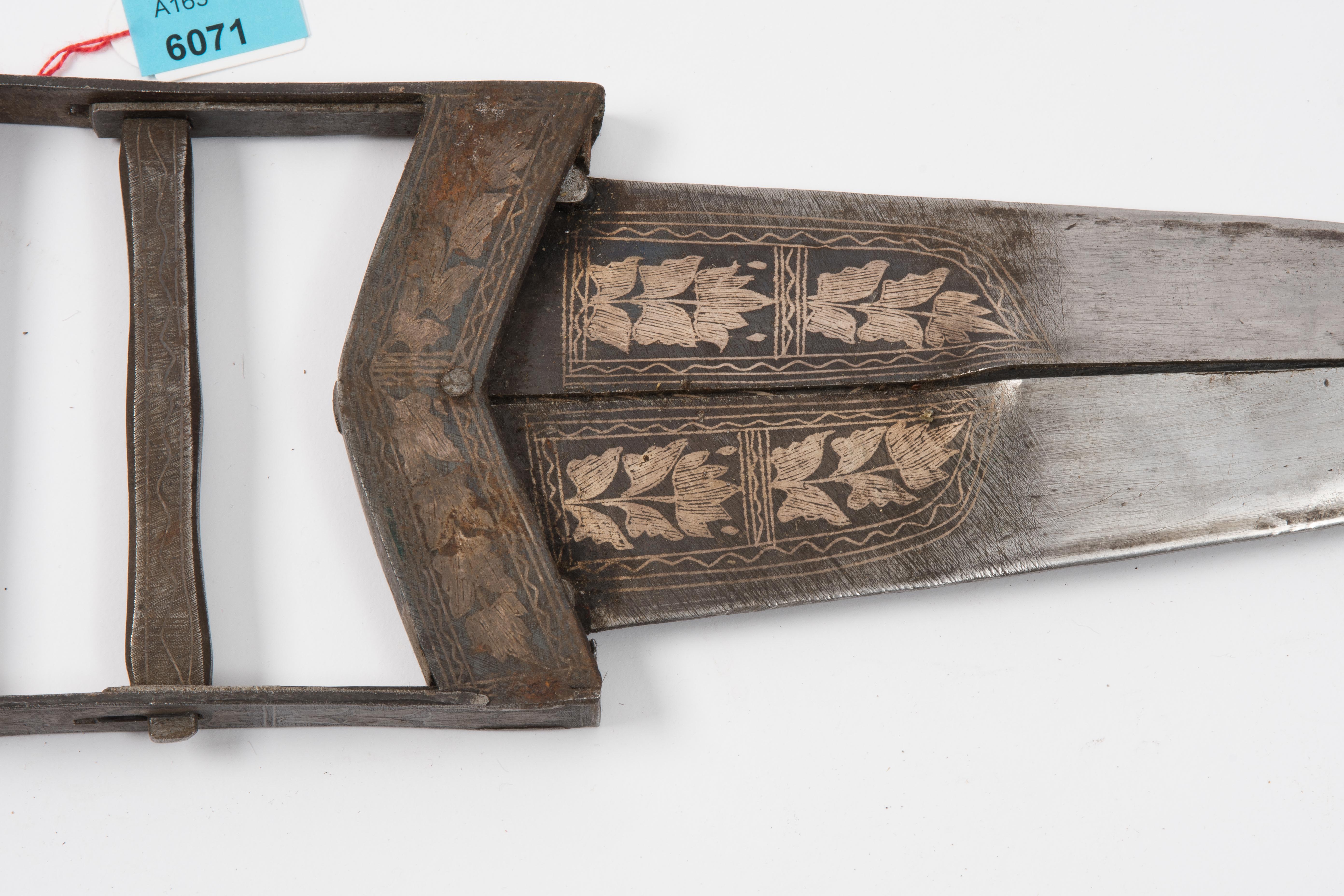 Indien, 19. Jh. Korr., floral in Silberkoftgari dekoriertes Eisengefäss mit zwei Griffstegen und etwas schwergängigem Federmechanismus. Aufklappbare Klingenfängerklinge mit silberkoftgariverziertem Ansatz und befeilter Mittelklinge. Schwarze Lederscheide. L 40 cm.