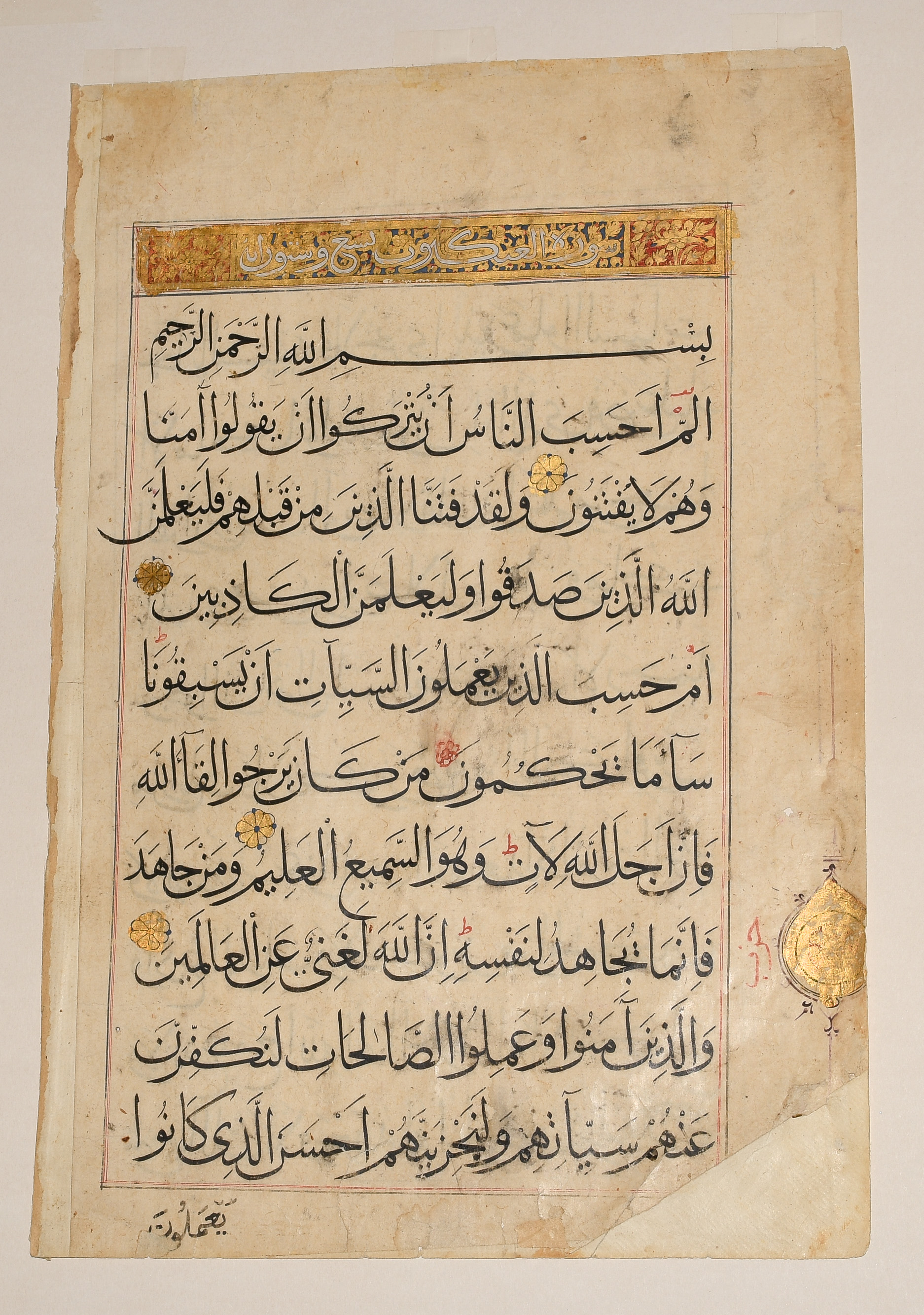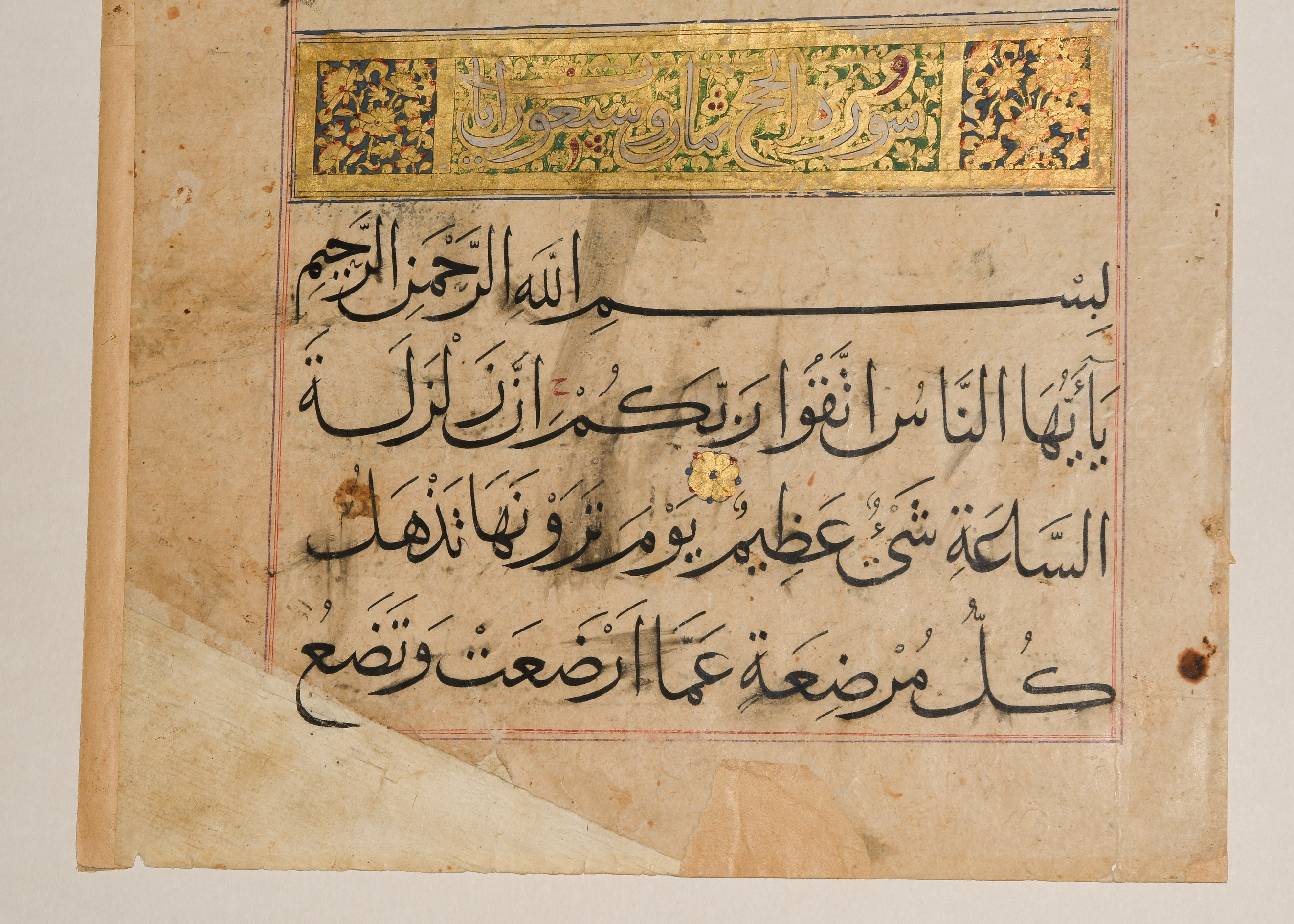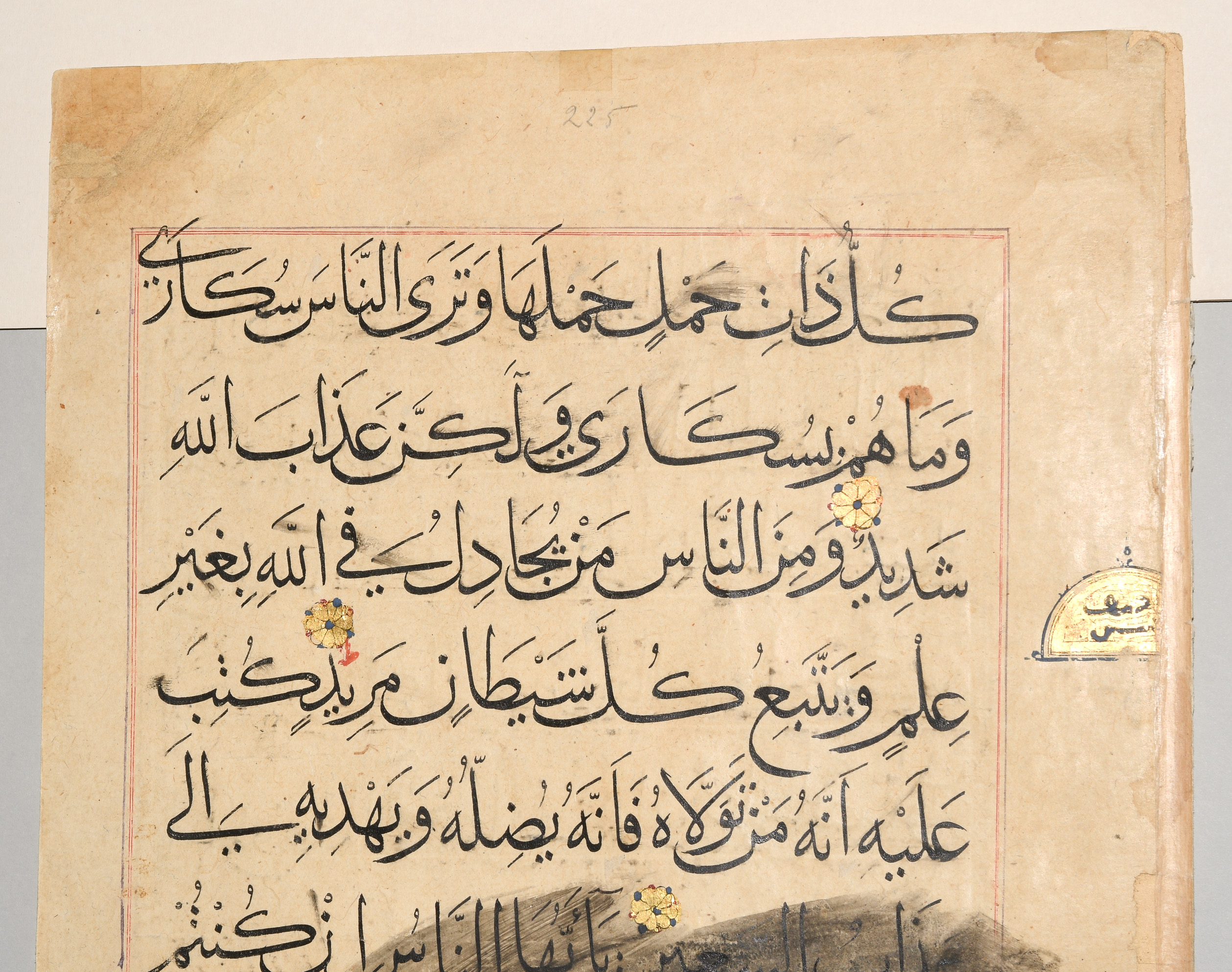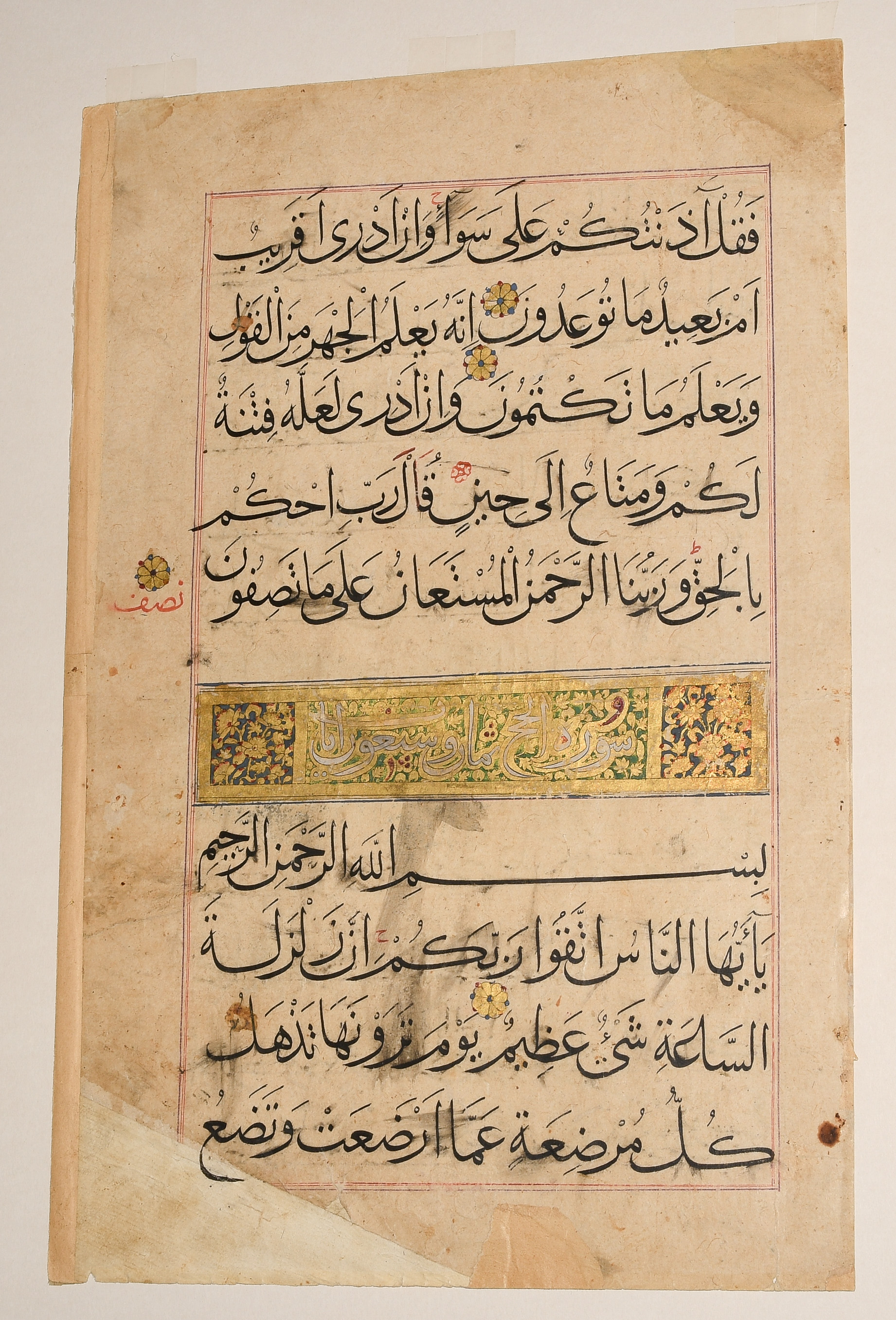 Arabische Koranverse. Tusche, Gold und Deckfarben auf Papier. Ca. 40x27 (Lichtmass), gerahmt 57,5x42,5 cm. - Papier ergänzt. Alters- und Gebrauchspuren.