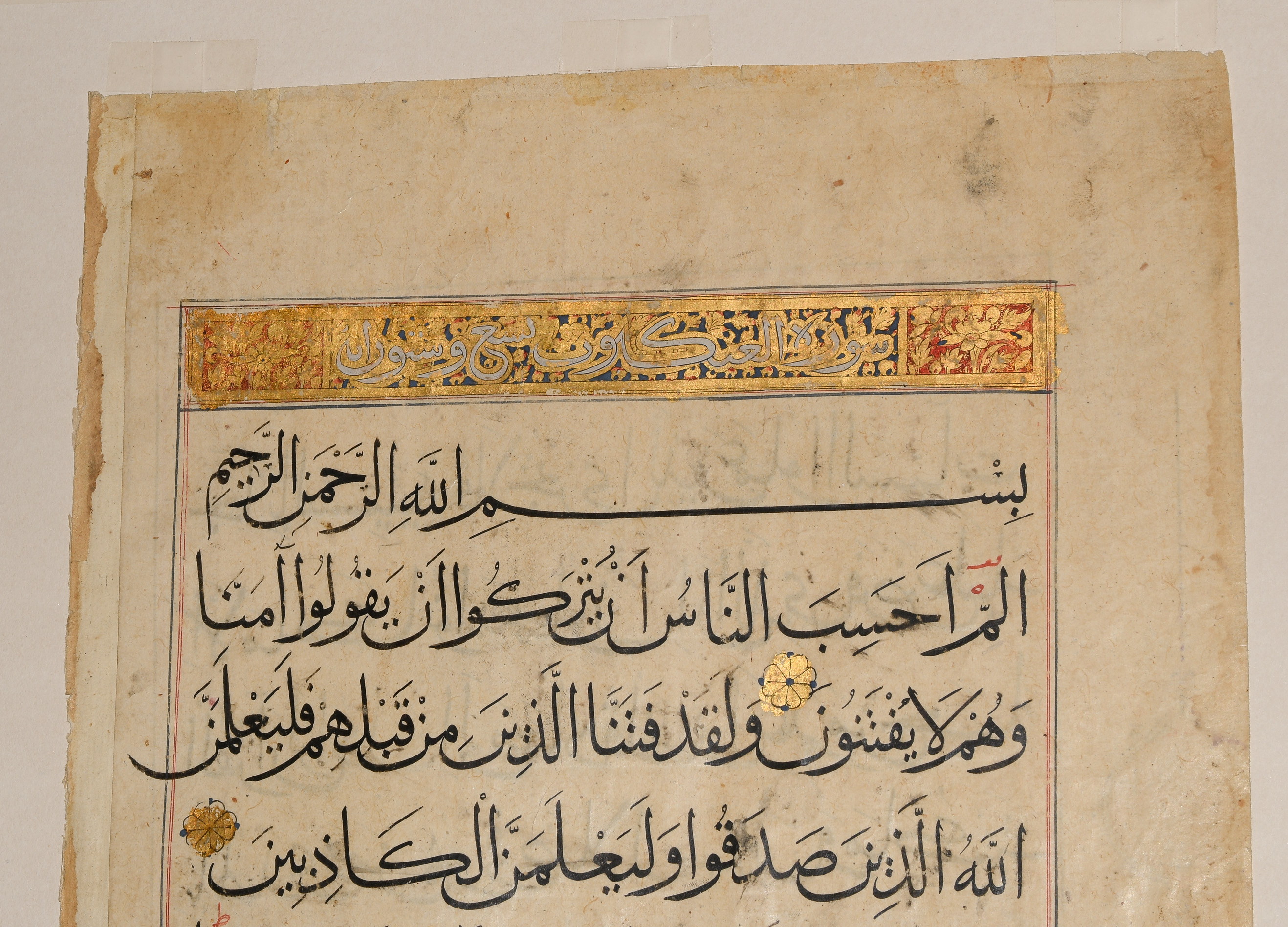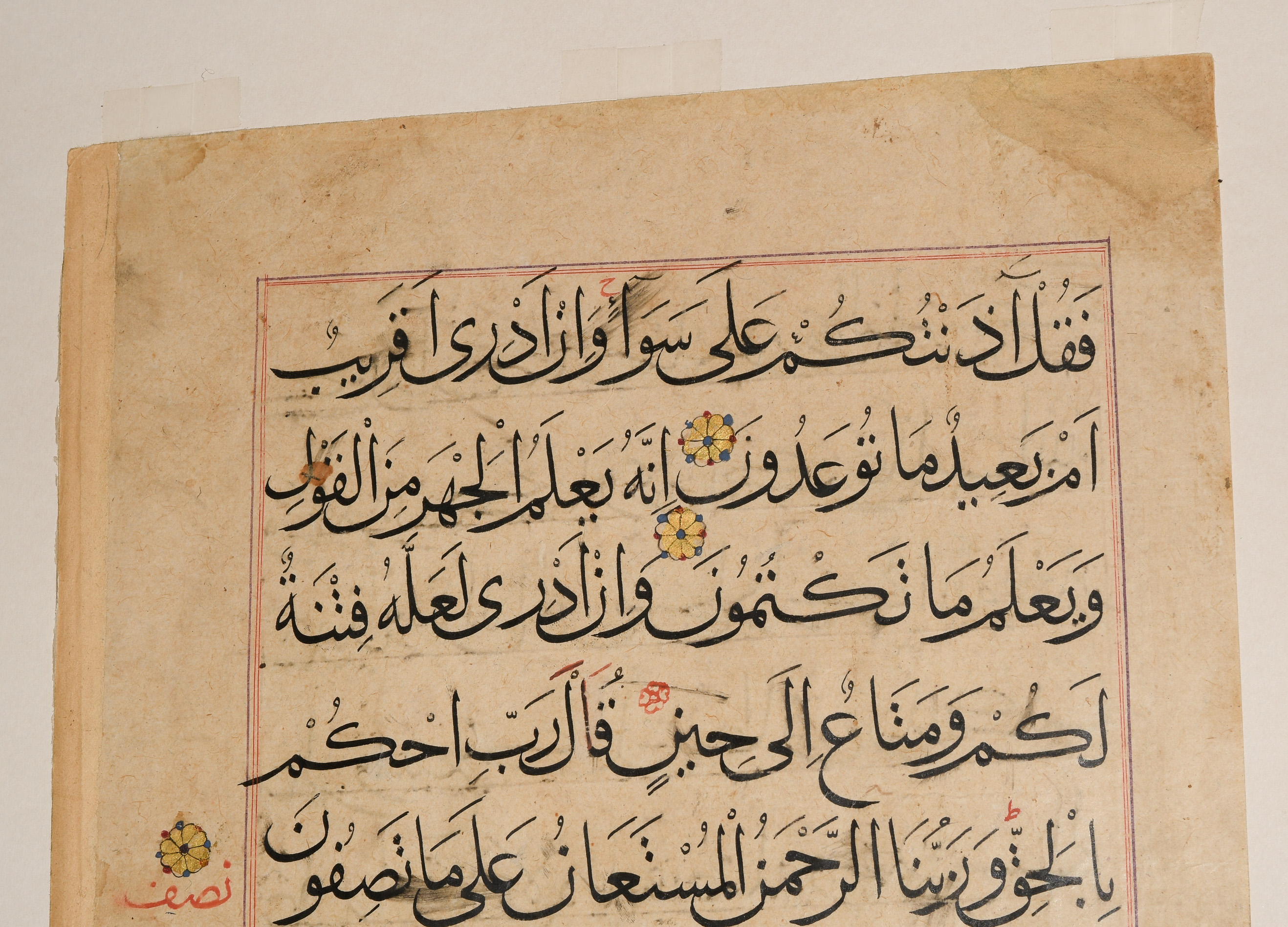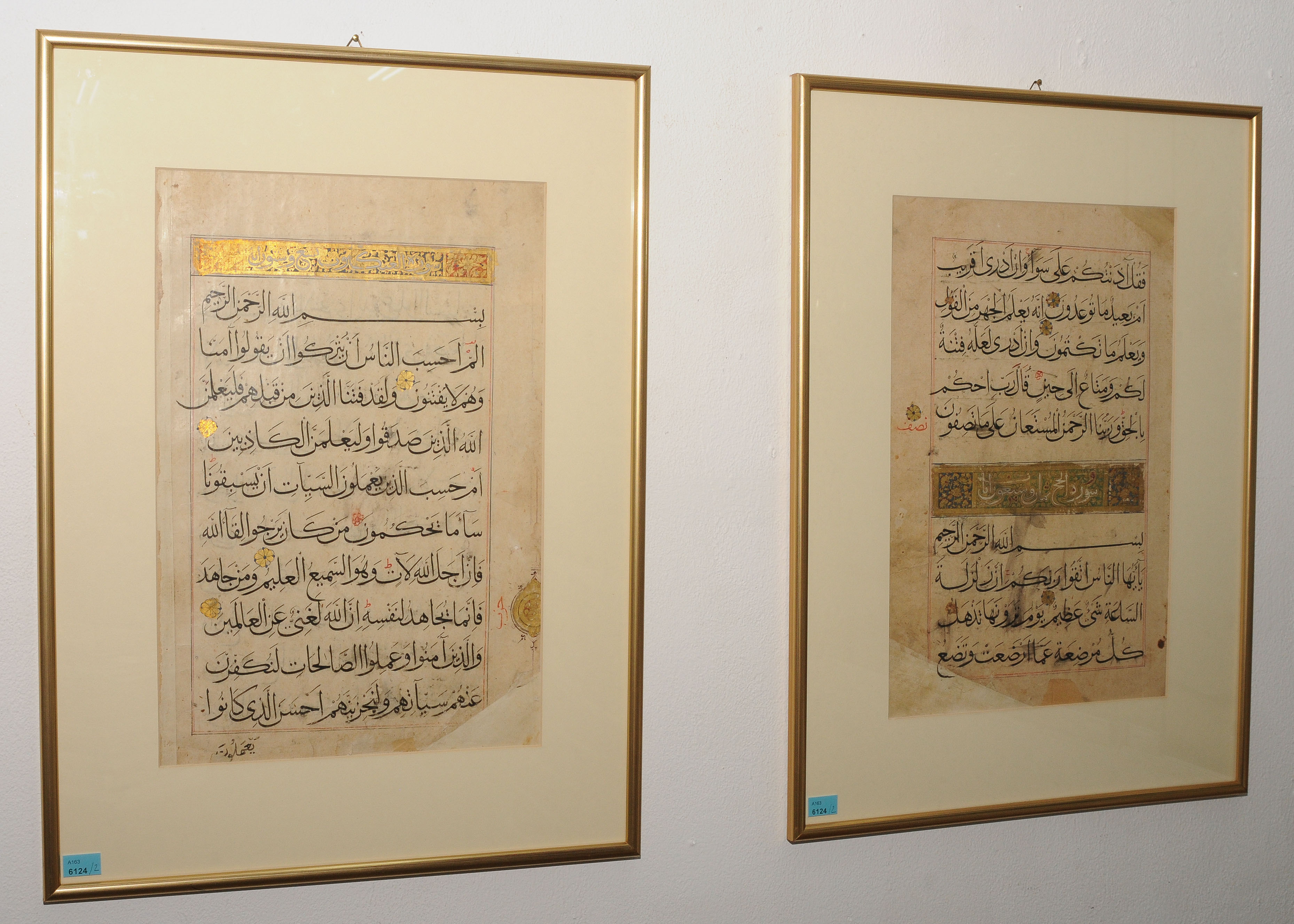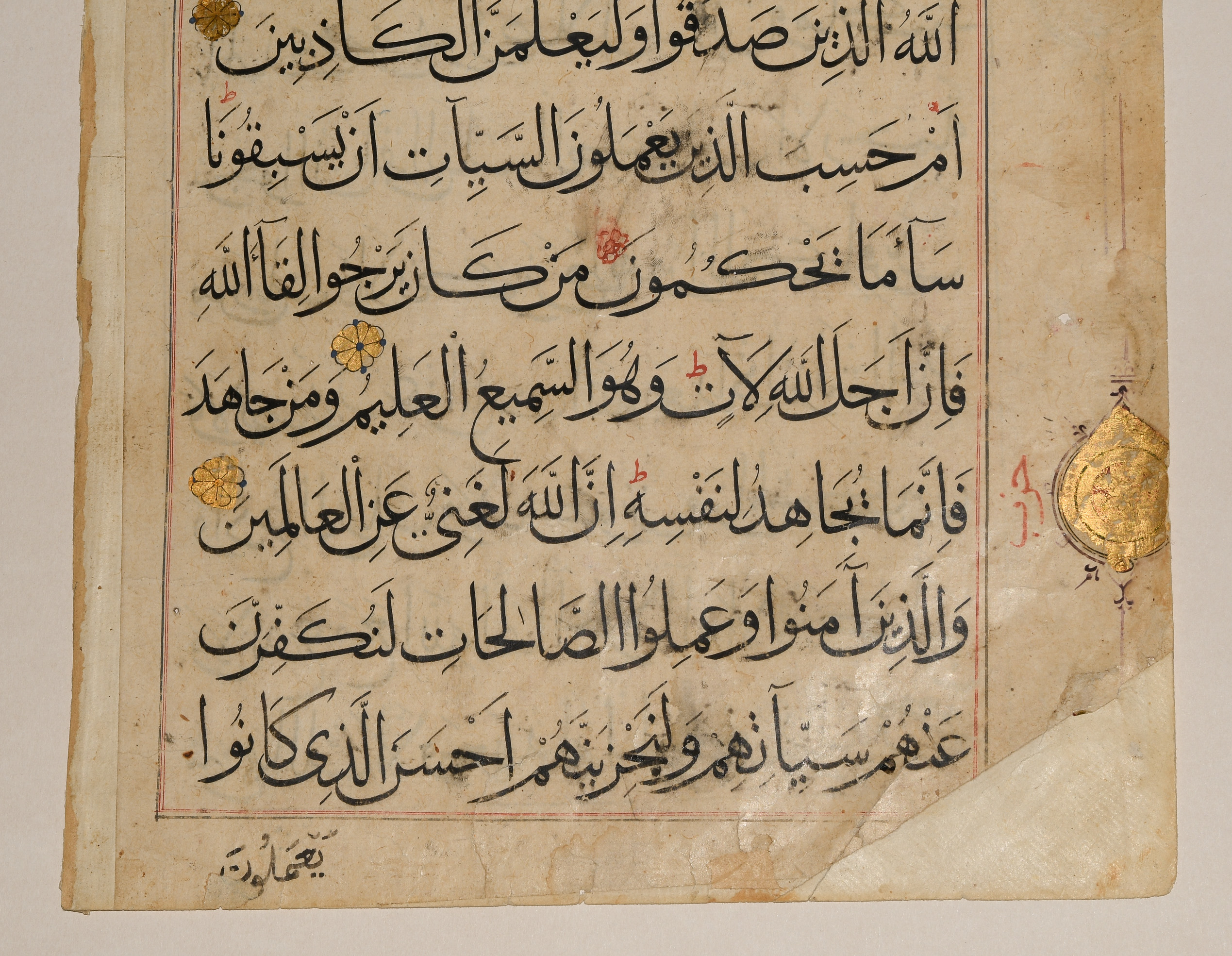 Arabische Koranverse. Tusche, Gold und Deckfarben auf Papier. Ca. 40x27 (Lichtmass), gerahmt 57,5x42,5 cm. - Papier ergänzt. Alters- und Gebrauchspuren.